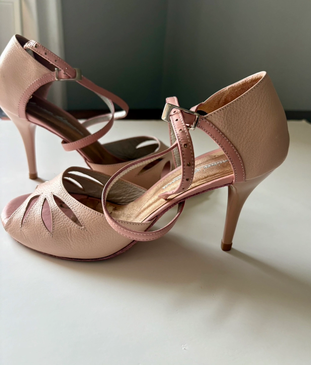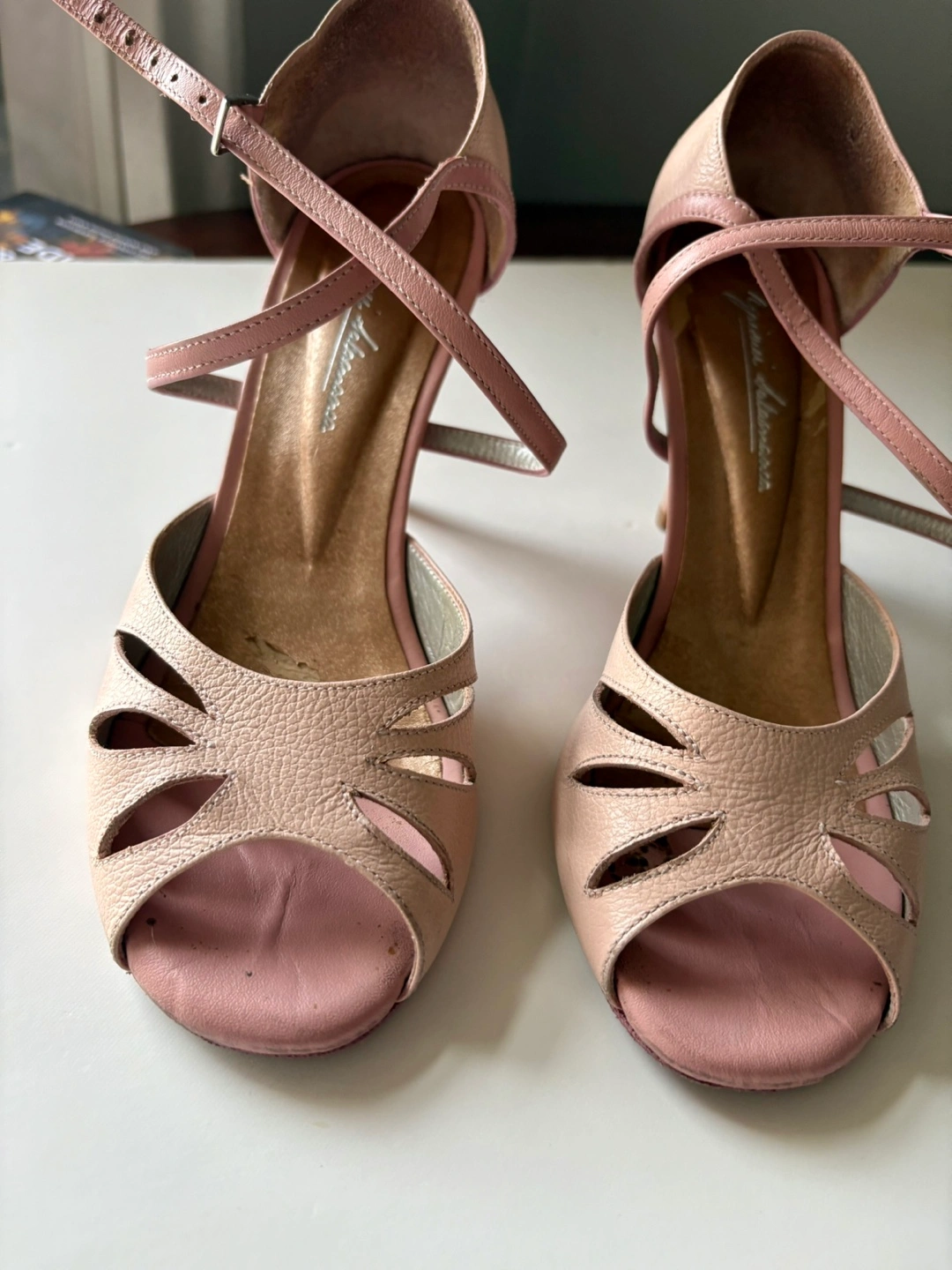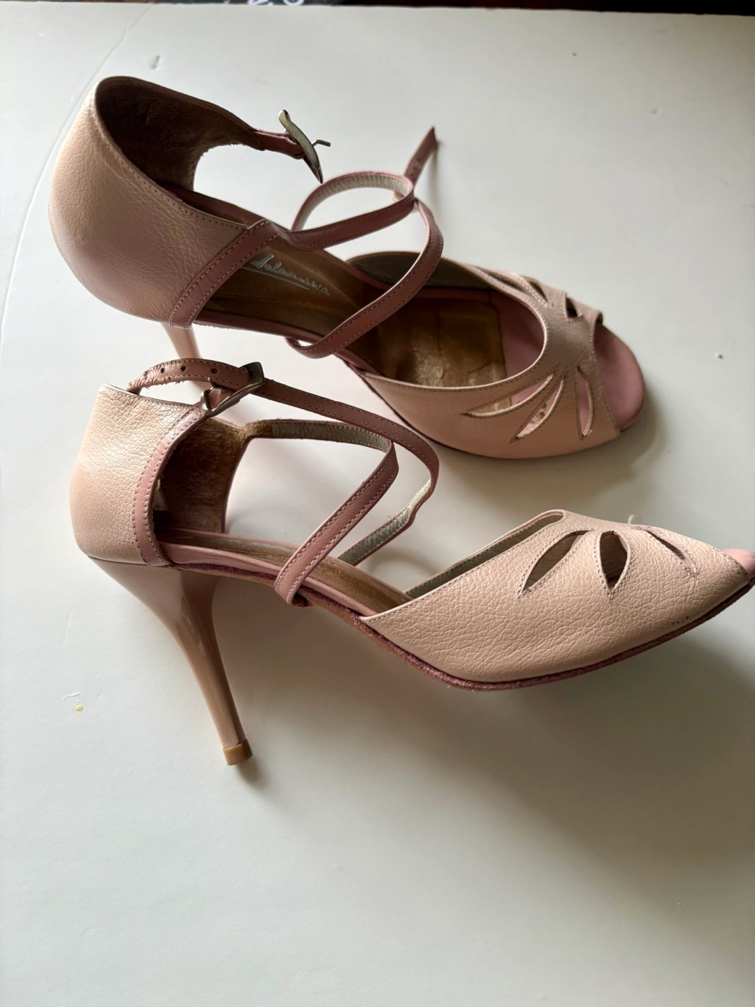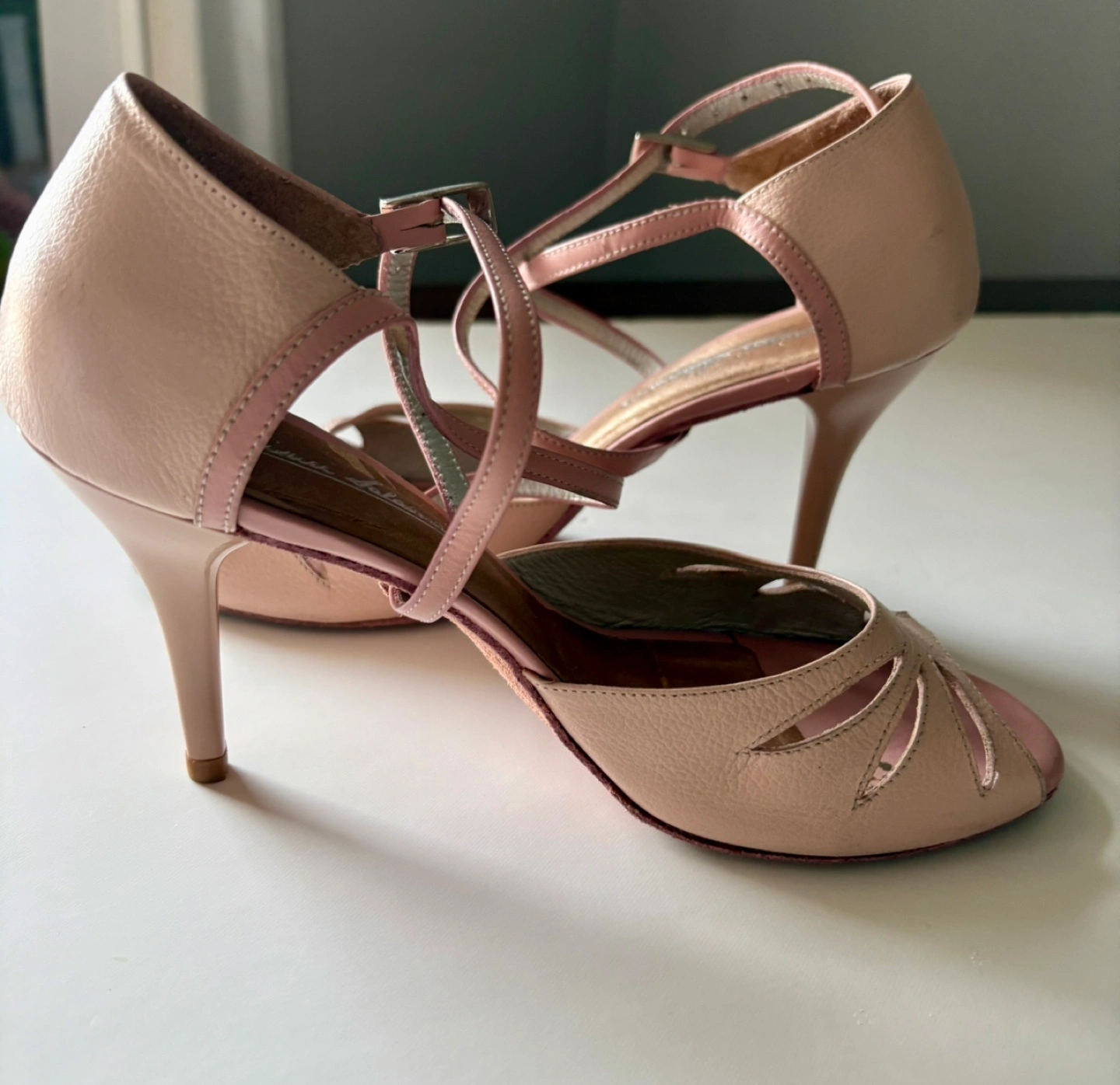 Argentine tango/ dance shoes. They were made to order. I customized the colors. Overall color is dusty rose. Leather upper, suede sole. Size 8 (or 7.5). Heels 3.5”. I ordered them from tango dancer in NYC. The shoes stamped with her name. There is slight wear on insole. See areas on the photo highlighted in red.
