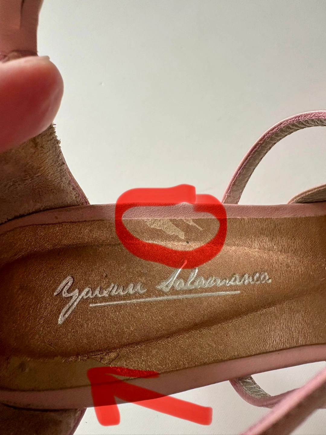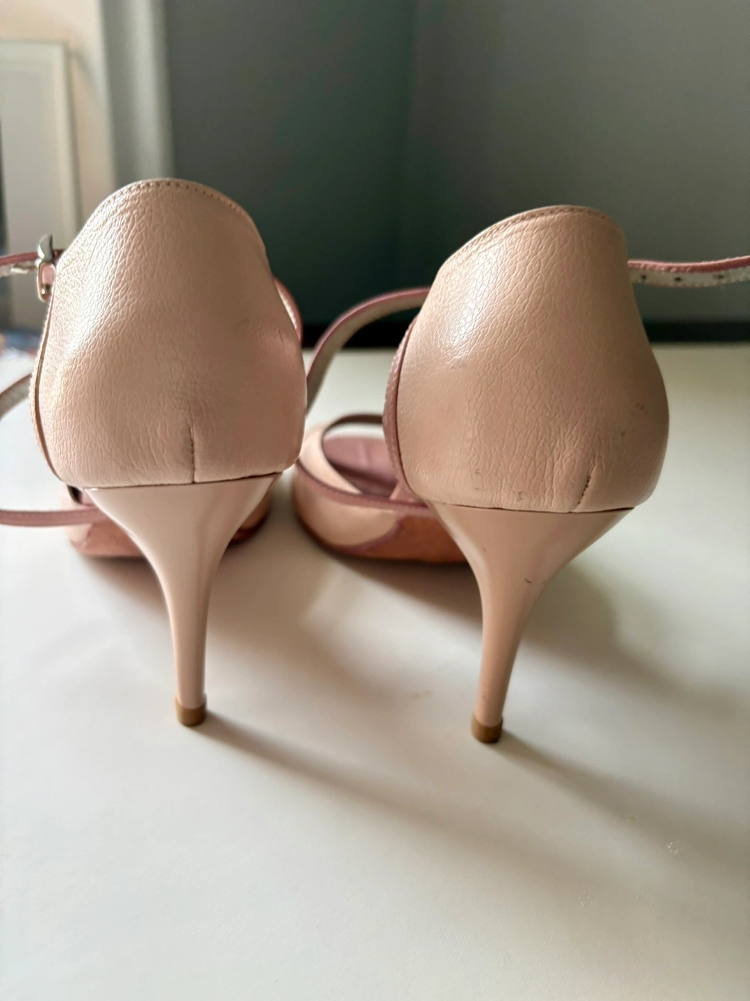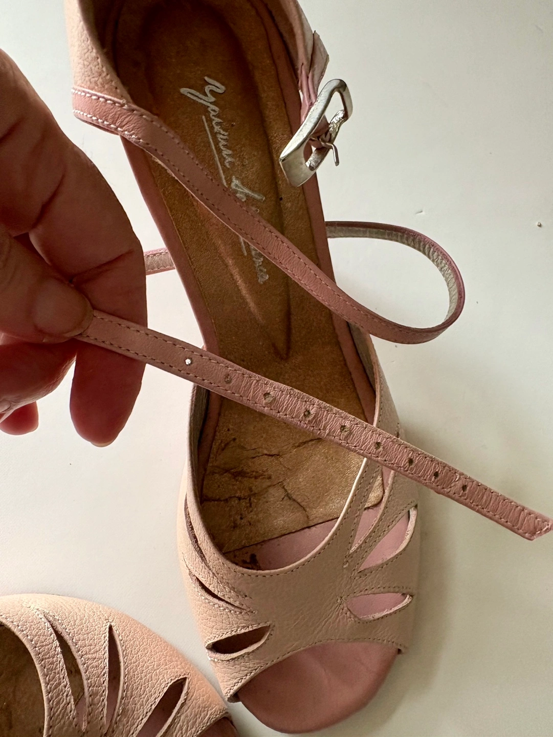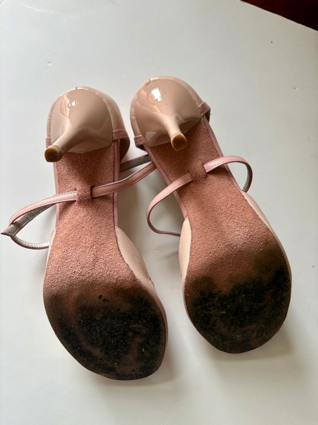 Argentine tango/ dance shoes. They were made to order. I customized the colors. Overall color is dusty rose. Leather upper, suede sole. Size 8 (or 7.5). Heels 3.5”. I ordered them from tango dancer in NYC. The shoes stamped with her name. There is slight wear on insole. See areas on the photo highlighted in red.