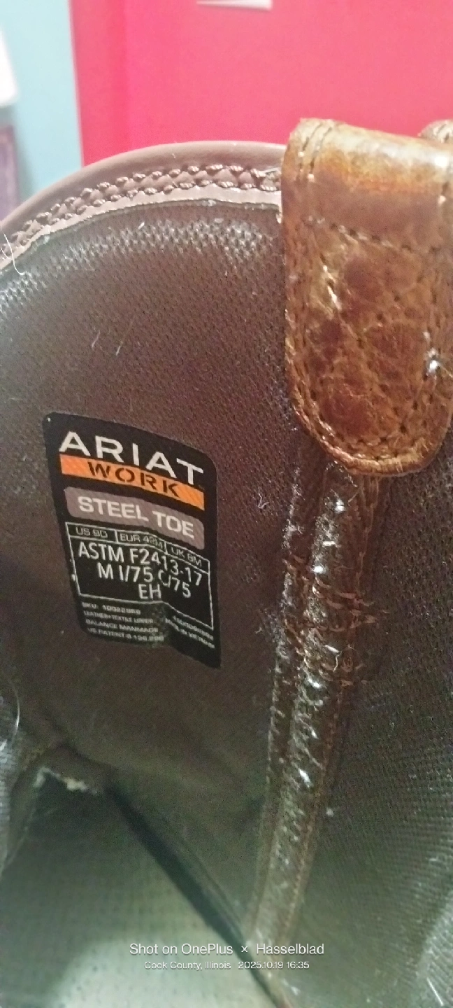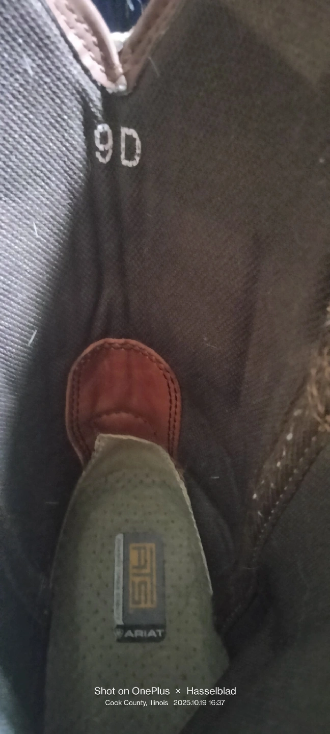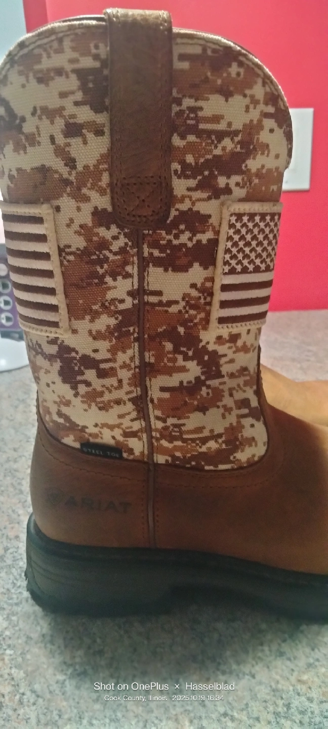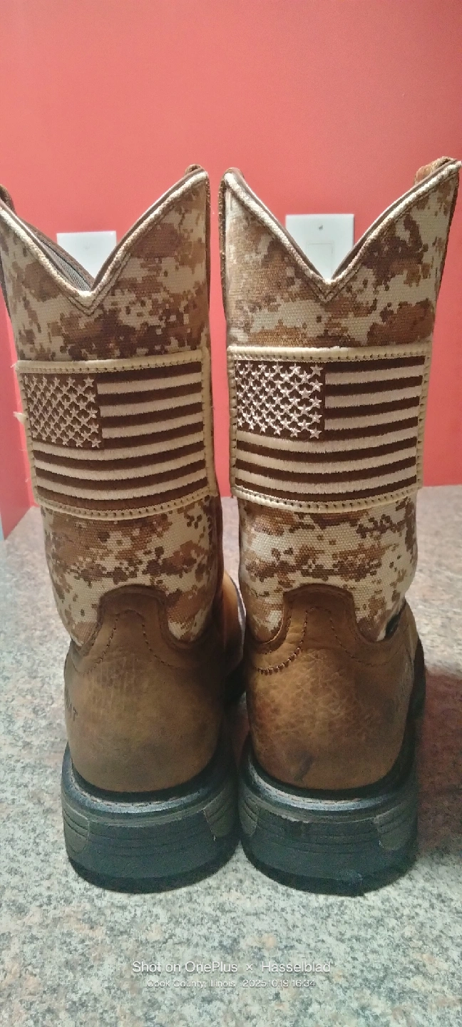 15Ariat Work Steel Toe boots in size 9D. They have a cool camo and American flag design on the shaft. These boots are slip and oil resisting, electrical hazard and steel toe perfect for tough jobs.They are in very good condition.