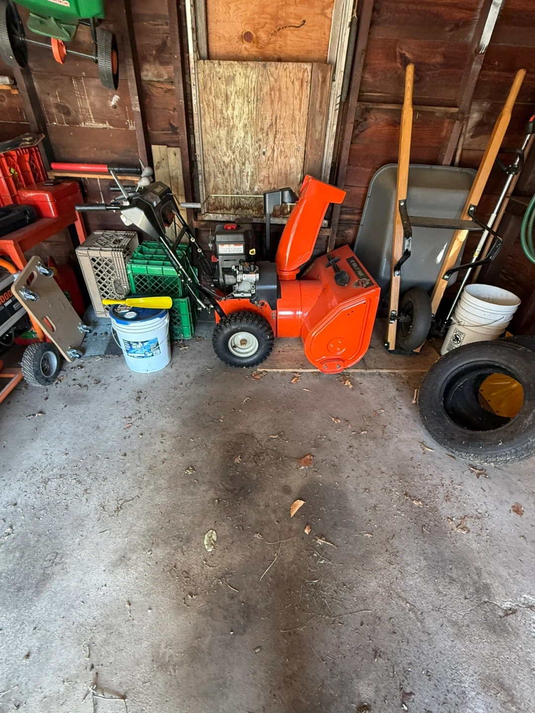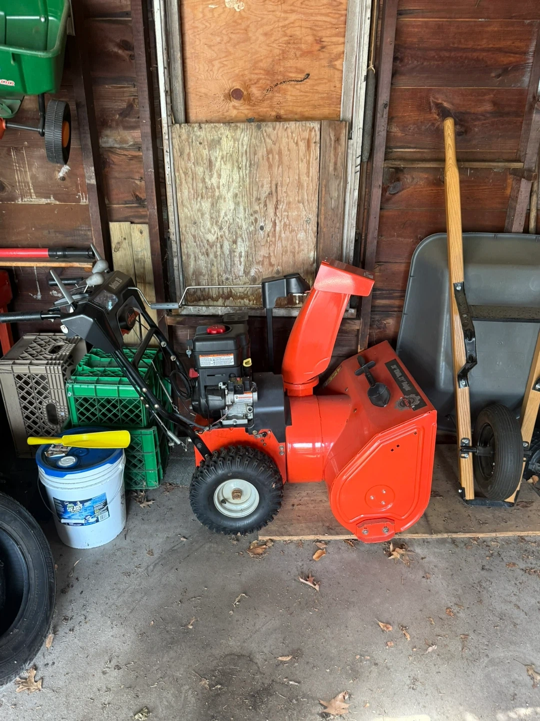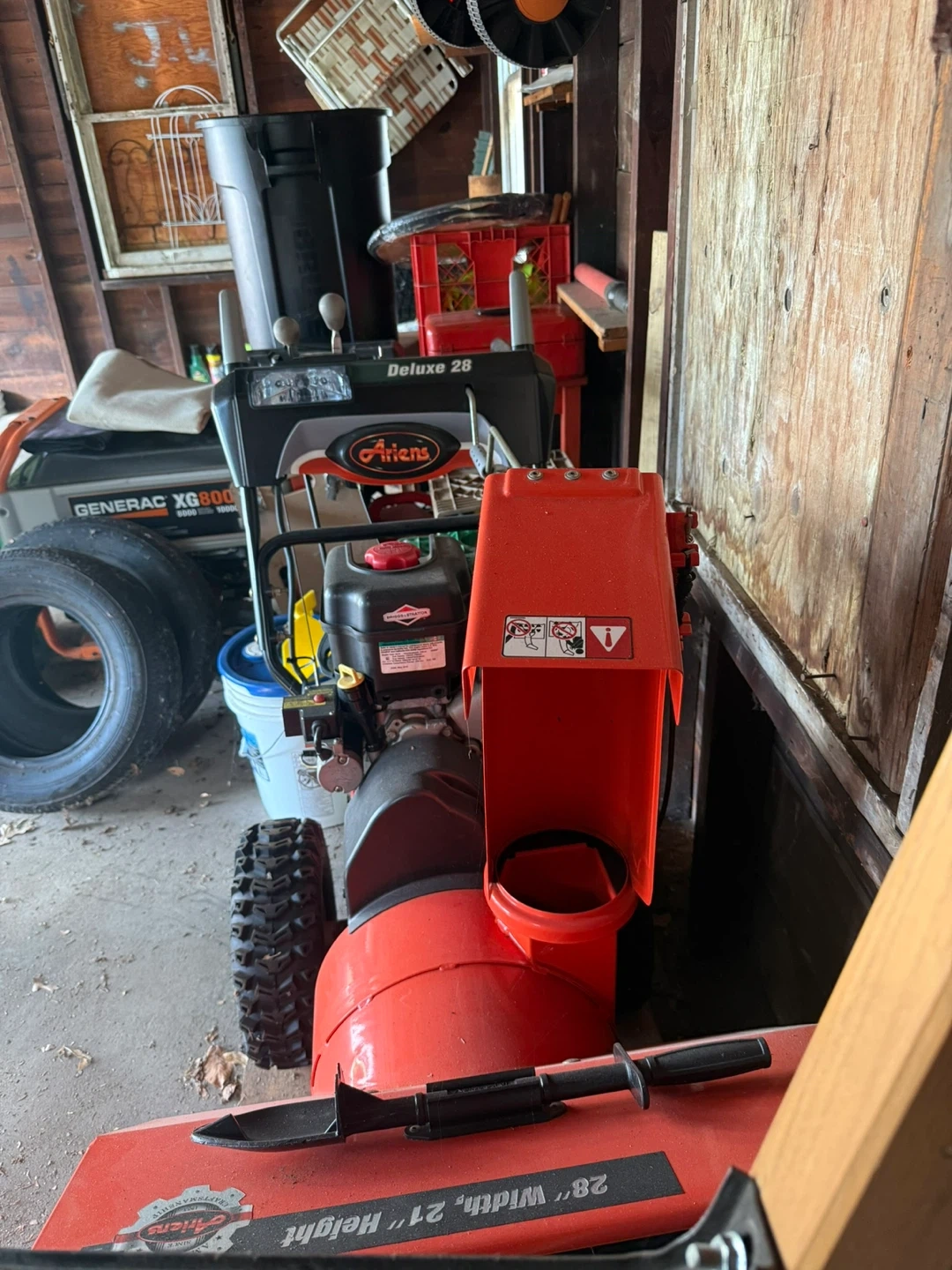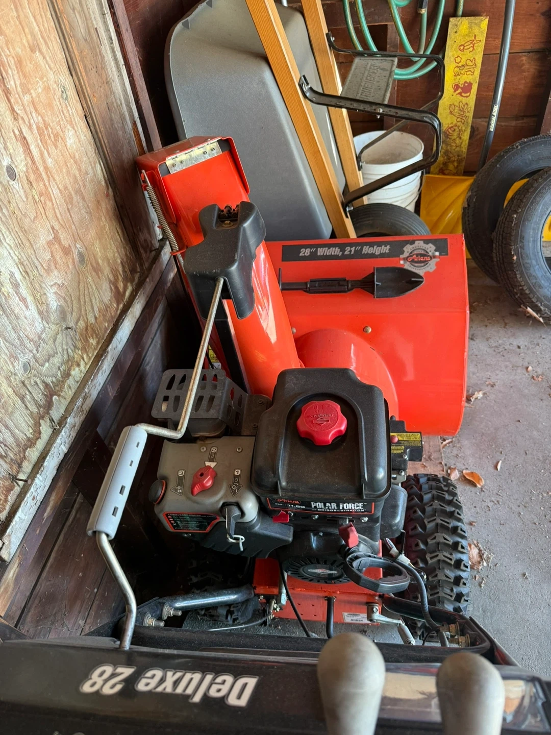 60Ariens Deluxe 28 snow thrower . Has heated hand grips , chute clean out tool. 28 inch width and 21 inch height with 11.5 polar force Briggs & Stratton engine. Runs good , manuals included.Has both pull & electric start. Cash only