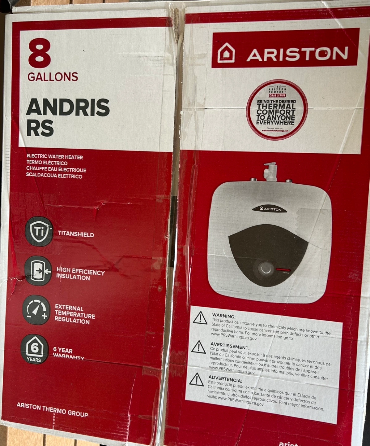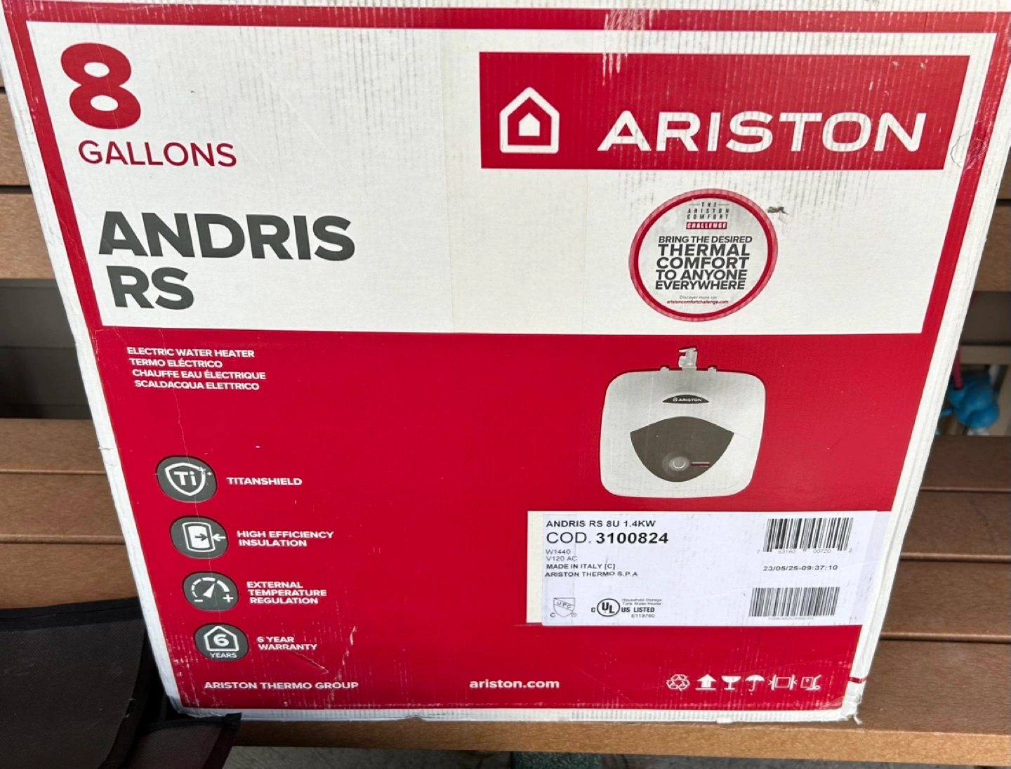 New 8-gallon electric water heater. Features include Titanshield technology, high-efficiency insulation, and external temperature regulation. Comes with a 6-year warranty. Model number: 3100824.
