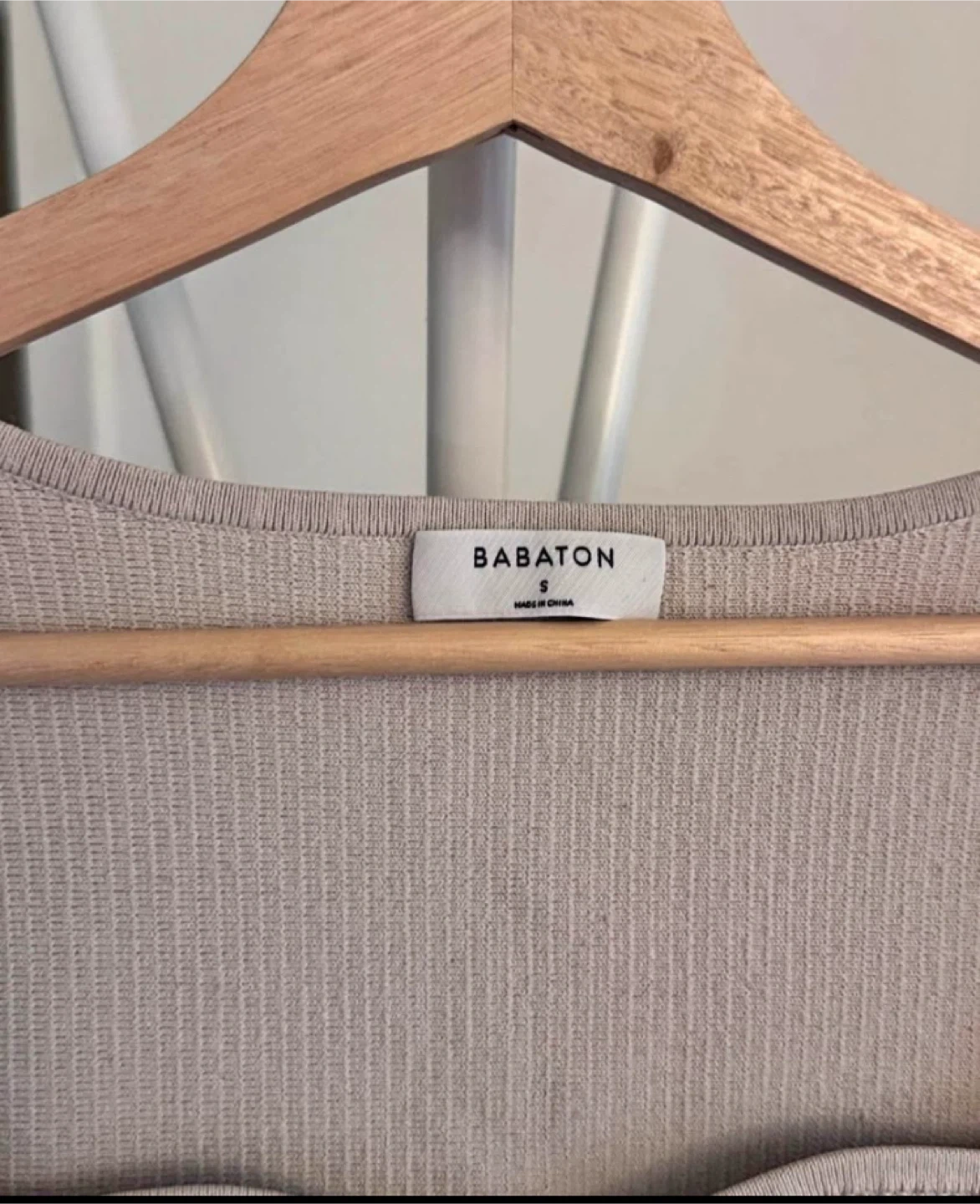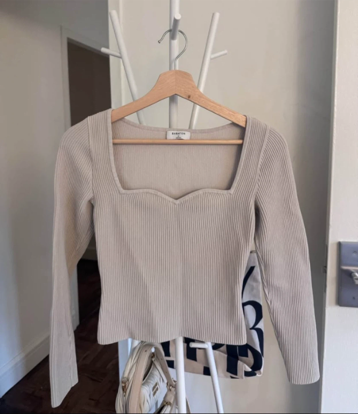 Ribbed long sleeve top from Babaton (Aritzia), featuring a sculpted sweetheart neckline. It's a beautiful neutral color and in great condition. • Size: Small • Color: Taupe/Beige • Brand: Babaton (Aritzia) • Condition: Gently worn, excellent shape