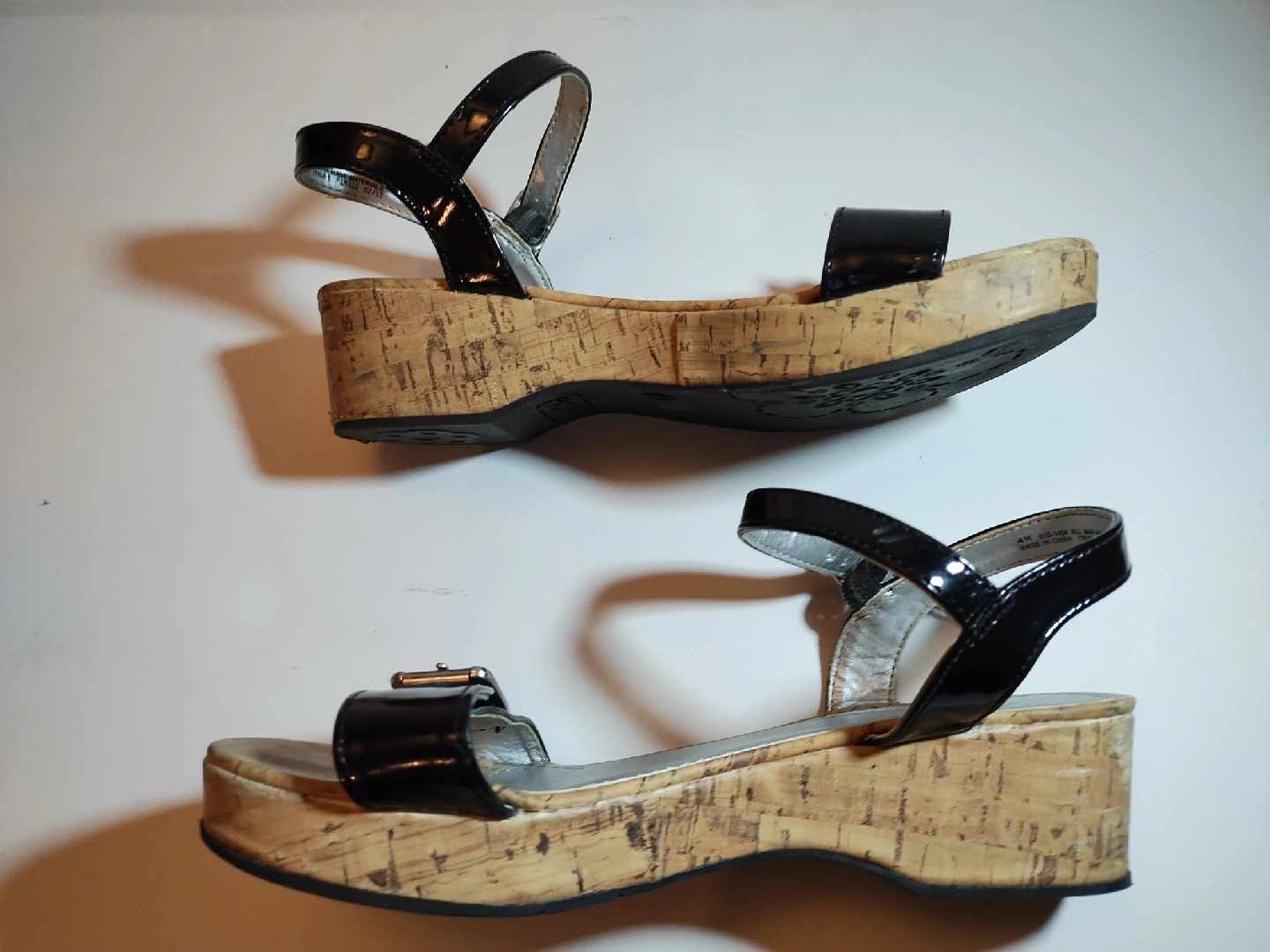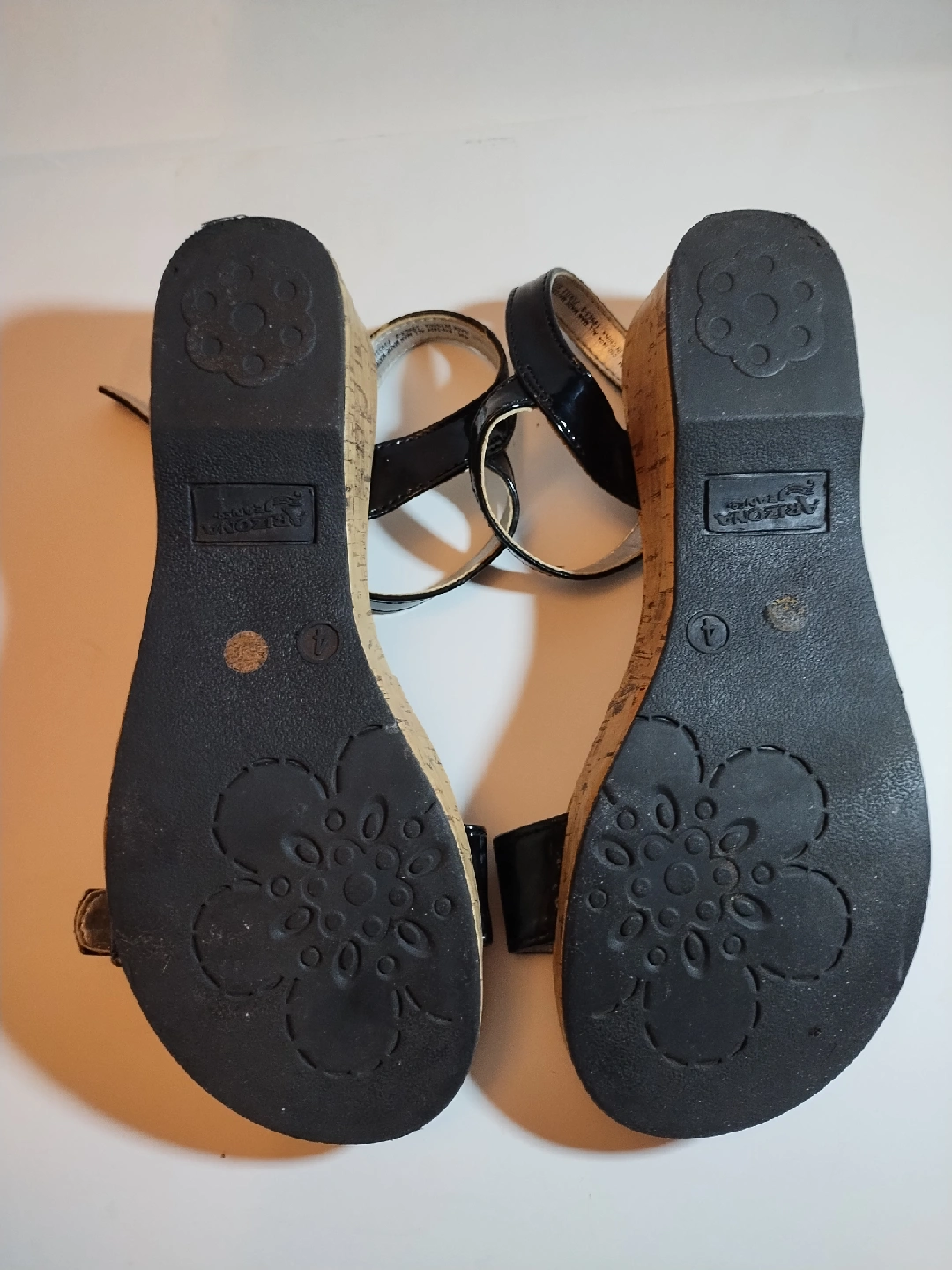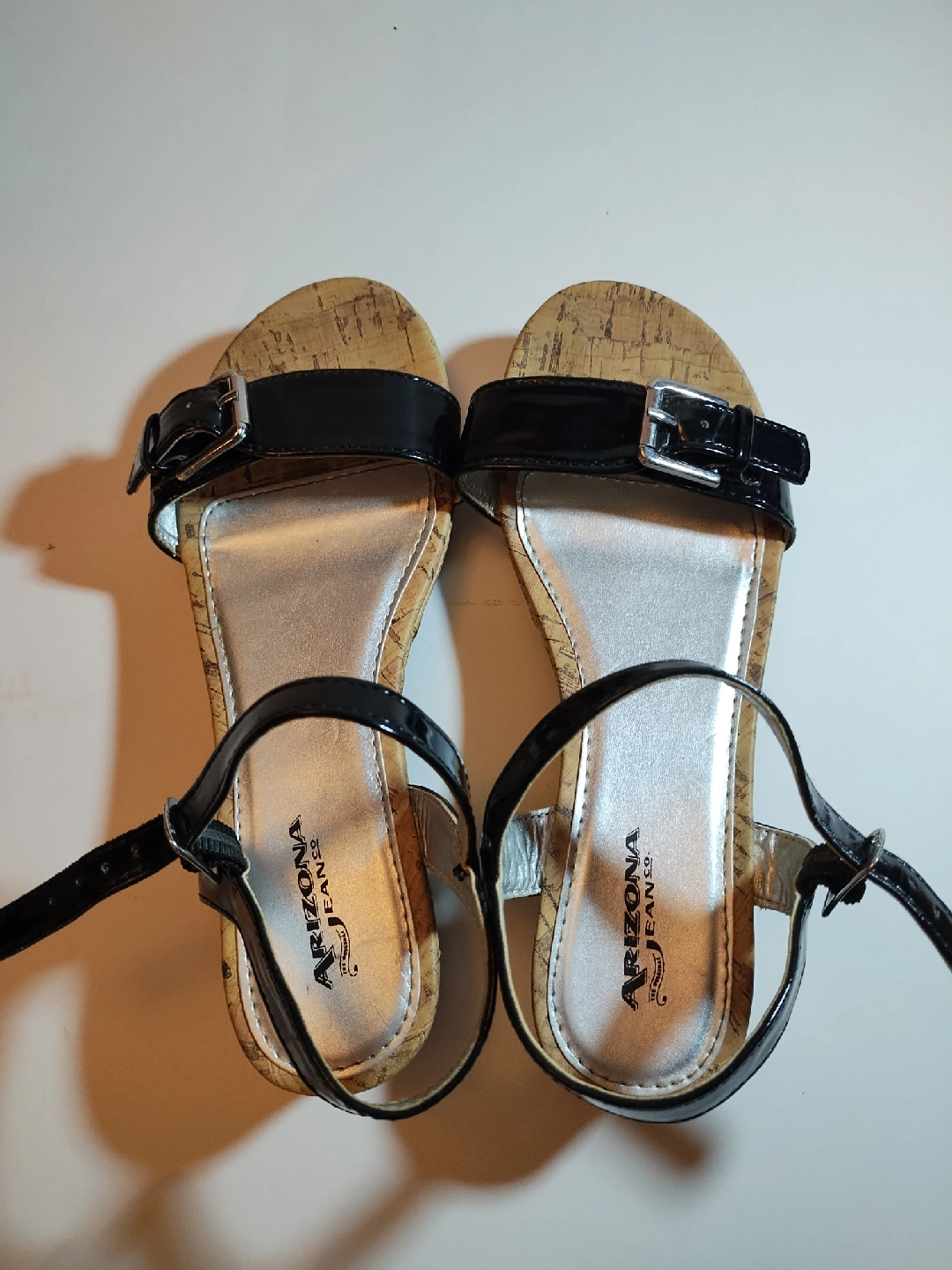 5Selling new girls Arizona Jeans Co. Silver patent black wedge style sandal size 4 Medium. The material is a synthetic with one buckle across the top and side buckle. They are a very adorable looking shoe.
