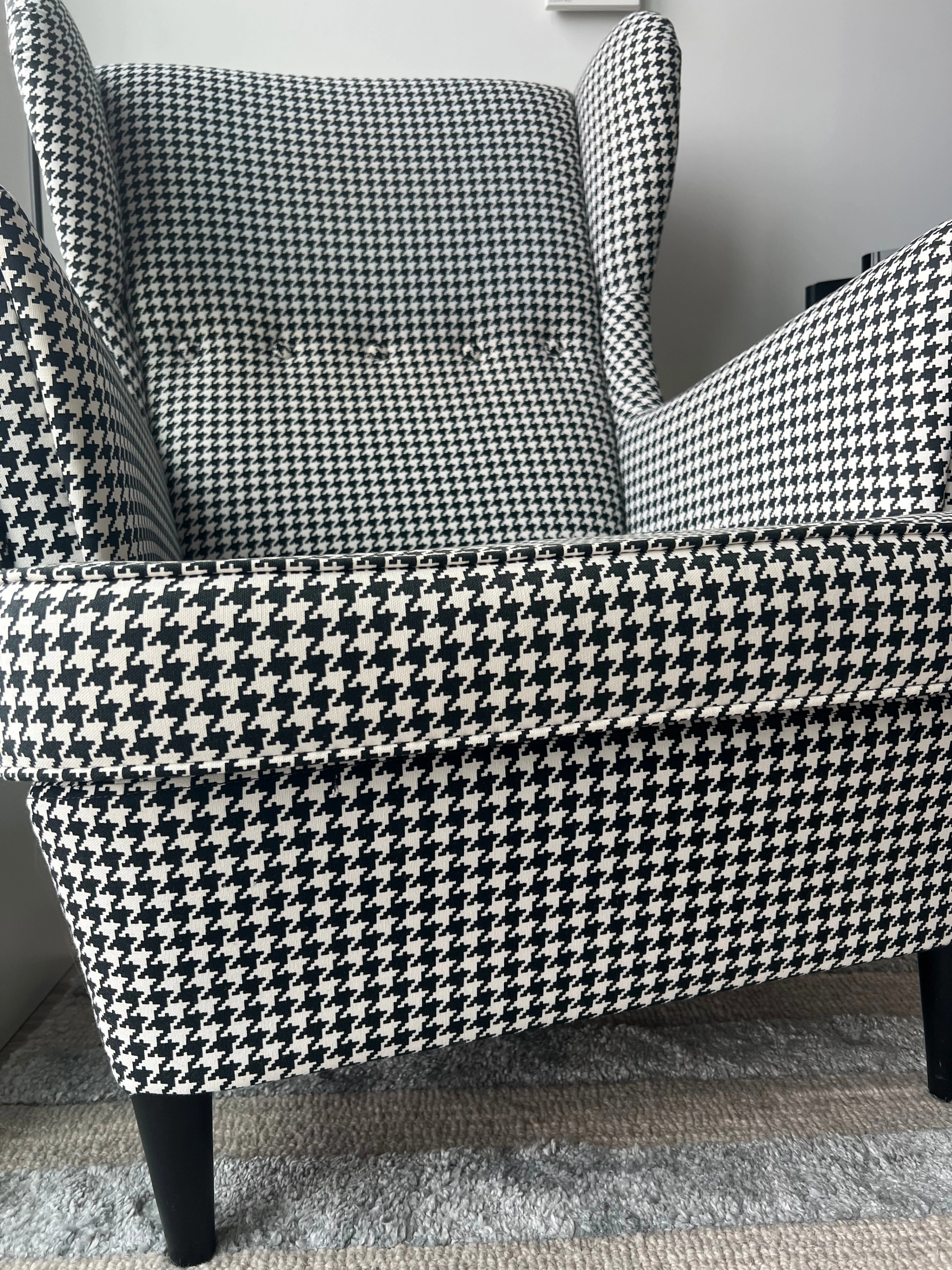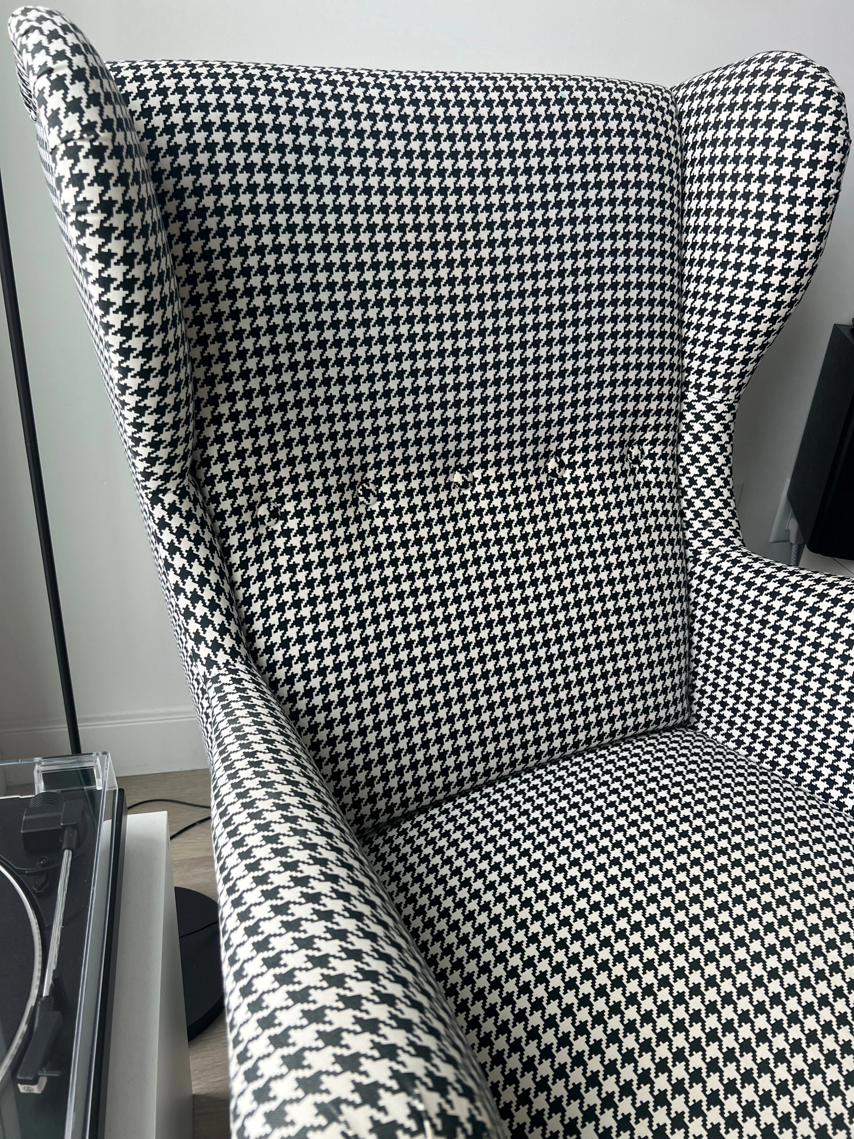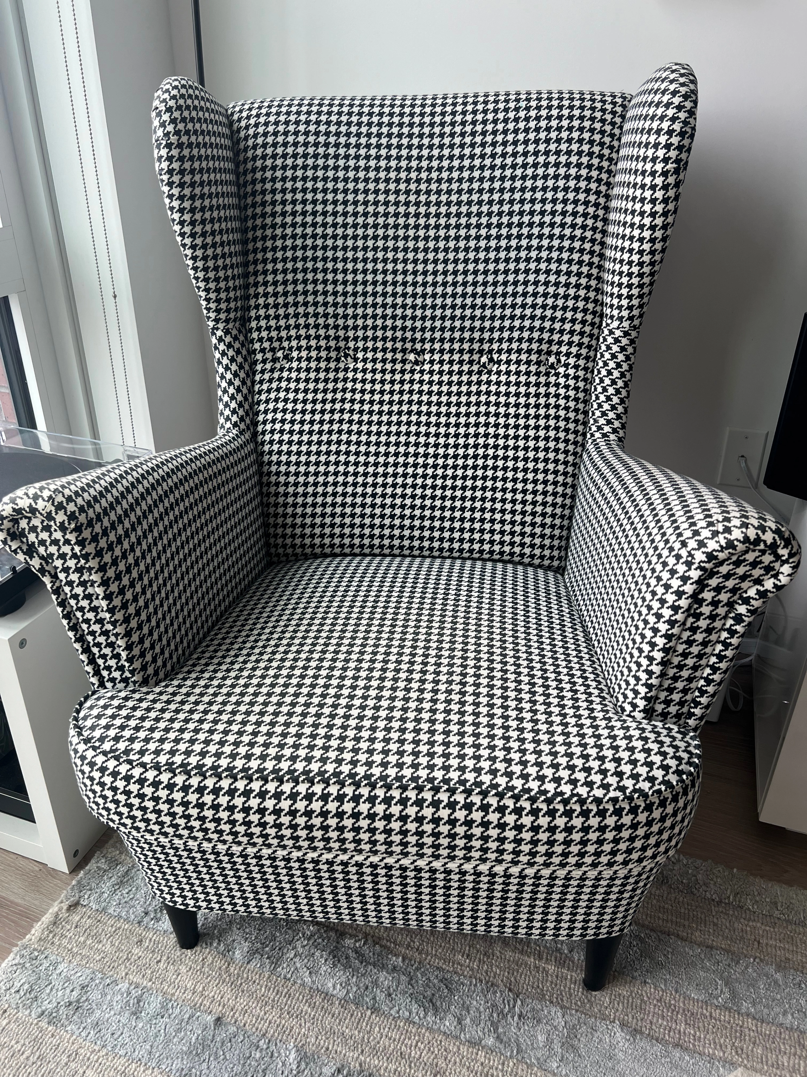 98Selling Ikea Strandmon Armchair with a stylish houndstooth pattern. It is in great condition and clean. You can really loosen up and relax in comfort because the high back on this chair provides extra support for your neck. Value of $400