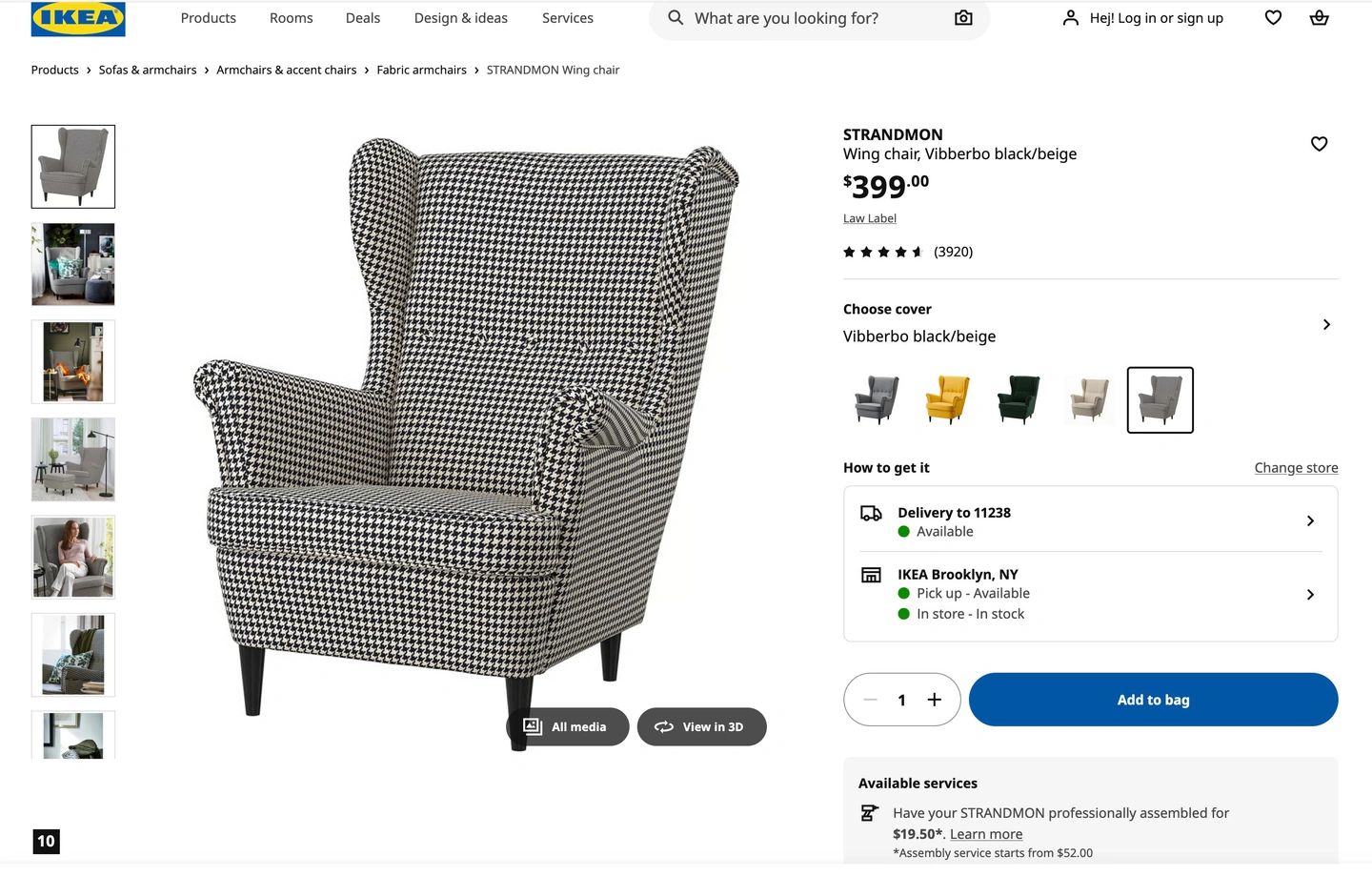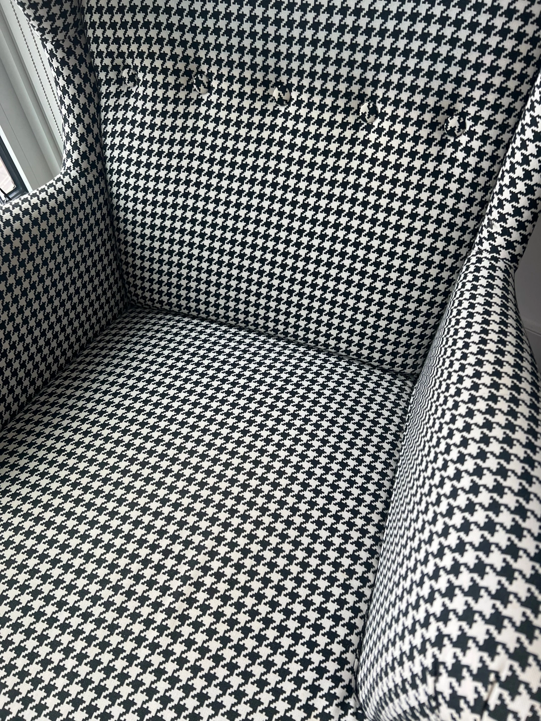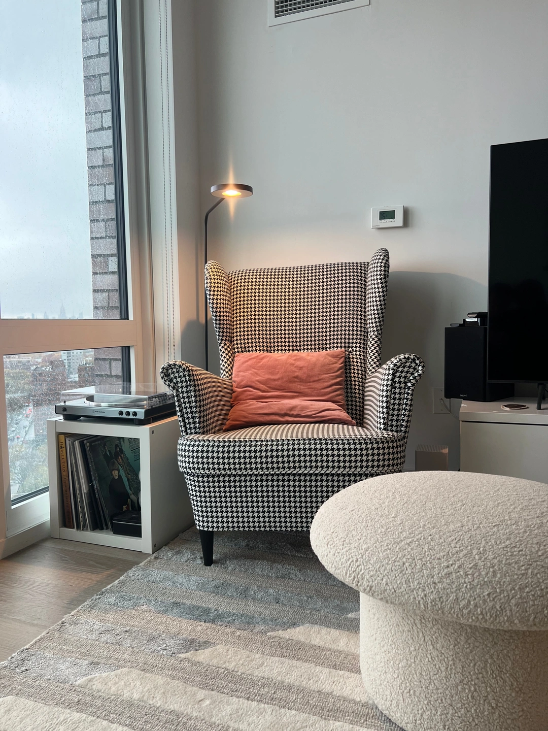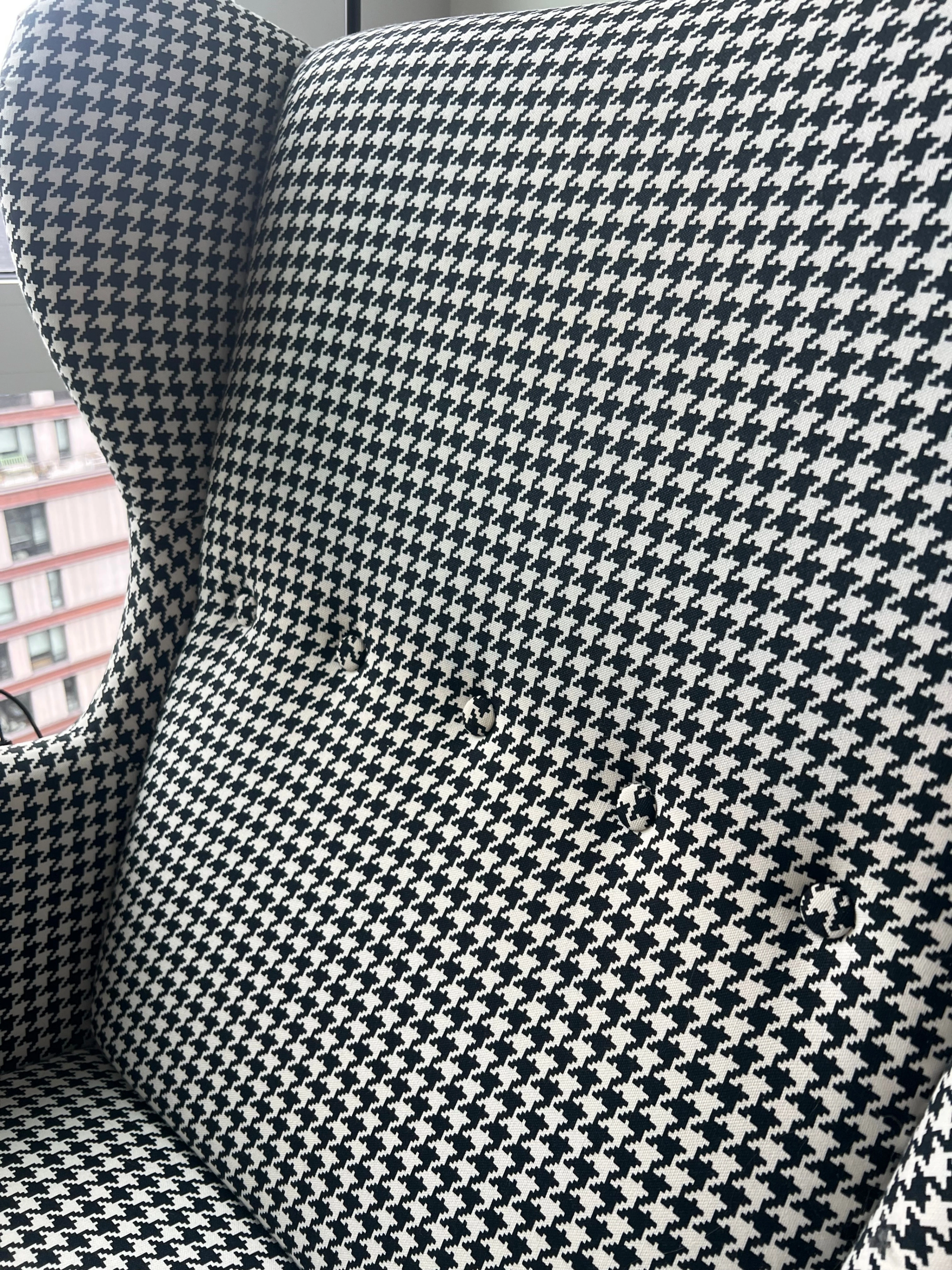 98Selling Ikea Strandmon Armchair with a stylish houndstooth pattern. It is in great condition and clean. You can really loosen up and relax in comfort because the high back on this chair provides extra support for your neck. Value of $400