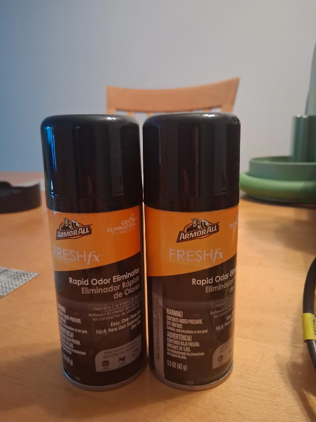 Selling two cans of Armor All FRESHfx Rapid Odor Eliminator. These freshen car interiors and eliminate odors with a new car scent. Each can contains 1.5 oz (42 g).