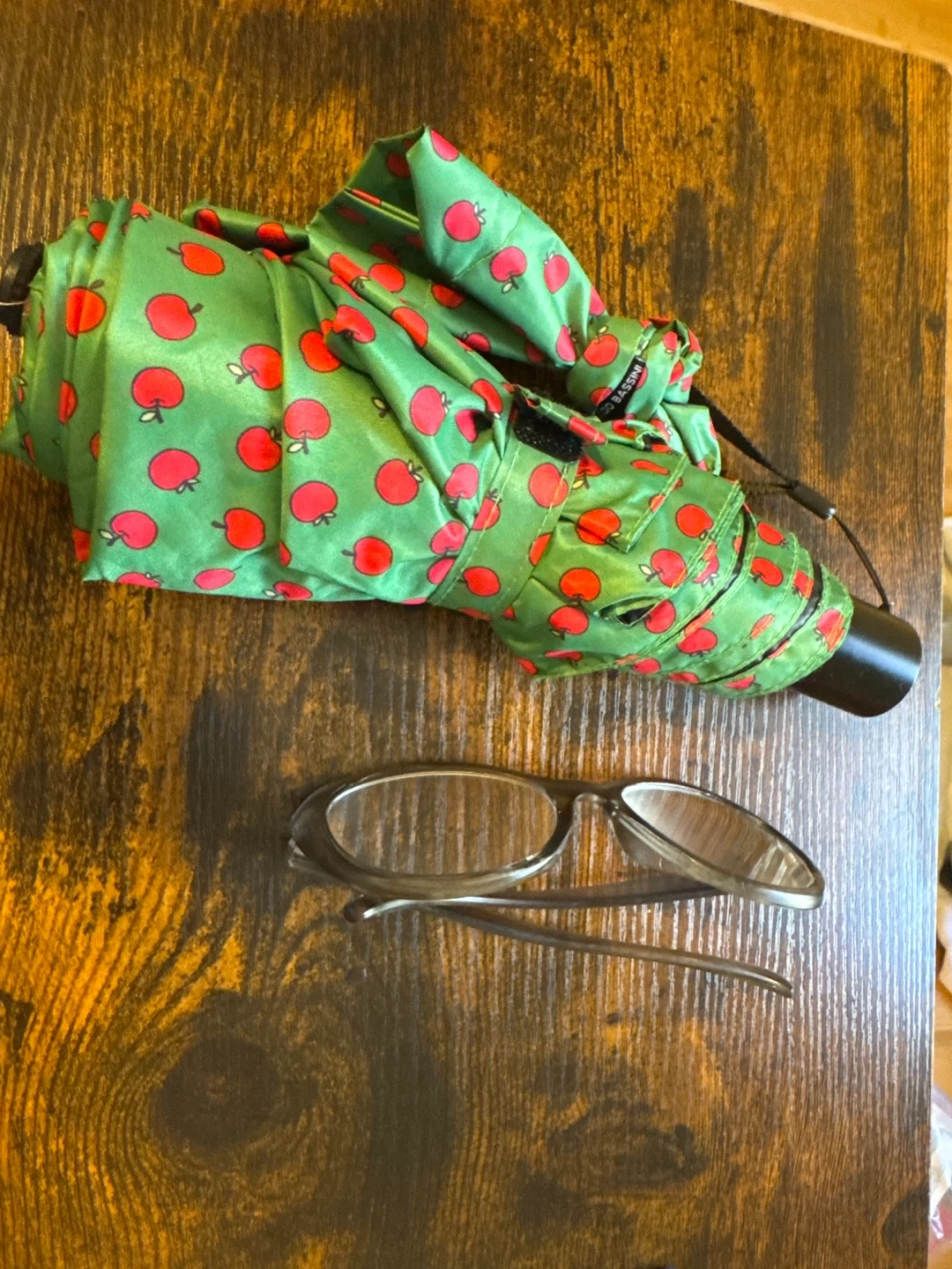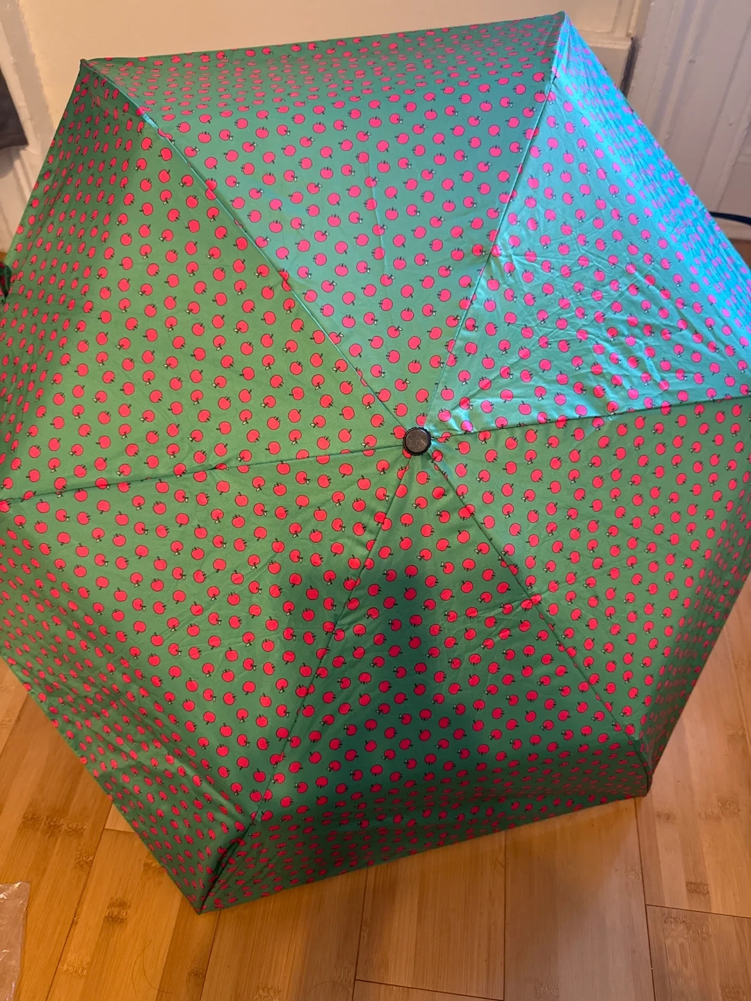 Selling a cute, light,small and strong umbrella! It features a fun green background with a red apple print. Perfect for those rainy days! And Sunny days for you. Made in south Korea.