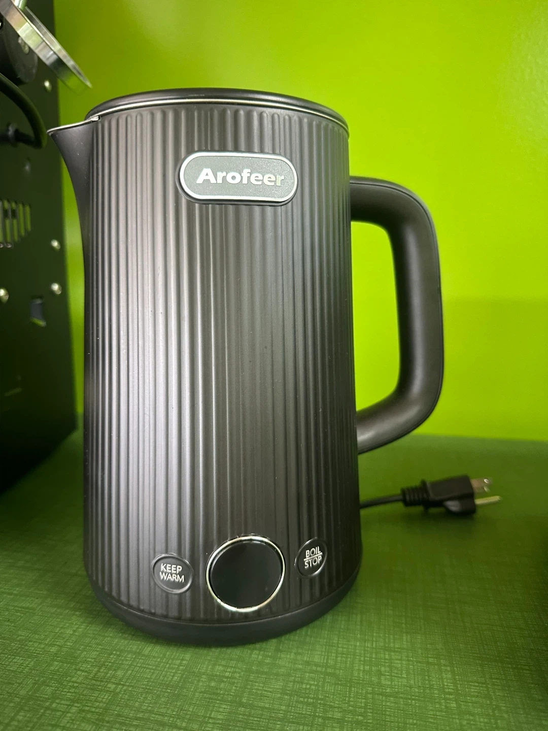 I'm selling a stylish Arofeer electric kettle in black. It features a keep warm function and a boil stop button for safety and convenience. Used for a month but got a new one that fit better with my kitchen. This kettle also has different temp settings for different teas.