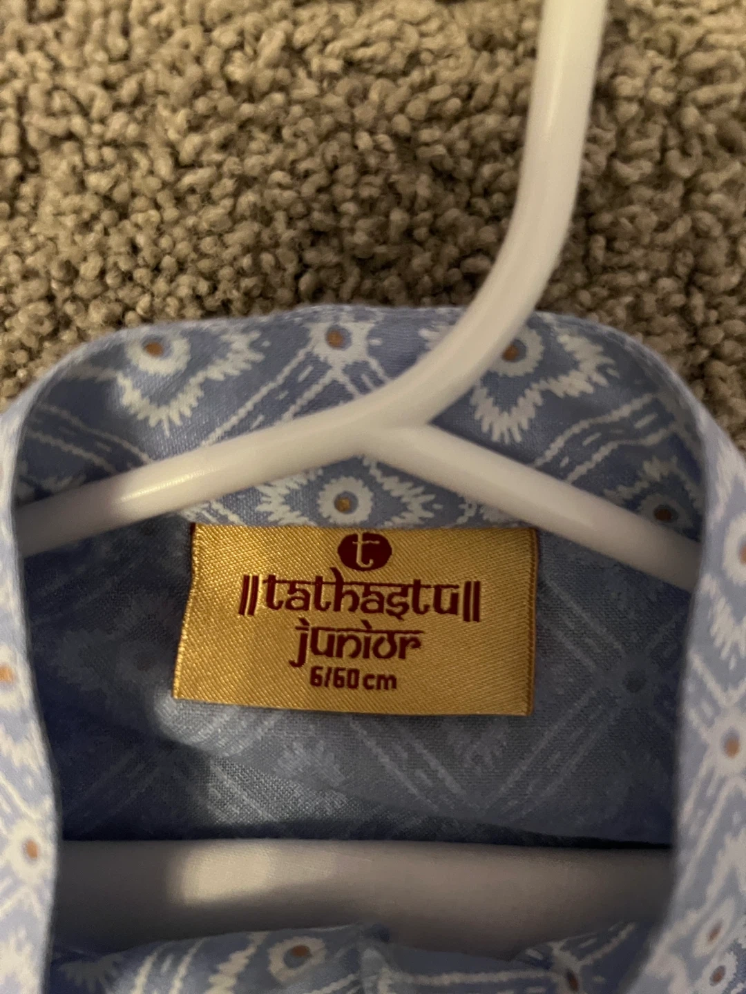This is a Tathastu Junior kurta shirt with a blue and white diamond pattern. It's size 6/60cm. White pants included.