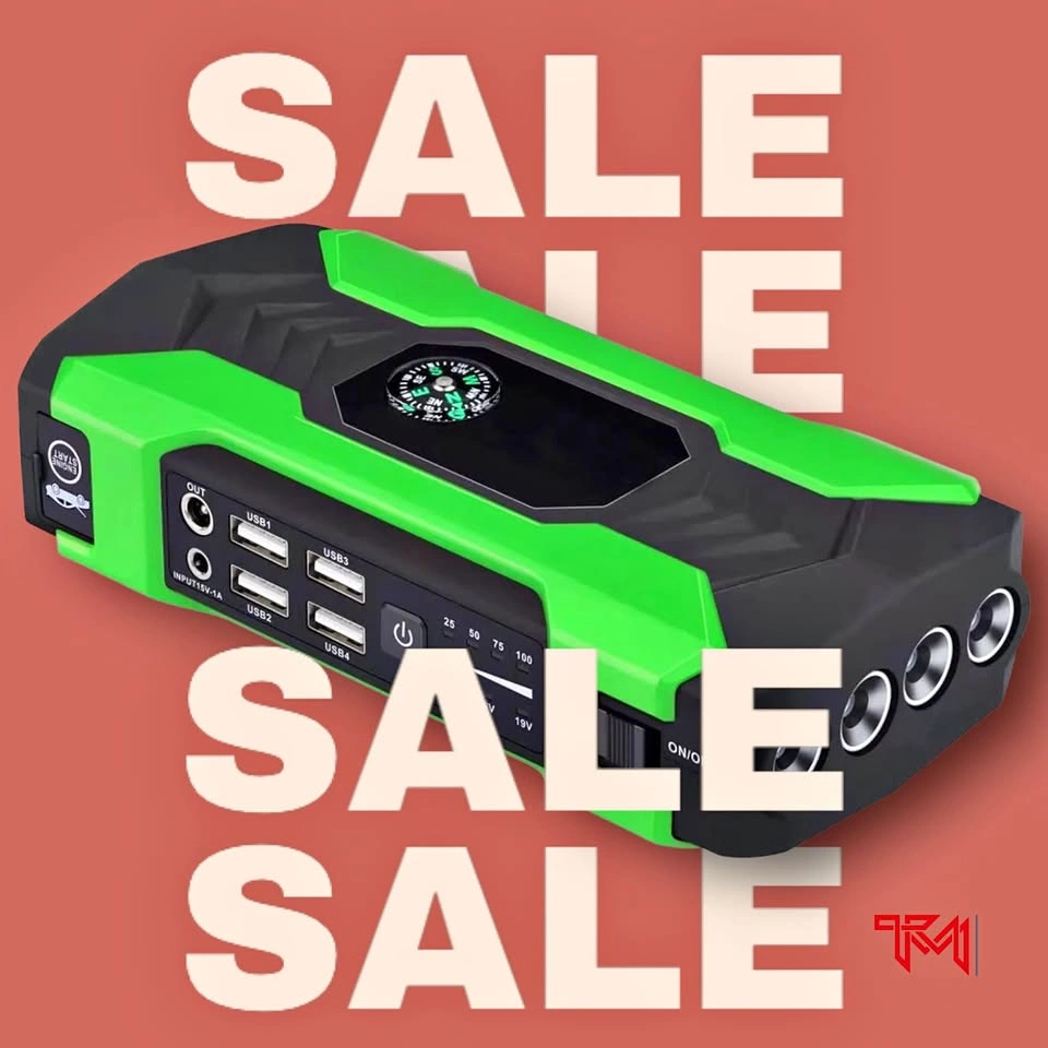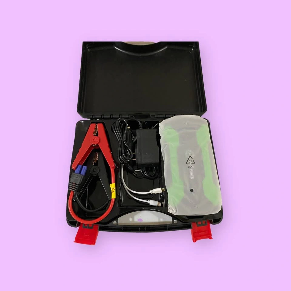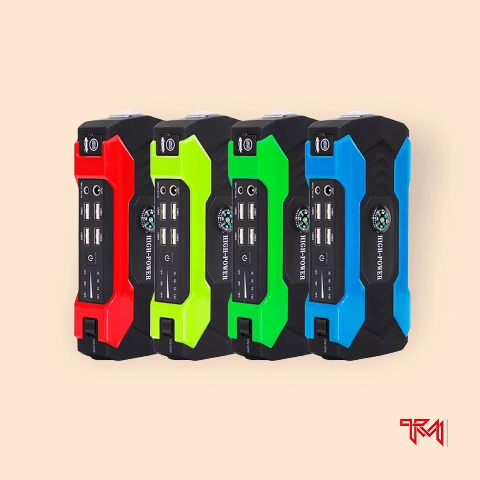 Jump Stater (Arrancador portátil de baterías para vehículos). Multifuncional, con conectores USB para cargar dispositivos móviles, posee potente linterna e indicadores de carga con luces LED.