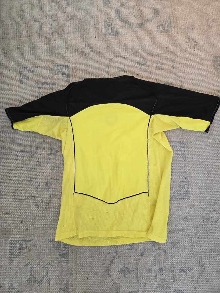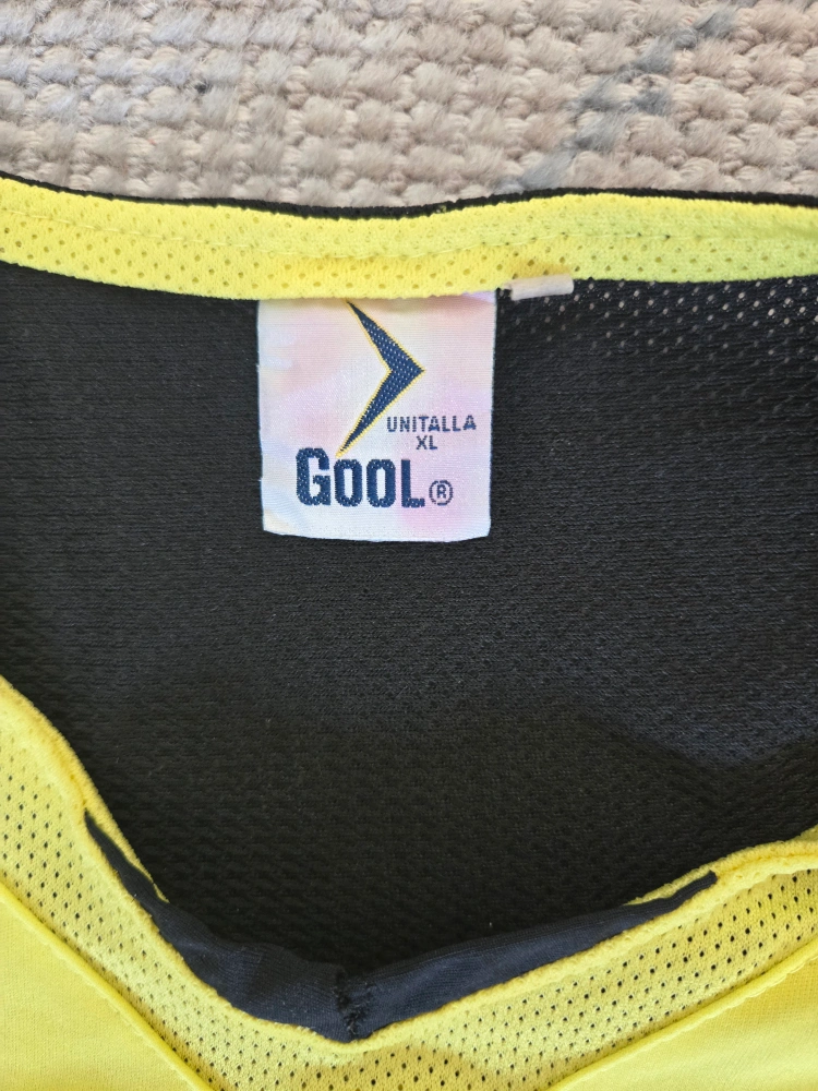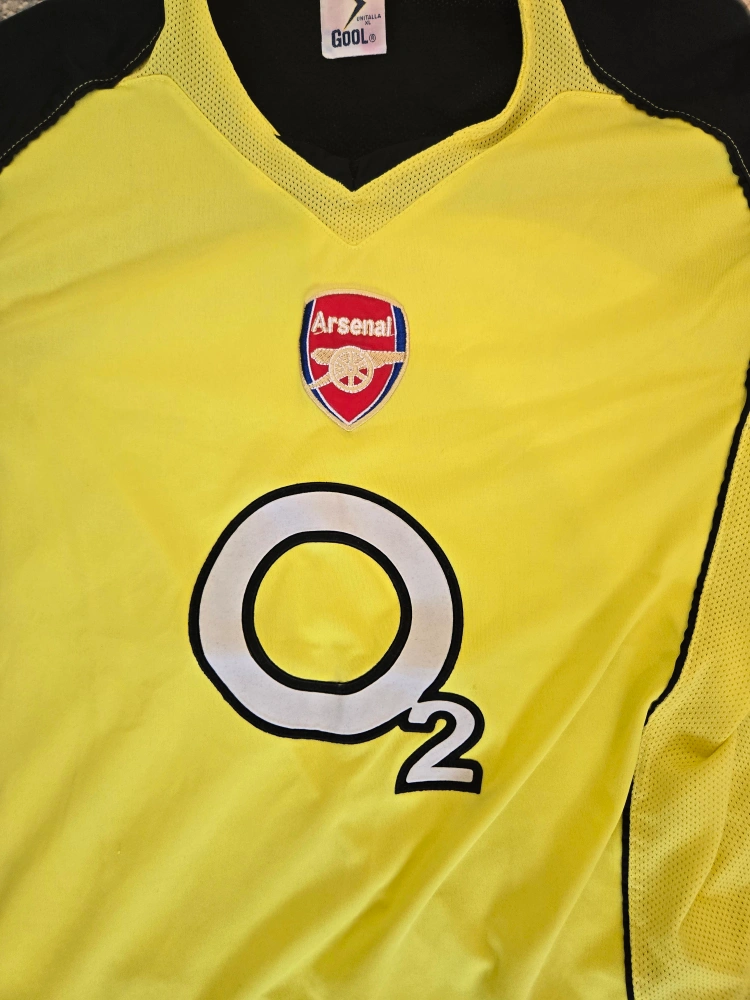 Selling an Arsenal jersey in yellow and black! It's in great condition. The size is Euro XL. which is equivalent to US Large and the brand is Gool. It features the Arsenal logo and the O2 sponsor logo on the front. Perfect for any Arsenal fan!