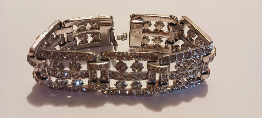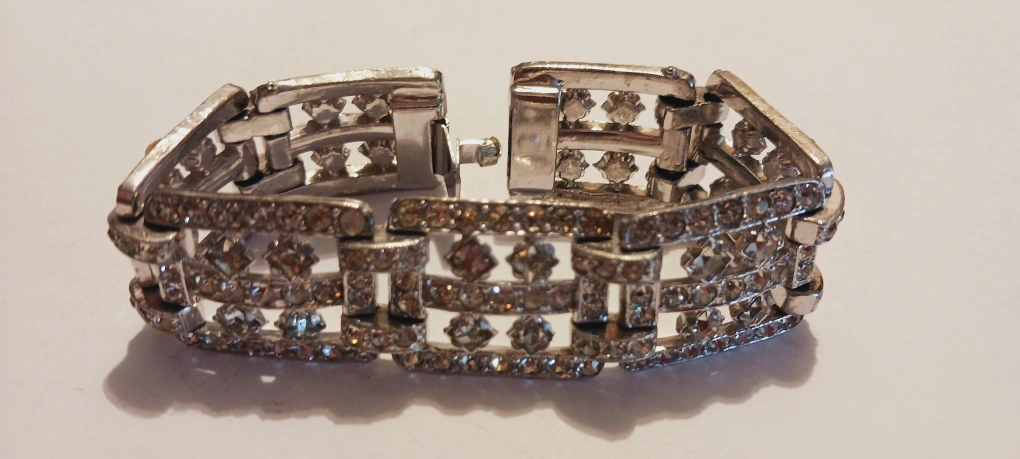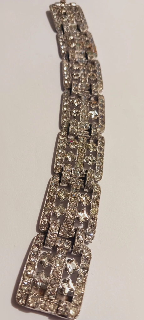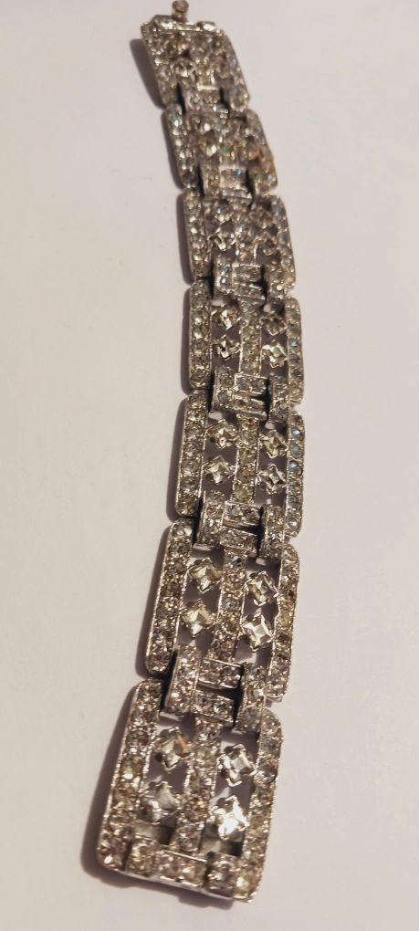 1000+Art Deco Gorgeous Vintage Bracelet. Selling a vintage rhinestone bracelet. It features unique design with sparkling rhinestones set in a silver tone metal. It's in good condition for its age and would make a lovely addition to any jewelry collection. 7" long. ALL MY PRICES ARE NEGOTIABLE !!