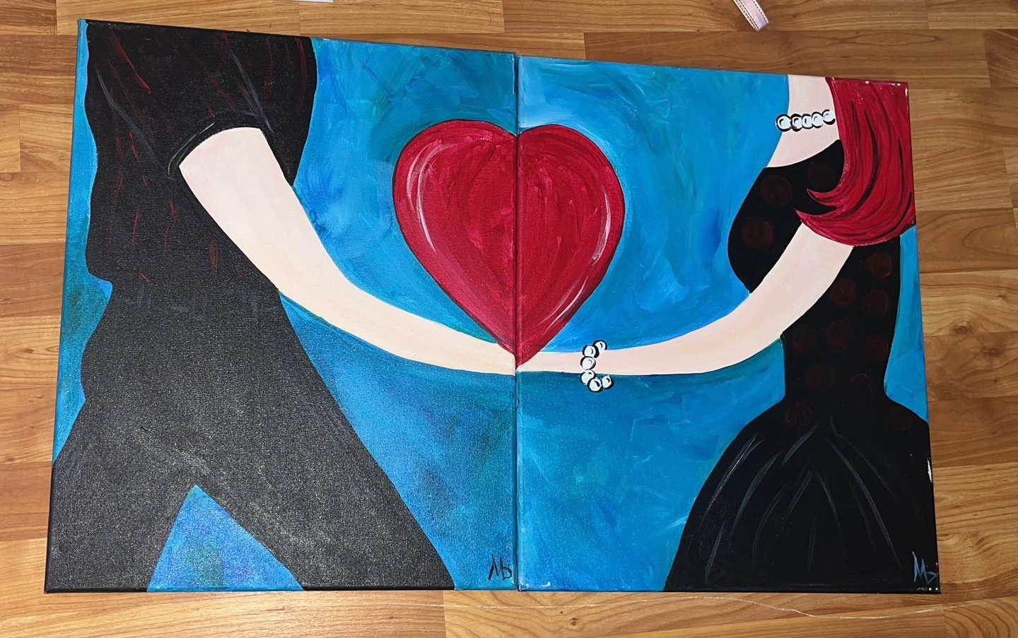 982 (16” x 20”) paintings on canvas. If hanging next to each other, 32” x 20”. 2 people holding hands with heart. One wearing pants, one wearing a dress. Heart above hands. Painted by independent artist Please check my other listings for more artwork. Friendship, love, relationship, couple, art, artwork