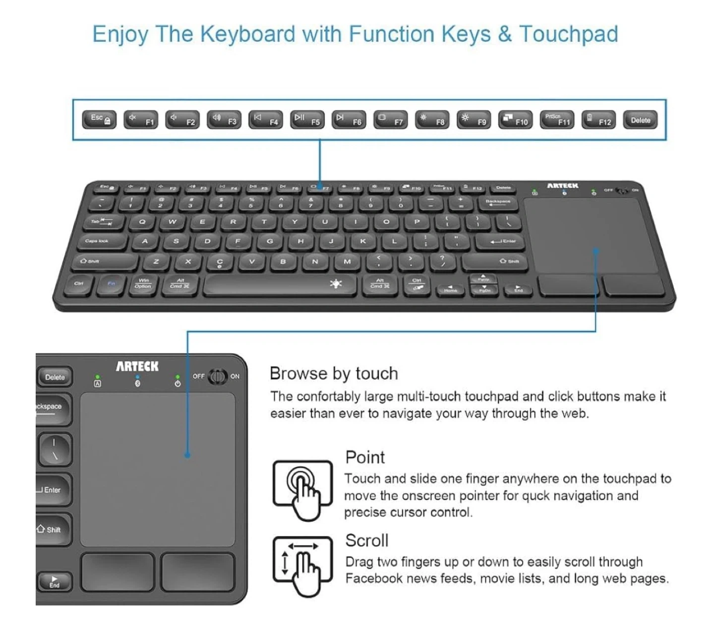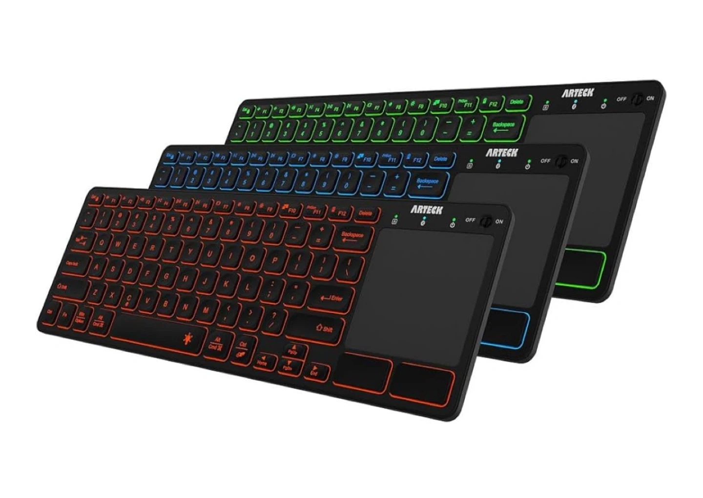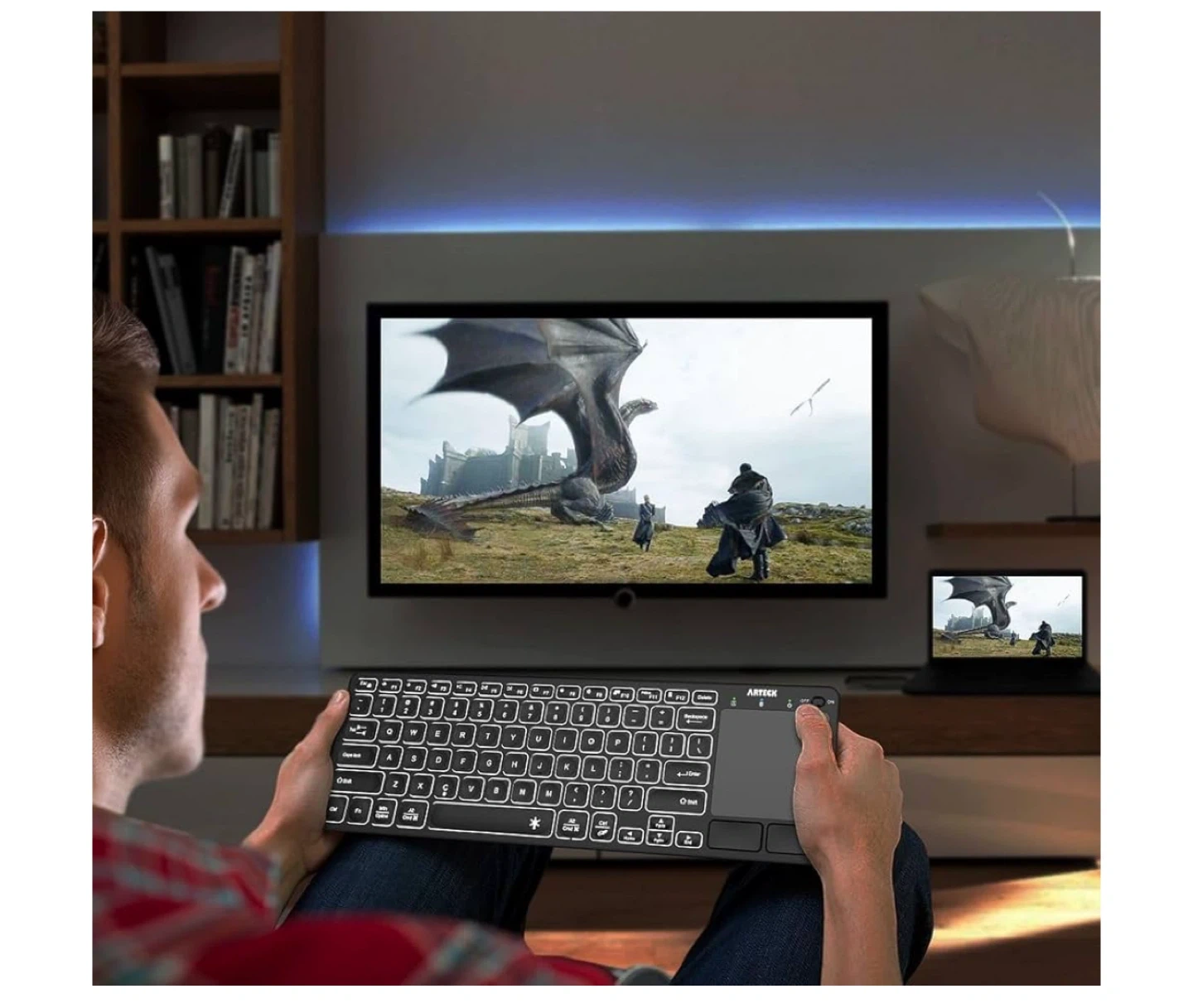 This is an Artek keyboard with a built-in touchpad. It's in great condition and perfect for navigating the web or controlling your smart TV. The keyboard has comfortable keystrokes and function keys, making it easy to use. It also has adjustable brightness and color settings for the backlight.