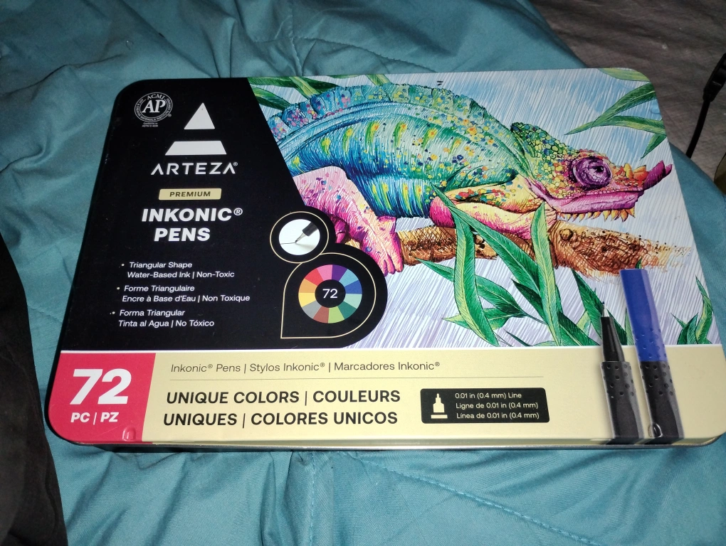 Selling a set of ARTEZA Premium Inkonic Pens! This set comes with 72 unique colors, perfect for any artist or hobbyist. The pens feature a triangular shape and water-based, non-toxic ink. They are great for creating fine lines with the 0.01 in (0.4 mm) line width