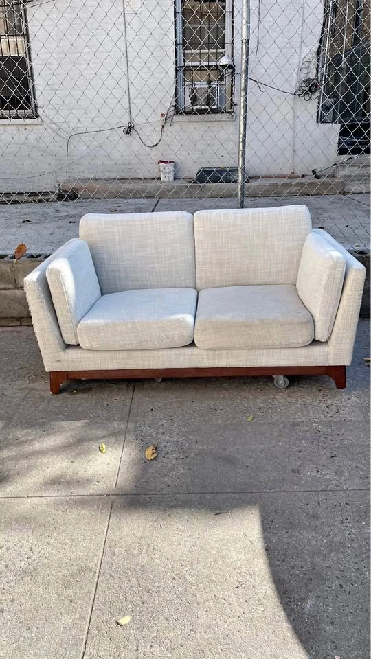 42Small Comfortable Article couch. Good for lounging, playroom, basement, or studio. Dimensions 61 x 35 d x 30 h. There is some fraying on the sides as can be seen in the picture. The couch had been cleaned and is ready for sell.