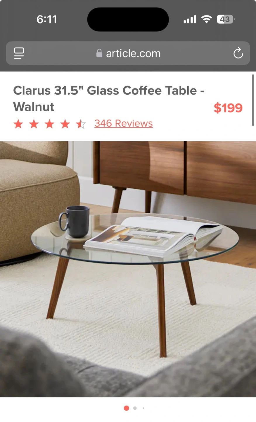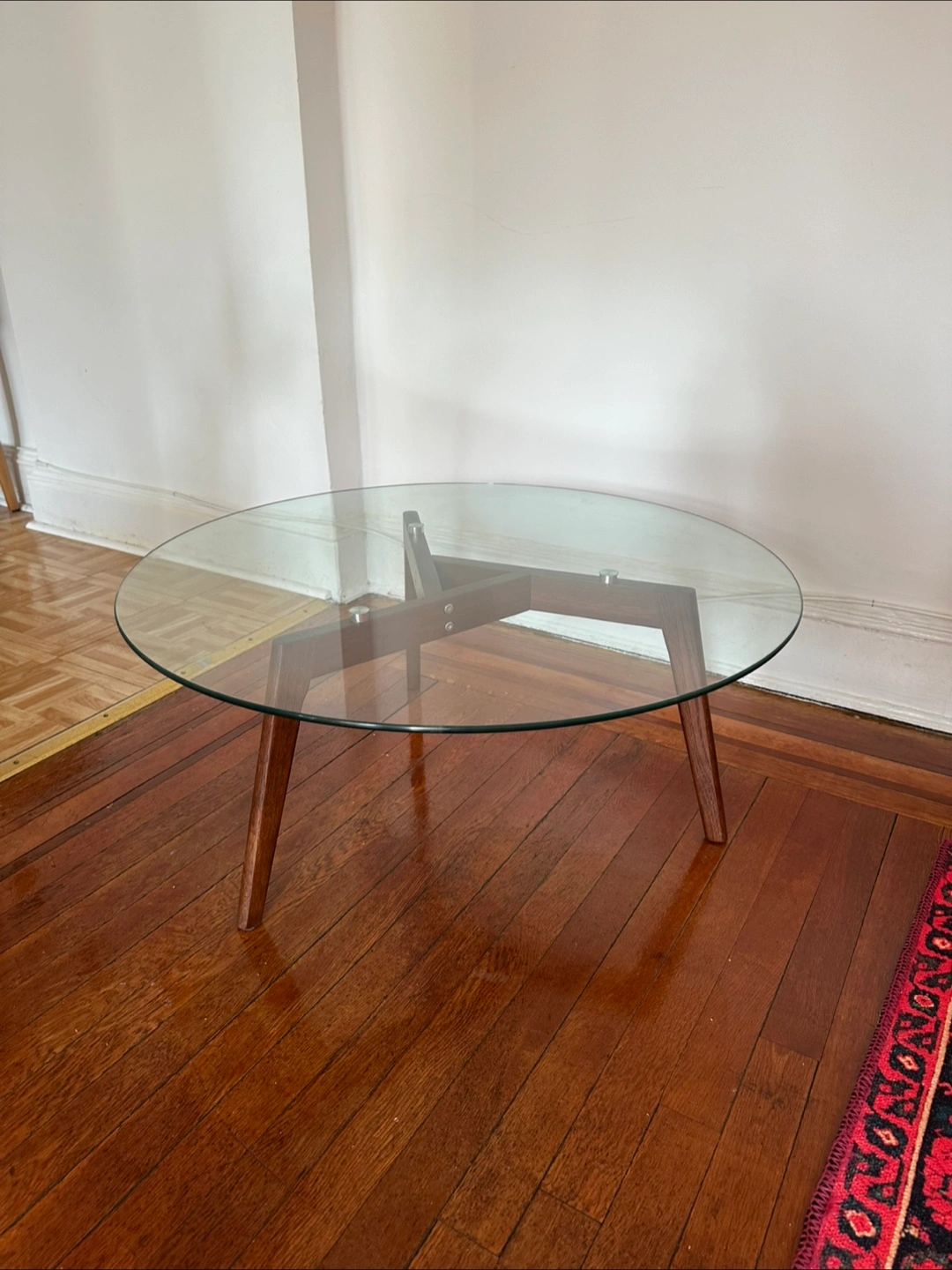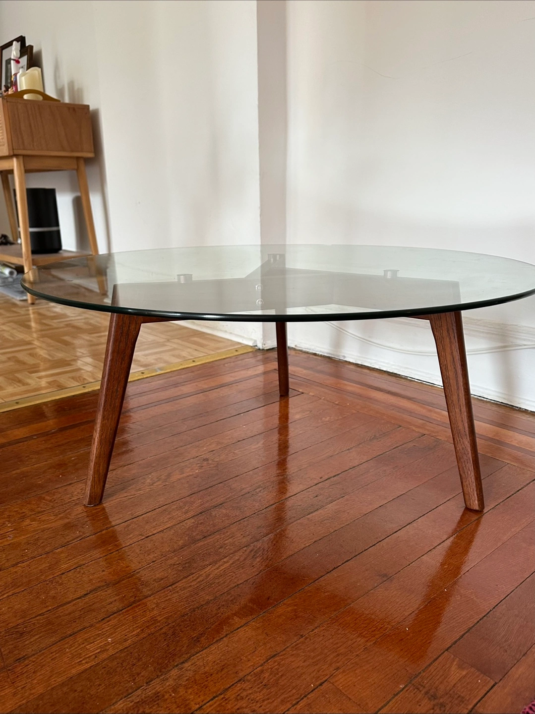 60Round glass top. Walnut wood legs. Modern mid-century design. Great condition. 31.5” width x 14” height Originally bought from Article currently priced at $199.