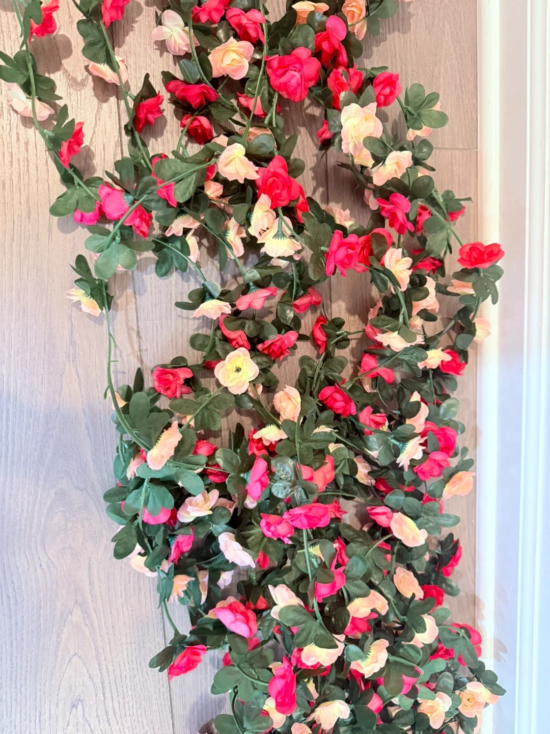 10Selling a beautiful artificial flower garland! It's perfect for adding a touch of charm to any space. The garland features lovely pink and red flowers with green leaves, creating a vibrant and eye-catching display