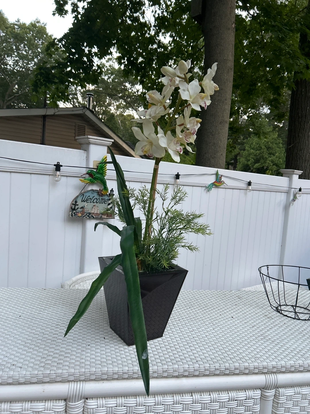Selling an artificial orchid plant in a sleek black pot. It's in great condition and would look lovely in any room. The plant features white orchid blossoms and greenery, making it a low-maintenance way to add some floral charm to your space