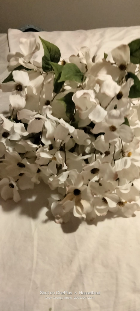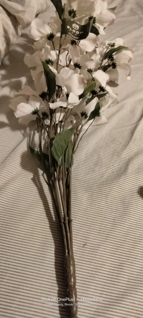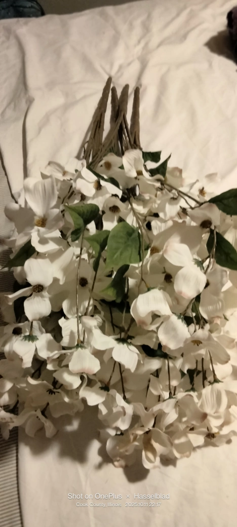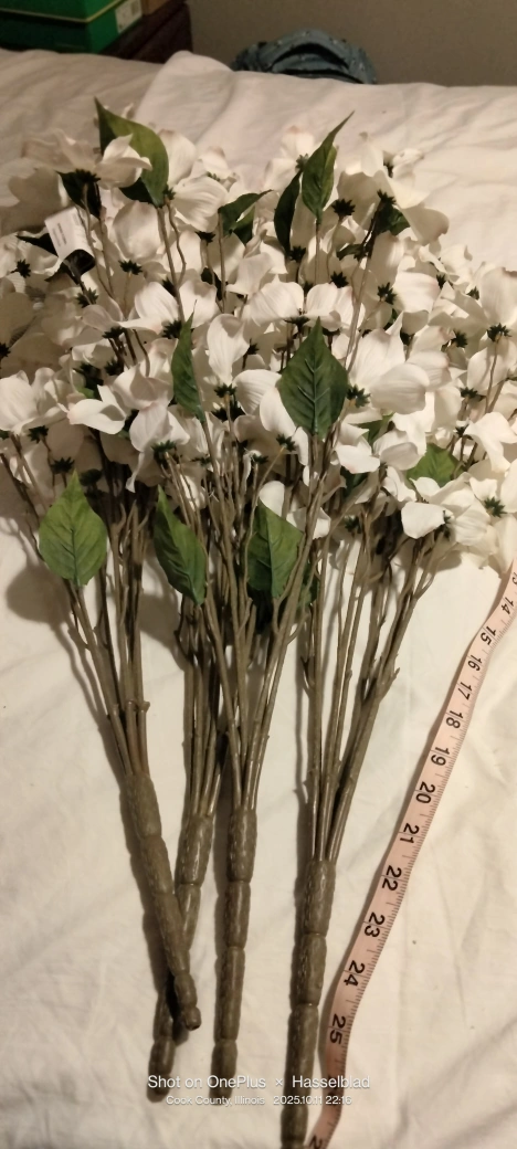 Aartificial white dogwood flower 4 stems. They measure approximately 27 " in length. New left over from our project. 4 stems for $30