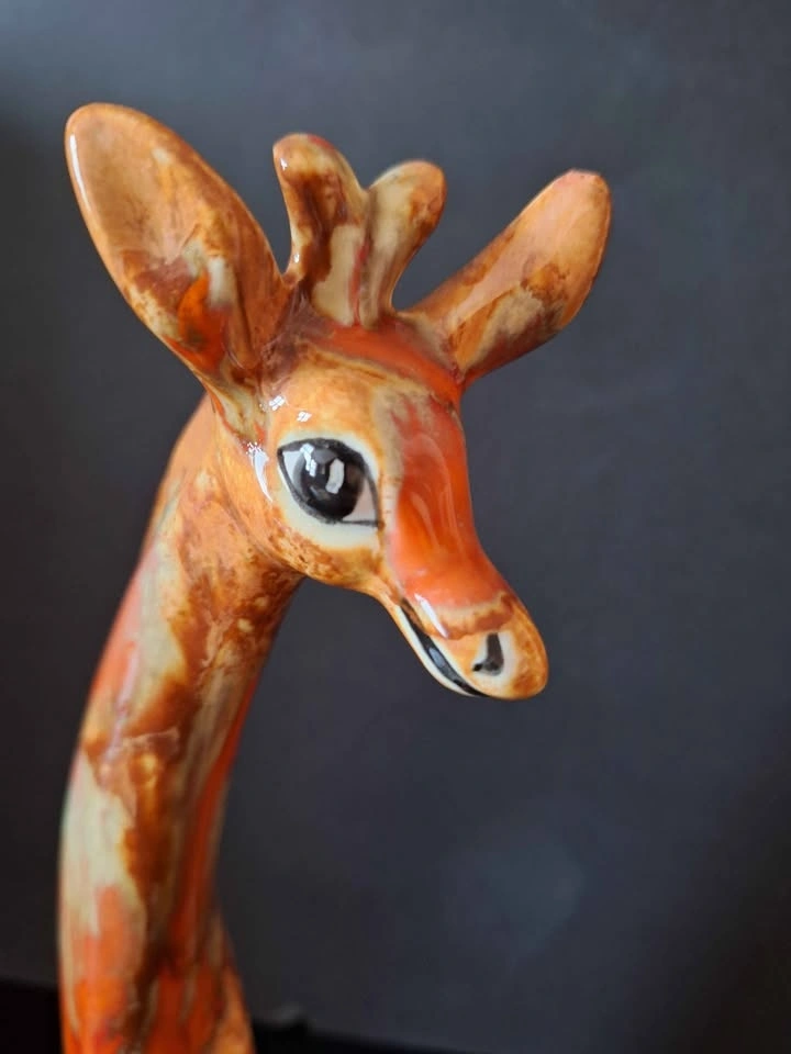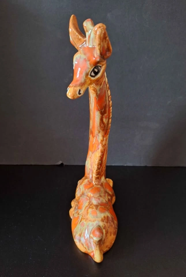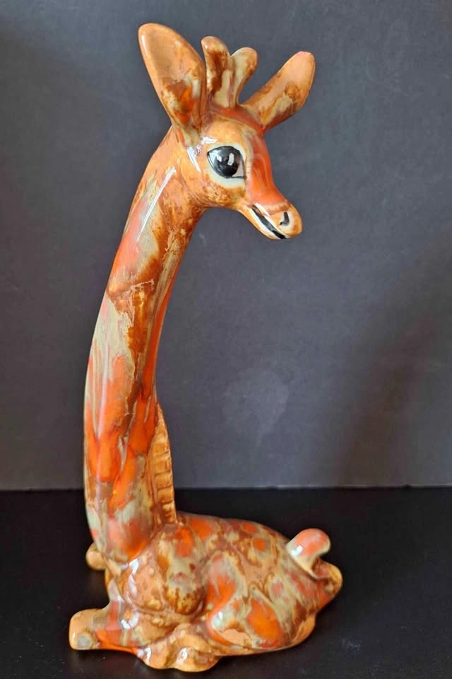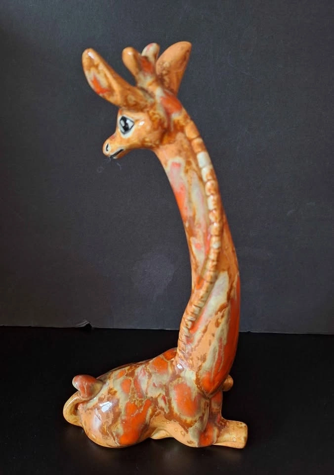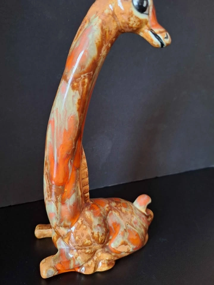 Beautiful giraffe figure with a graceful curved neck and gorgeous orange and gold bubble glaze. The gold glaze looks like bubbles over the orange, giving the giraffe its abstract pattern and spots. This figure would look beautiful on a bookshelf. In very good condition, there appears to be a small chip on the ear that was colored over. See photos. Approximately 9.25" tall.