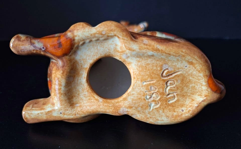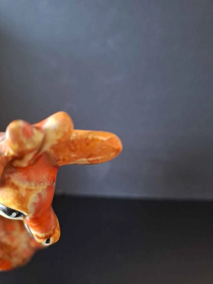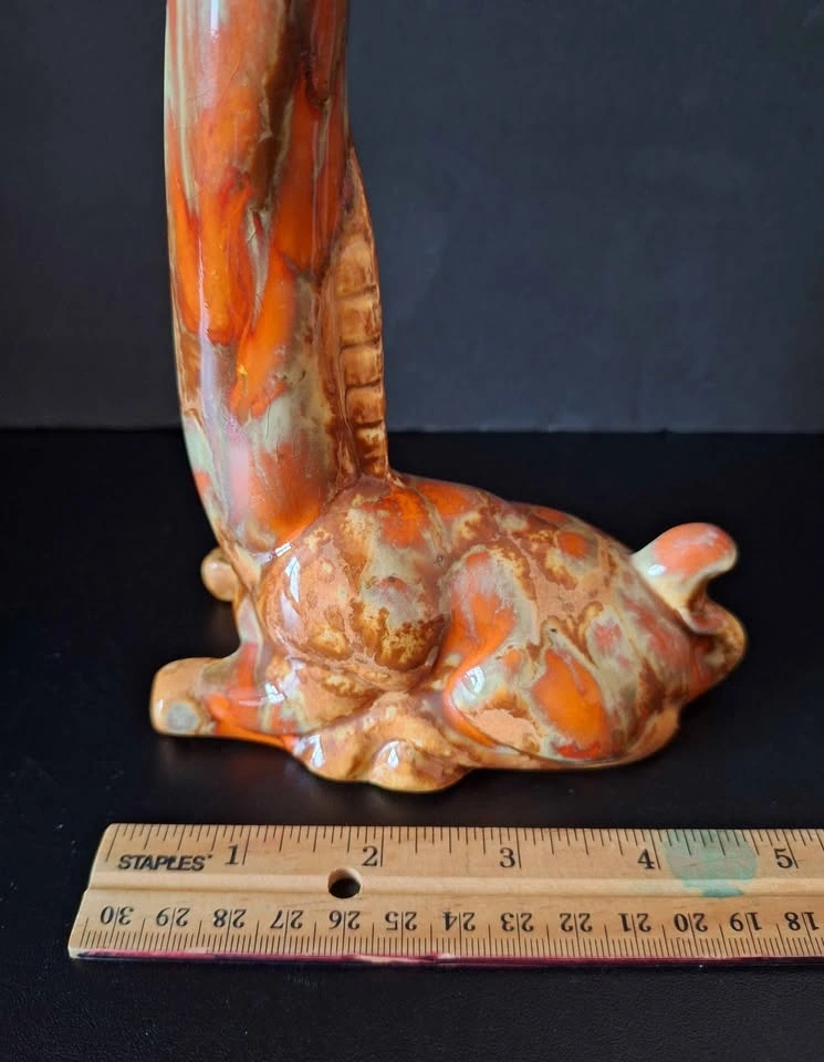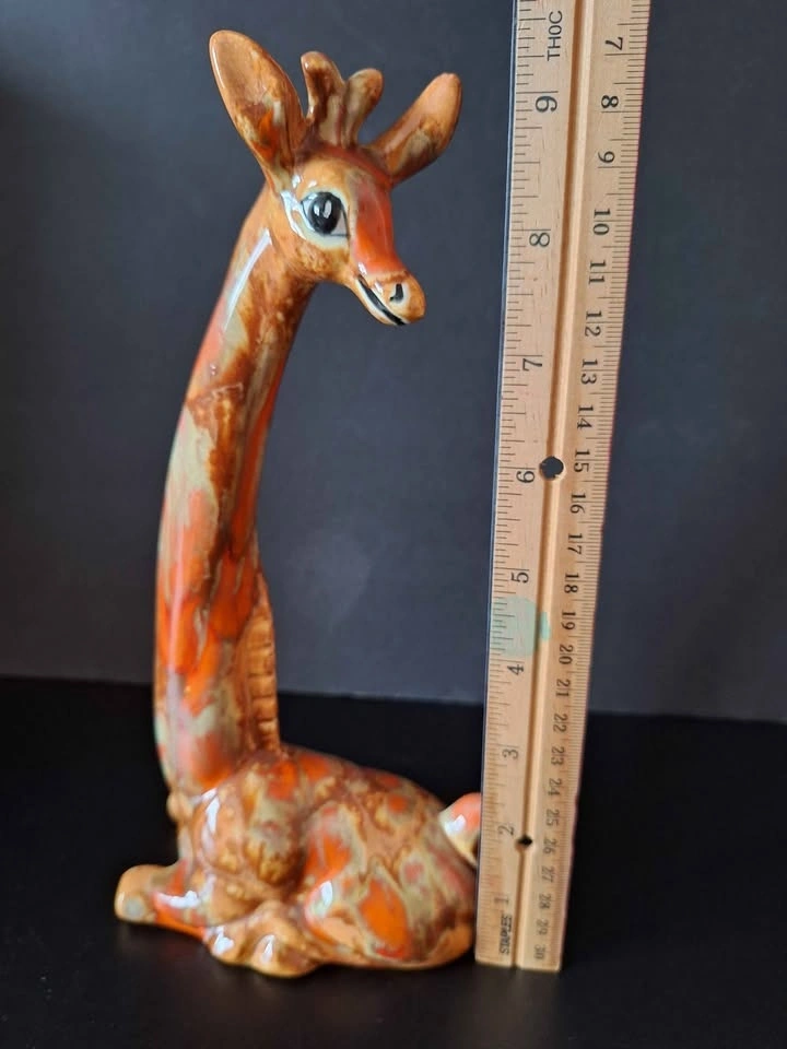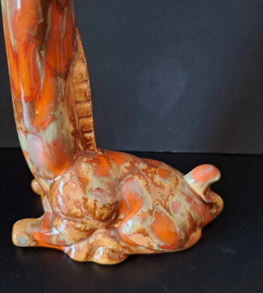 Beautiful giraffe figure with a graceful curved neck and gorgeous orange and gold bubble glaze. The gold glaze looks like bubbles over the orange, giving the giraffe its abstract pattern and spots. This figure would look beautiful on a bookshelf. In very good condition, there appears to be a small chip on the ear that was colored over. See photos. Approximately 9.25" tall.