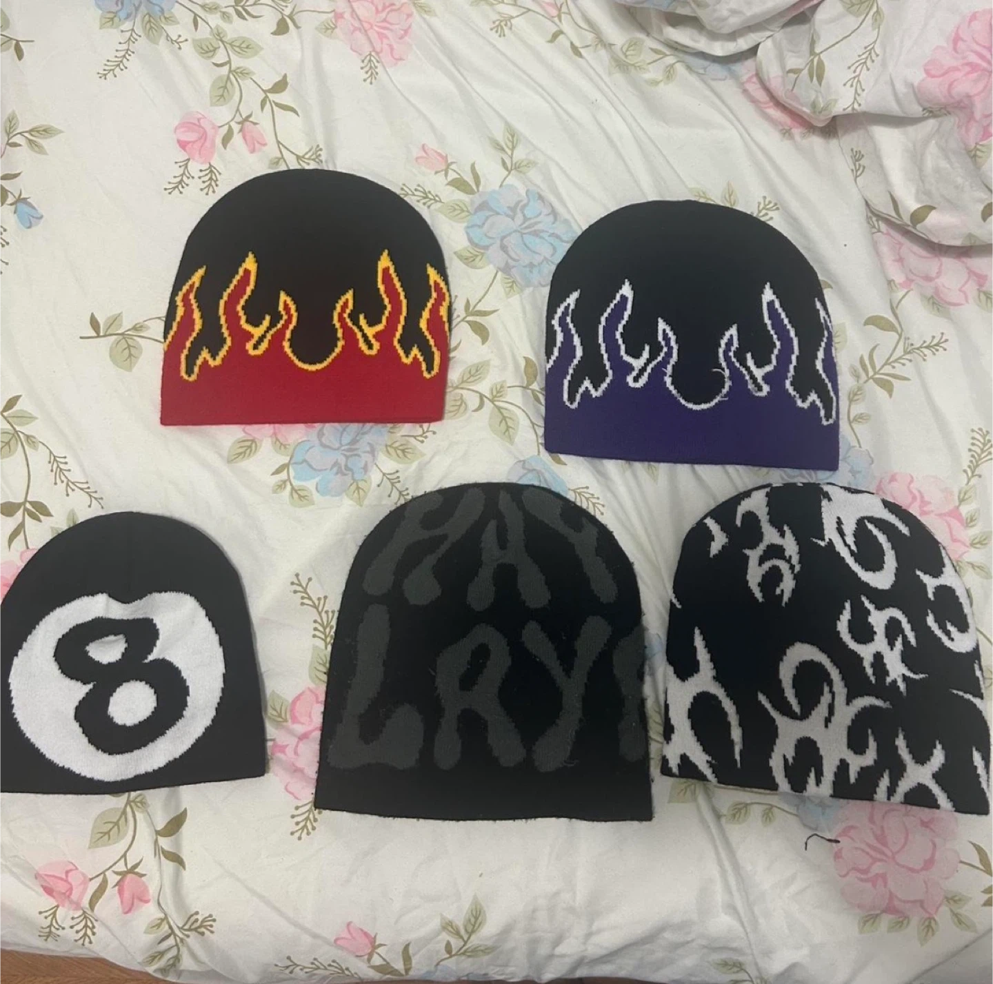 Selling a collection of beanie hats with various designs! There's one with a flame design, another with an 8-ball, and more. Perfect for adding some style to your outfits!