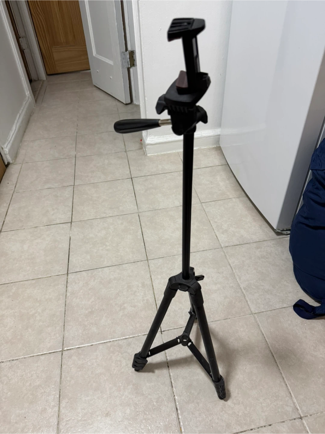 Selling a black tripod in good condition. It's perfect for taking photos or videos with your phone. It is lightweight and portable