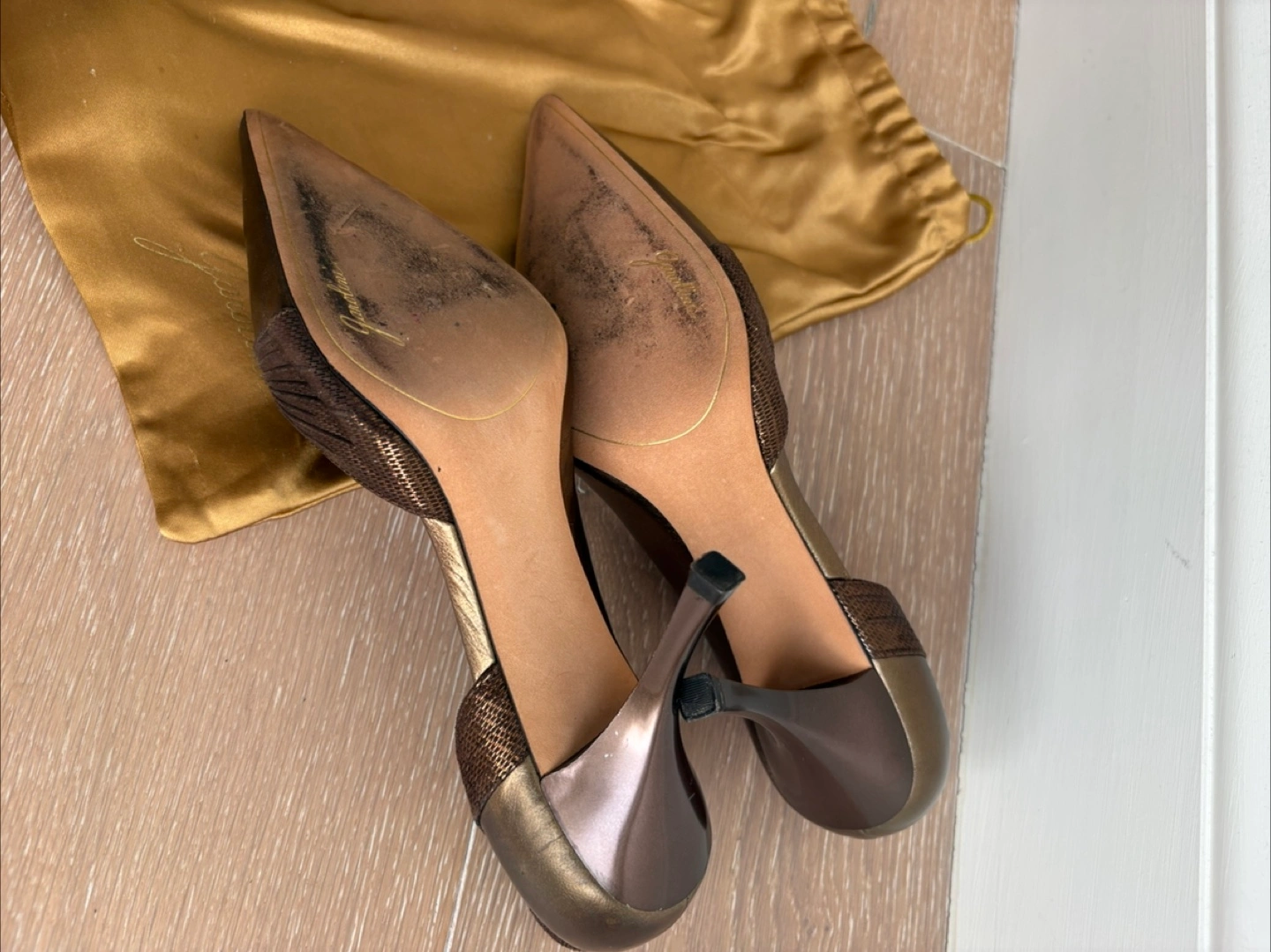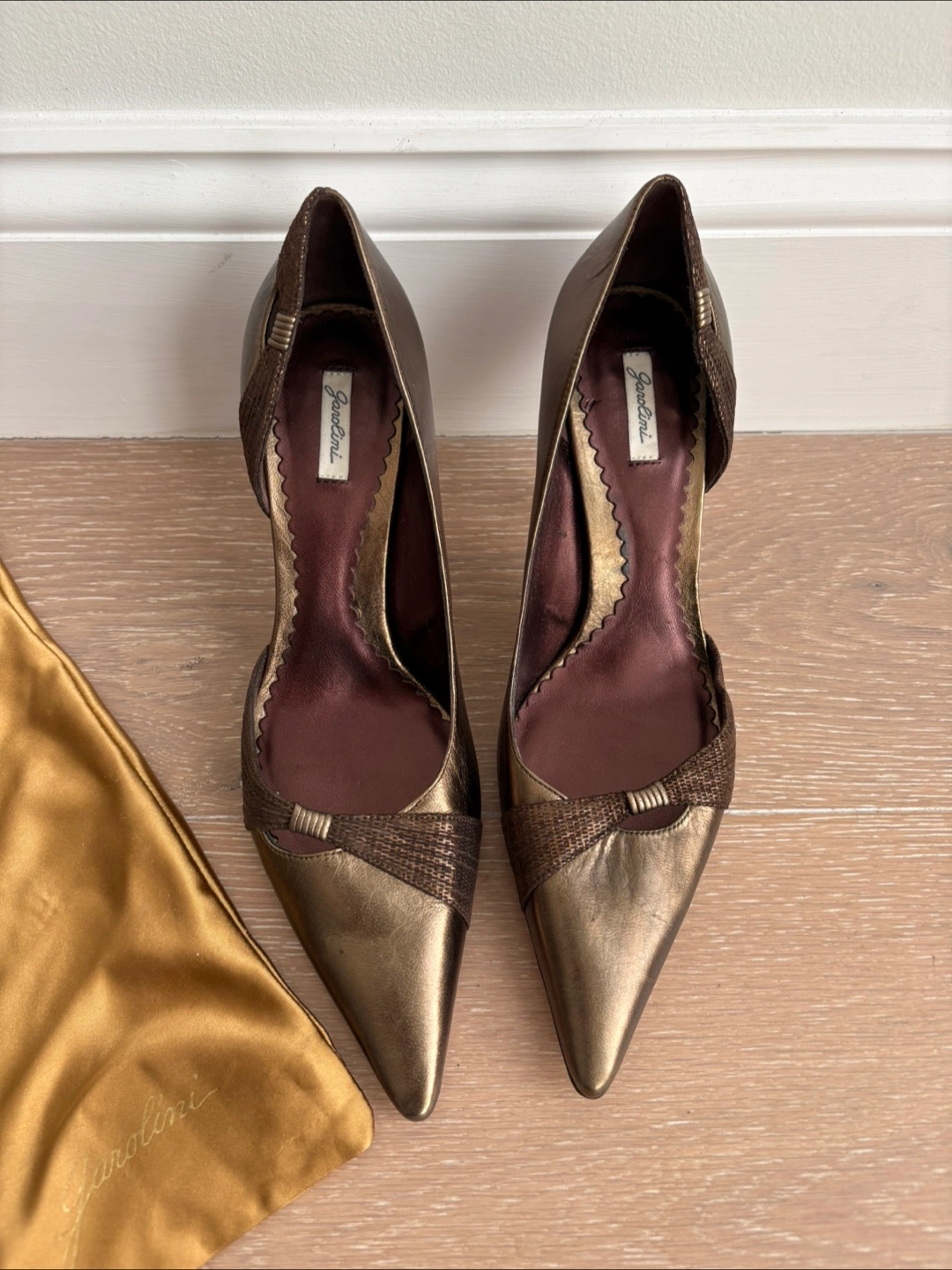 Elegant Garolini heels in a beautiful bronze metallic finish. They feature a sophisticated pointed toe and a comfortable heel height. Includes a soft gold dust bag for storage.