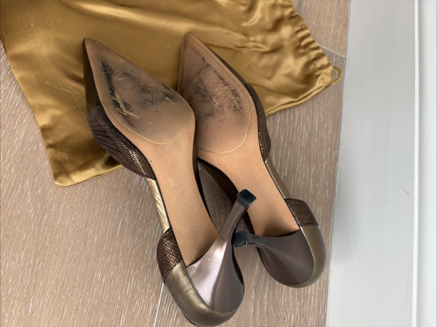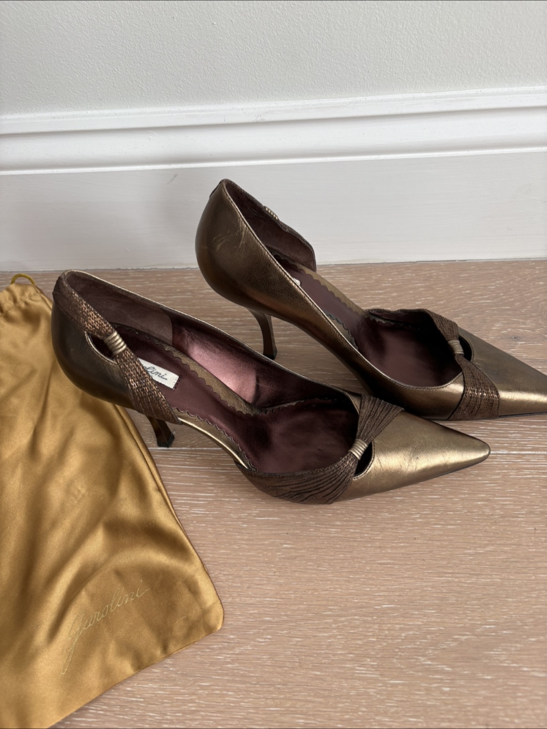 Elegant Garolini heels in a beautiful bronze metallic finish. They feature a sophisticated pointed toe and a comfortable heel height. Includes a soft gold dust bag for storage.