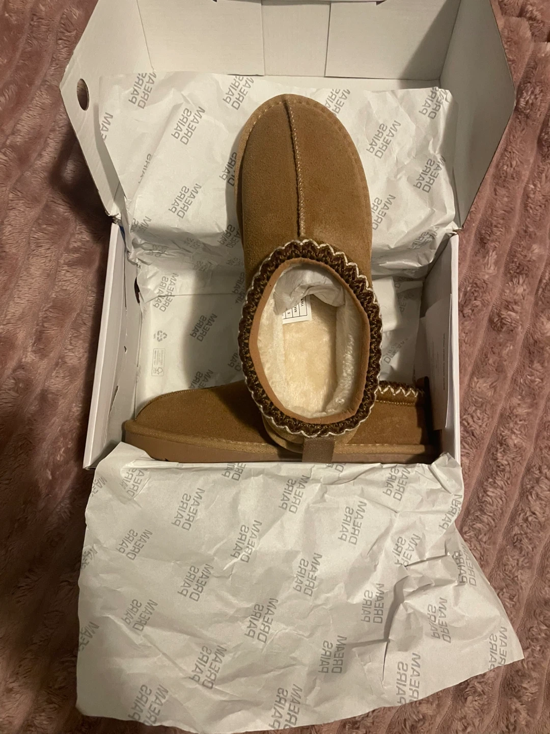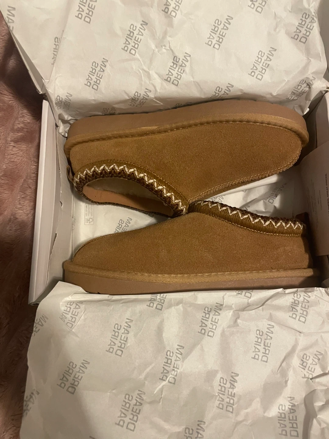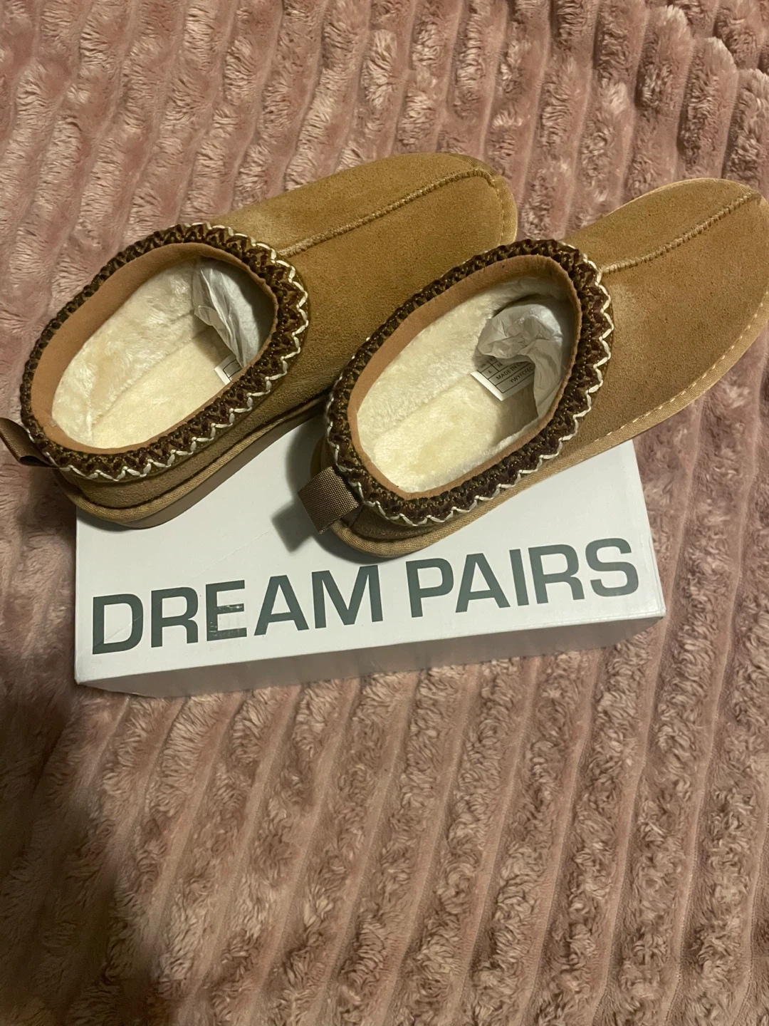 Cozy Dream Pairs slippers in chestnut color, size US 6! These are in great condition and come with the original box. They're super comfy and perfect for wearing around the house.