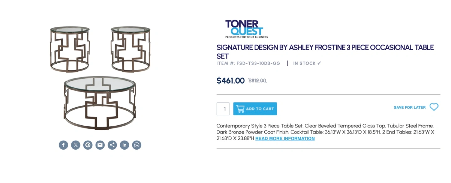 Selling an Ashley Frostine 3-piece occasional table set. It features a contemporary style with clear beveled tempered glass tops and a tubular steel frame with a dark bronze powder coat finish. The cocktail table measures 36.13"W x 36.13"D x 18.5"H, and the two end tables each measure 21.63"W x 21.63"D x 23.88"H. Originally bought for $461 $200 OBO Three Piece Set Pick up in 60612