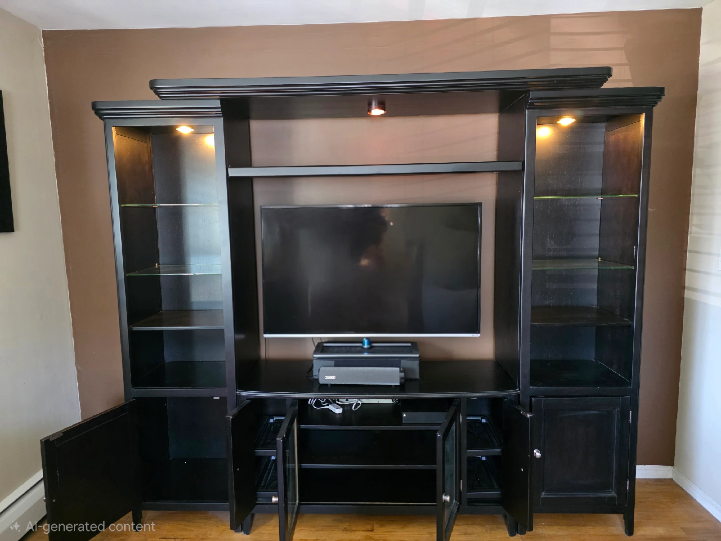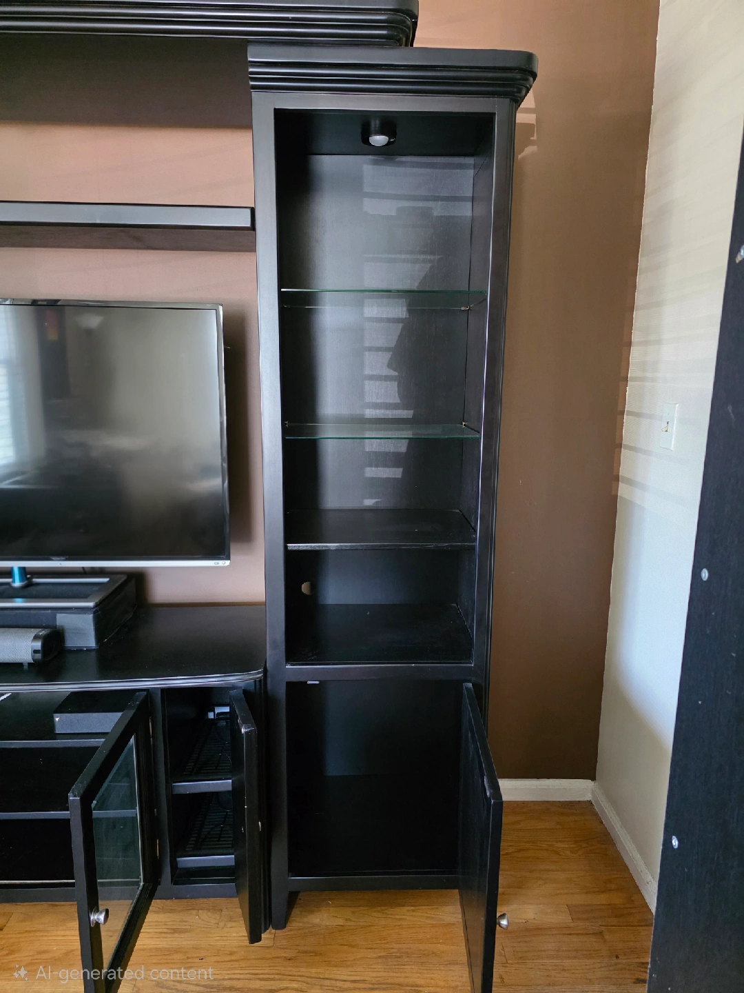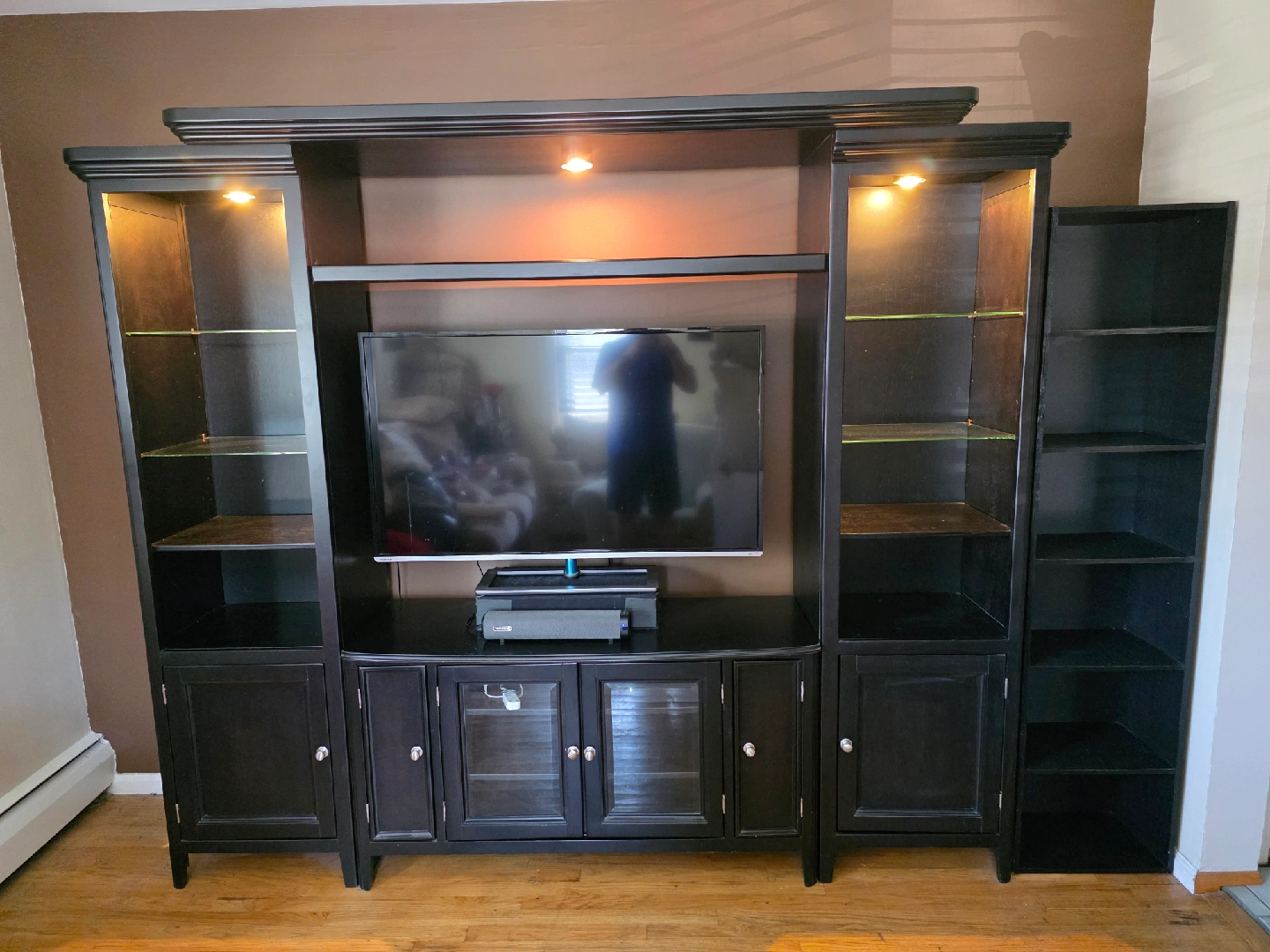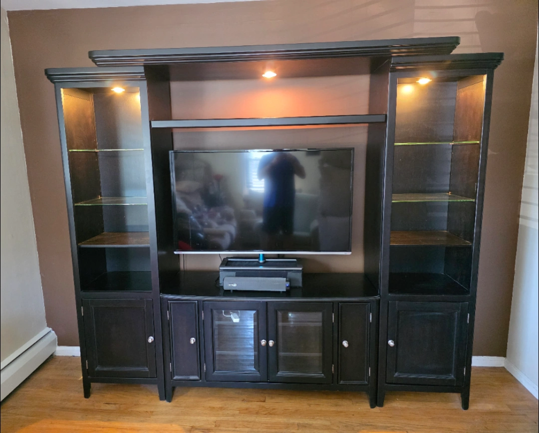 Selling a black entertainment center! It features glass shelves and plenty of storage space for your media devices and accessories. It's in great condition and ready to enhance your living room setup 94" Wide 20" Deep 80" Tall Available side book cases for an additional $40.00