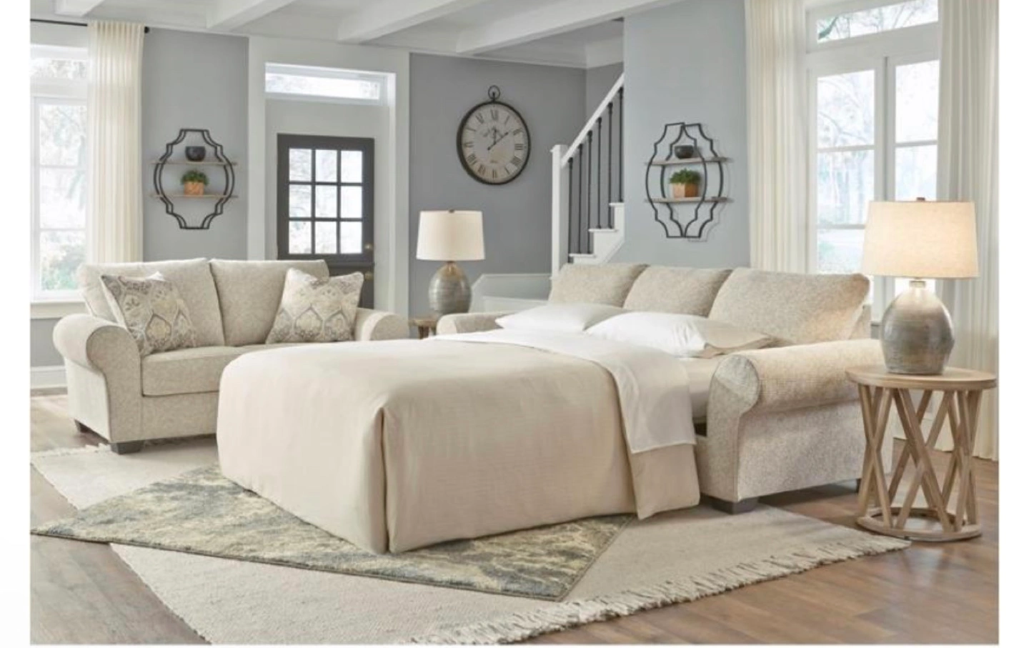 Blending classic elements like sumptuous flared roll arms with tailored box cushions and tapered black feet for up-to-date appeal, this sofa sleeper exudes that transitional aesthetic that looks and feels right at home. Offering plenty of room for everyone to make themselves comfortable, this large-scale sofa is wrapped in a soft, chunky weave fabric loaded in texture. Light and lovely ivory upholstery makes for such an easy-breezy blend. Made of quality memory foam, the pull-out queen mattress comfortably accommodates overnight guests. Features: Corner-blocked frame Attached back and loose seat cushions High-resiliency foam cushions wrapped in thick poly fiber Polyester upholstery Throw pillows included Pillows with soft polyfill Exposed tapered feet Included bi-fold queen memory foam mattress sits atop a supportive steel frame Memory foam provides better airflow for a cooler nightÕs sleep Memory foam encased in damask ticking Dimensions: 102''W x 41''D x 40''H Material: Fabric Color: Ivory Item: Queen Sofa Sleeper Collection Name: Haisley