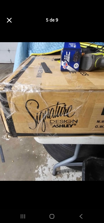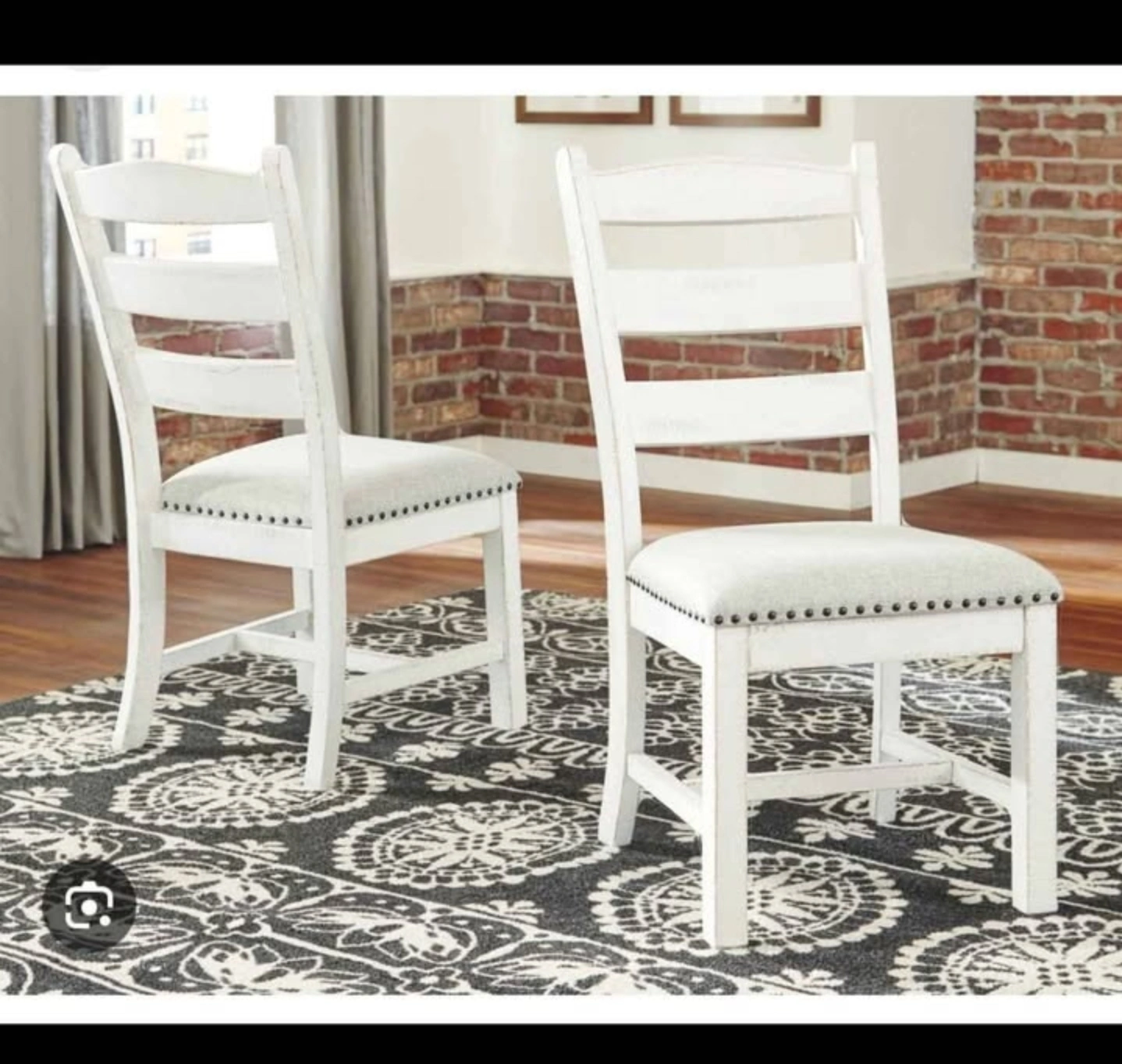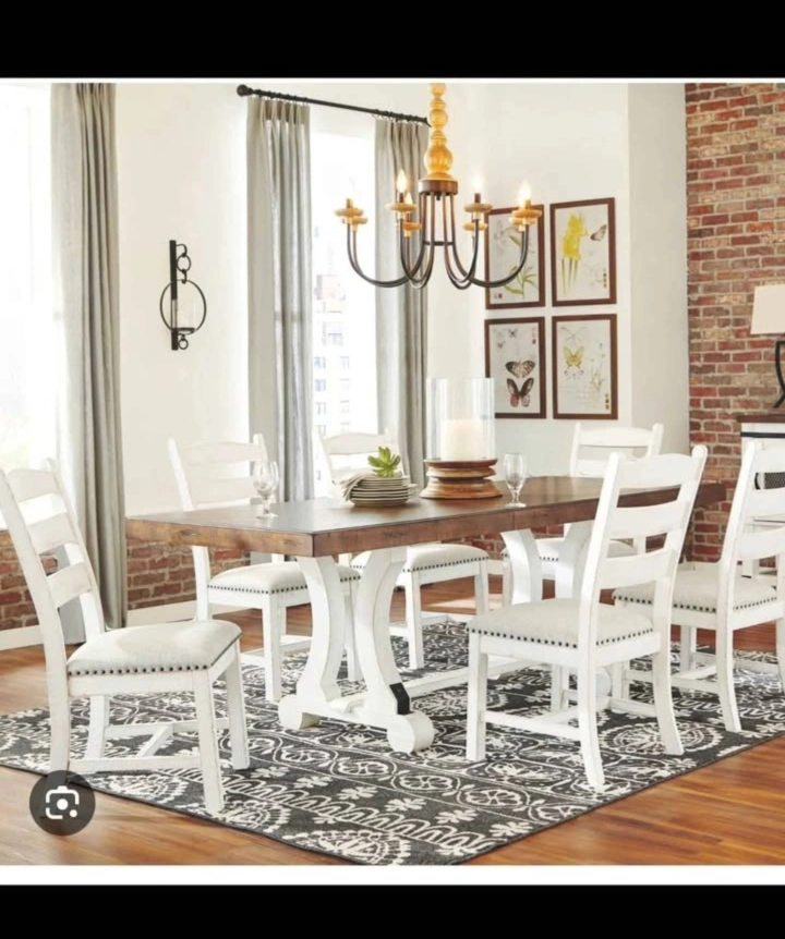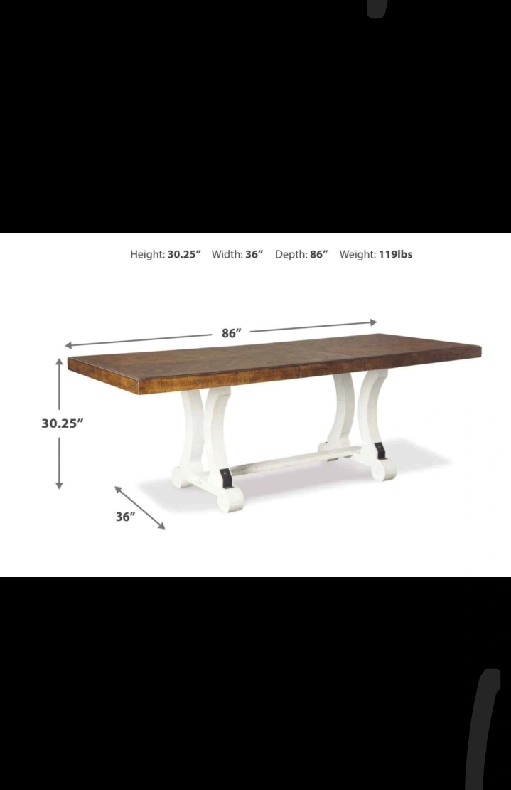 Selling an Ashley Signature Design dining table with 6 chairs! The table features a brown top and white base, while the chairs are white with light gray cushioned seats. Table dimensions: - Height: 30.25" - Width: 36" - Depth: 86" - Weight: 119lbs Comes with the original box