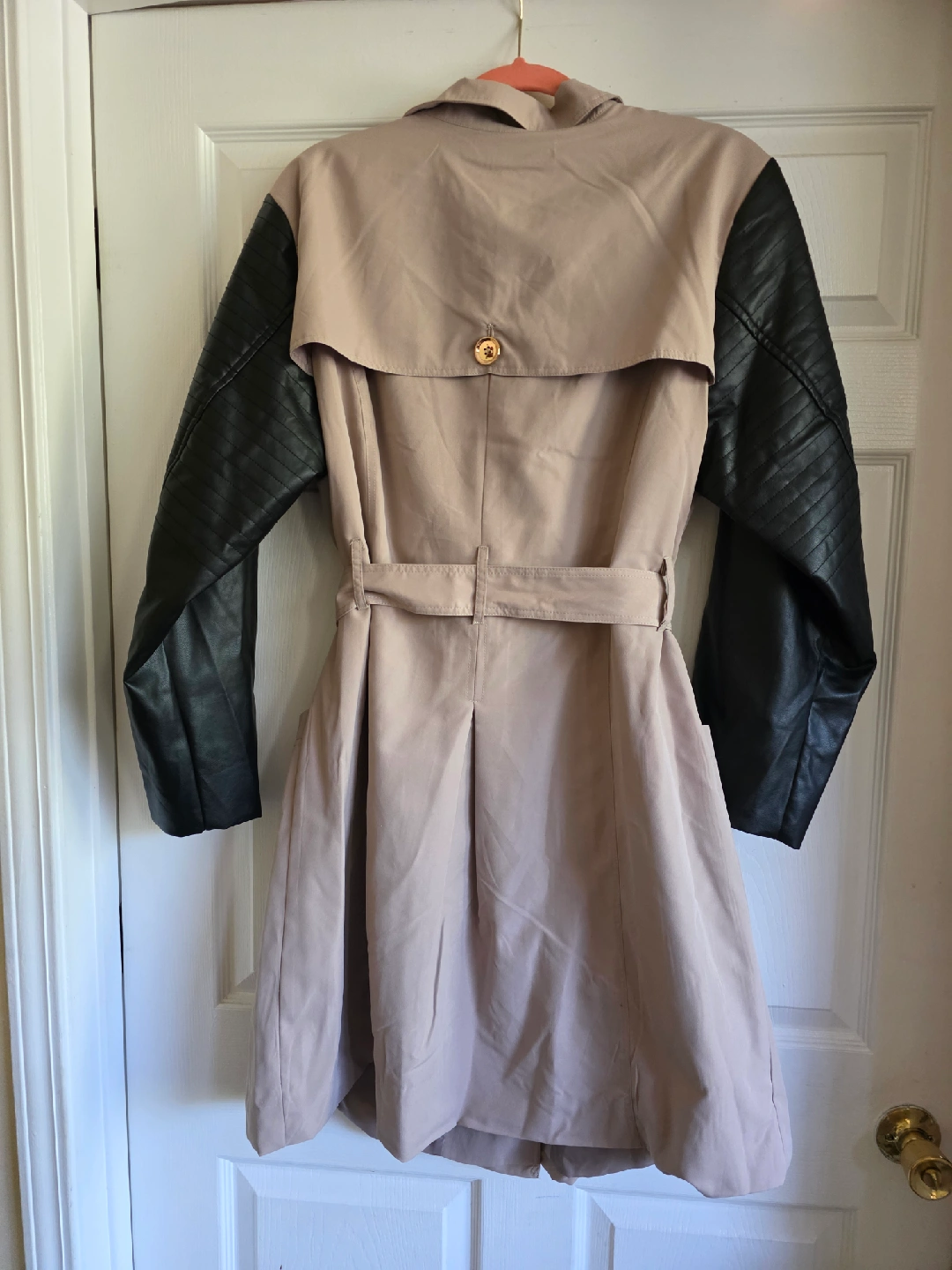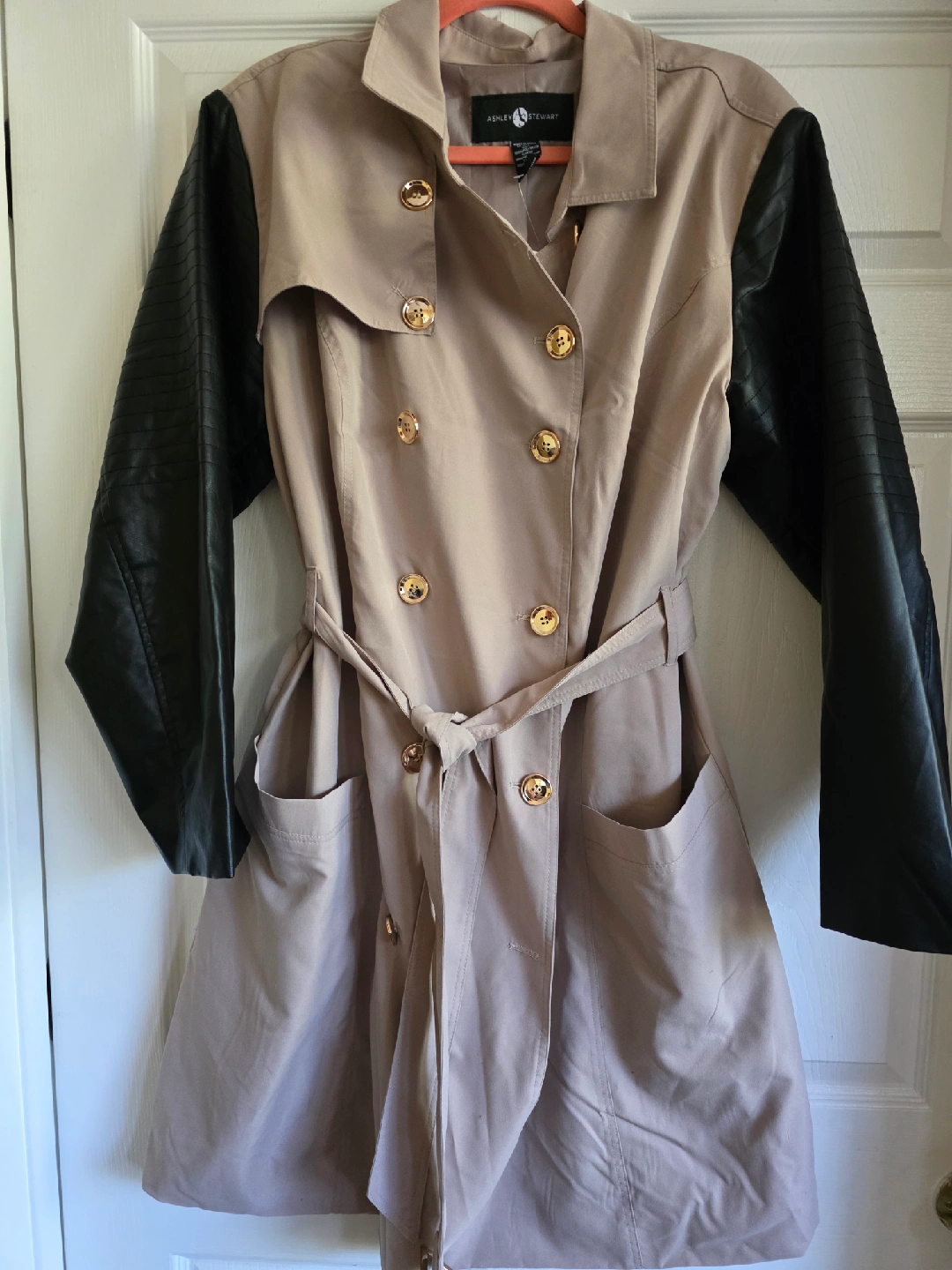 Selling an Ashley Stewart trench coat in beige and black! It features a double-breasted design with gold-tone buttons and a tie waist. The sleeves are black faux leather, adding a stylish contrast to the beige body of the coat. It's a size 16 and in great condition