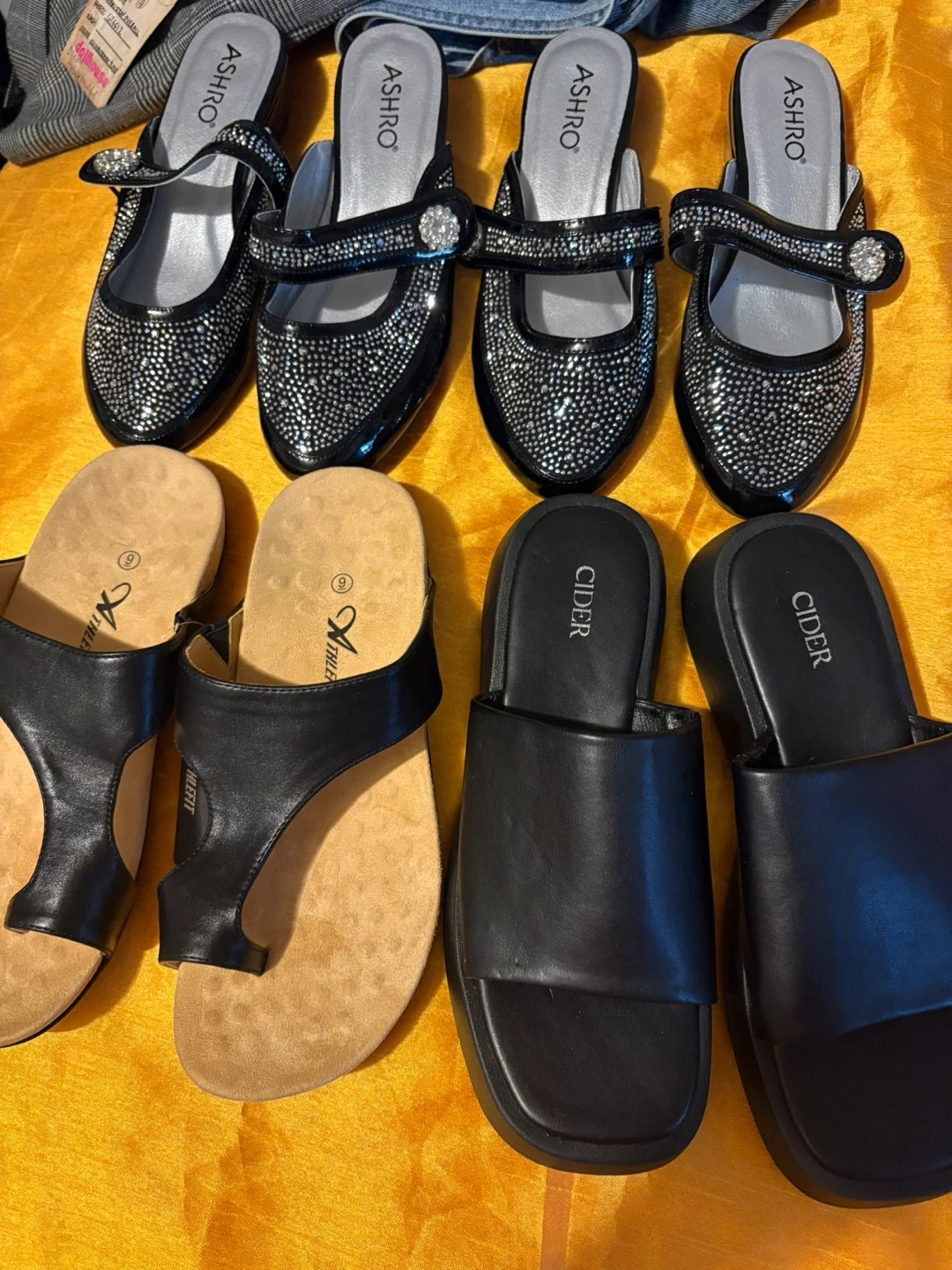 Selling a few pairs of shoes! There are Ashro heels with rhinestone details and Cider black slides. Both are size 6.