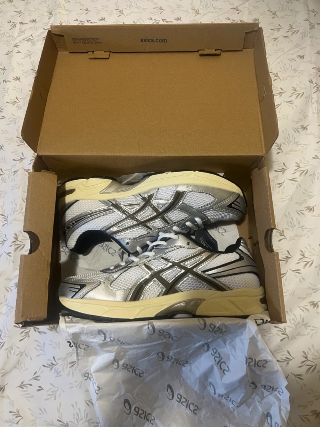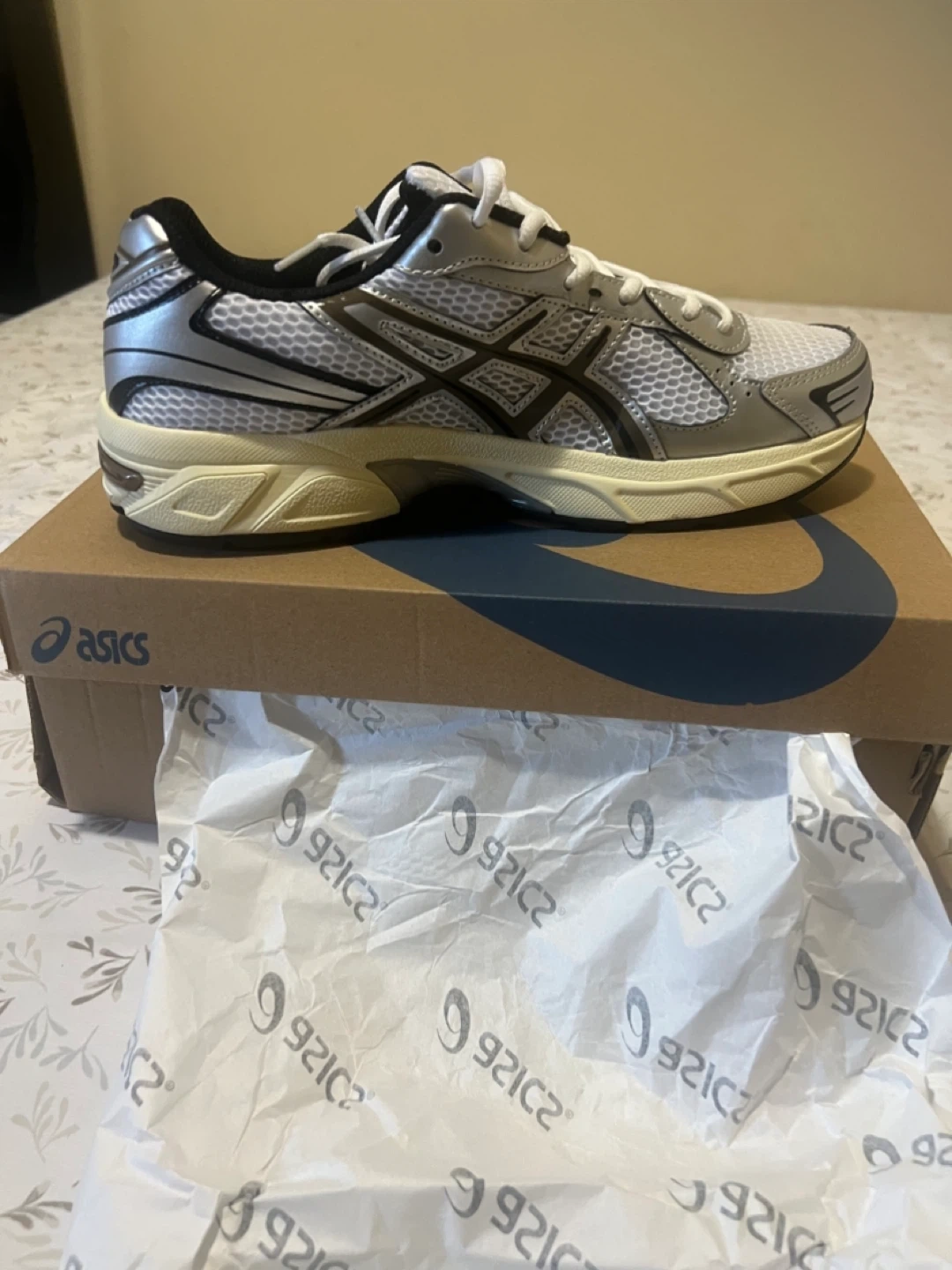 Selling a pair of Asics Gel-1130 sneakers in white and pure silver, size 9.5. These come with the original box and packaging. They are in great condition and ready for a new home!