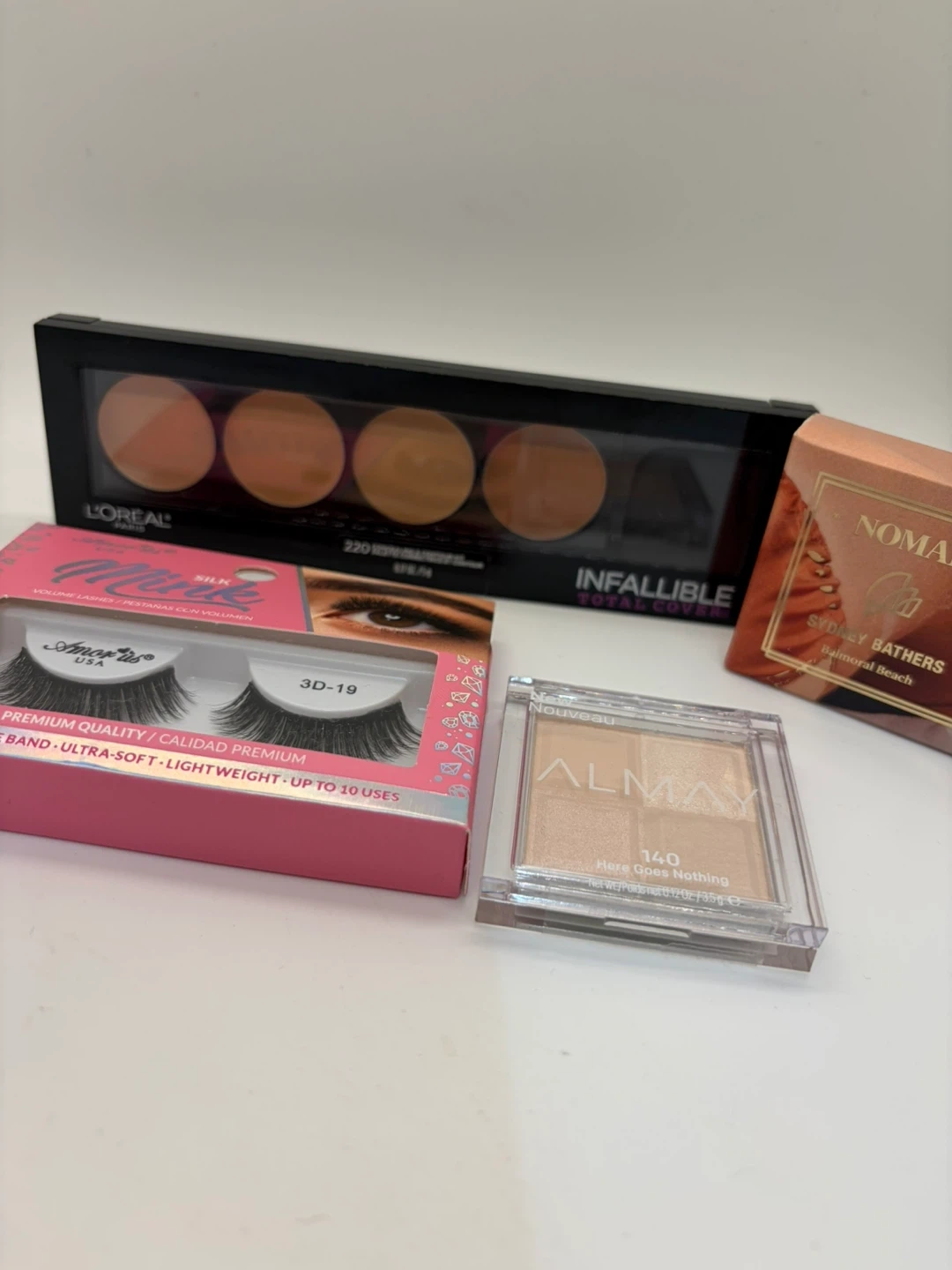183Selling a few makeup items: - L'Oreal Paris Infallible Total Cover Concealer Palette - Amor Us Silk 3D-19 Lashes, premium quality, ultra-soft, lightweight, up to 10 uses - Almay Nouveau 140 Here Goes Nothing Highlighter - Nomad Sydney Bathers Balmoral Beach Bronzer