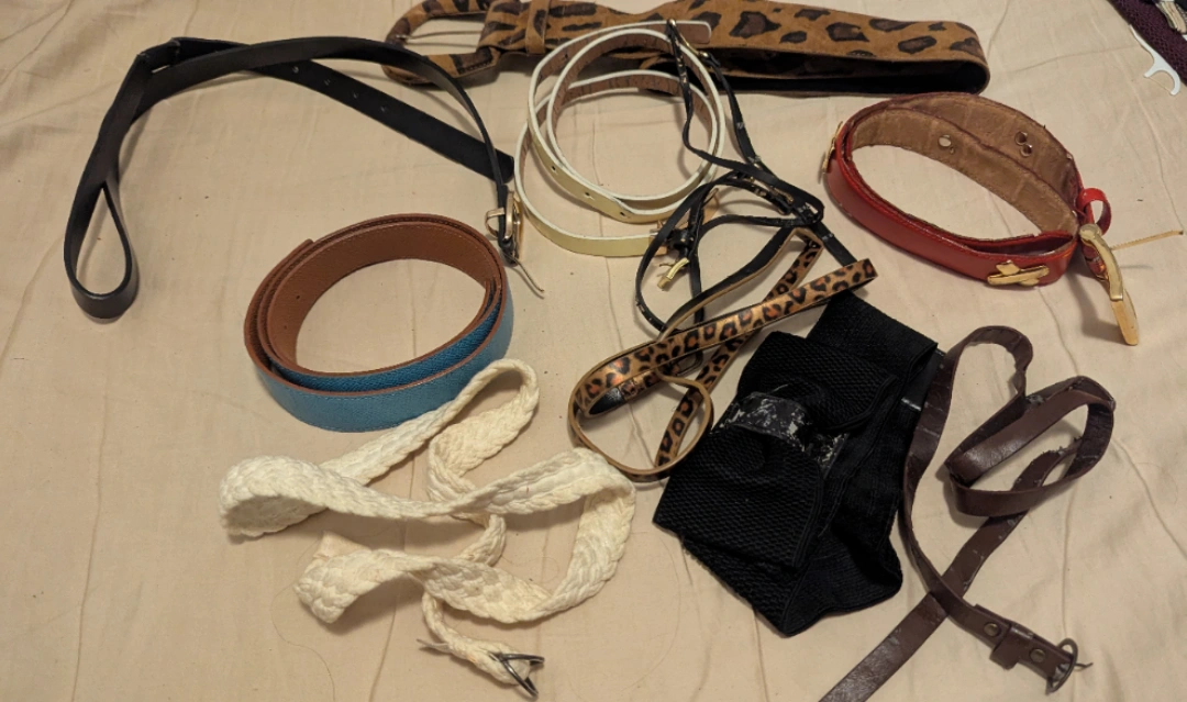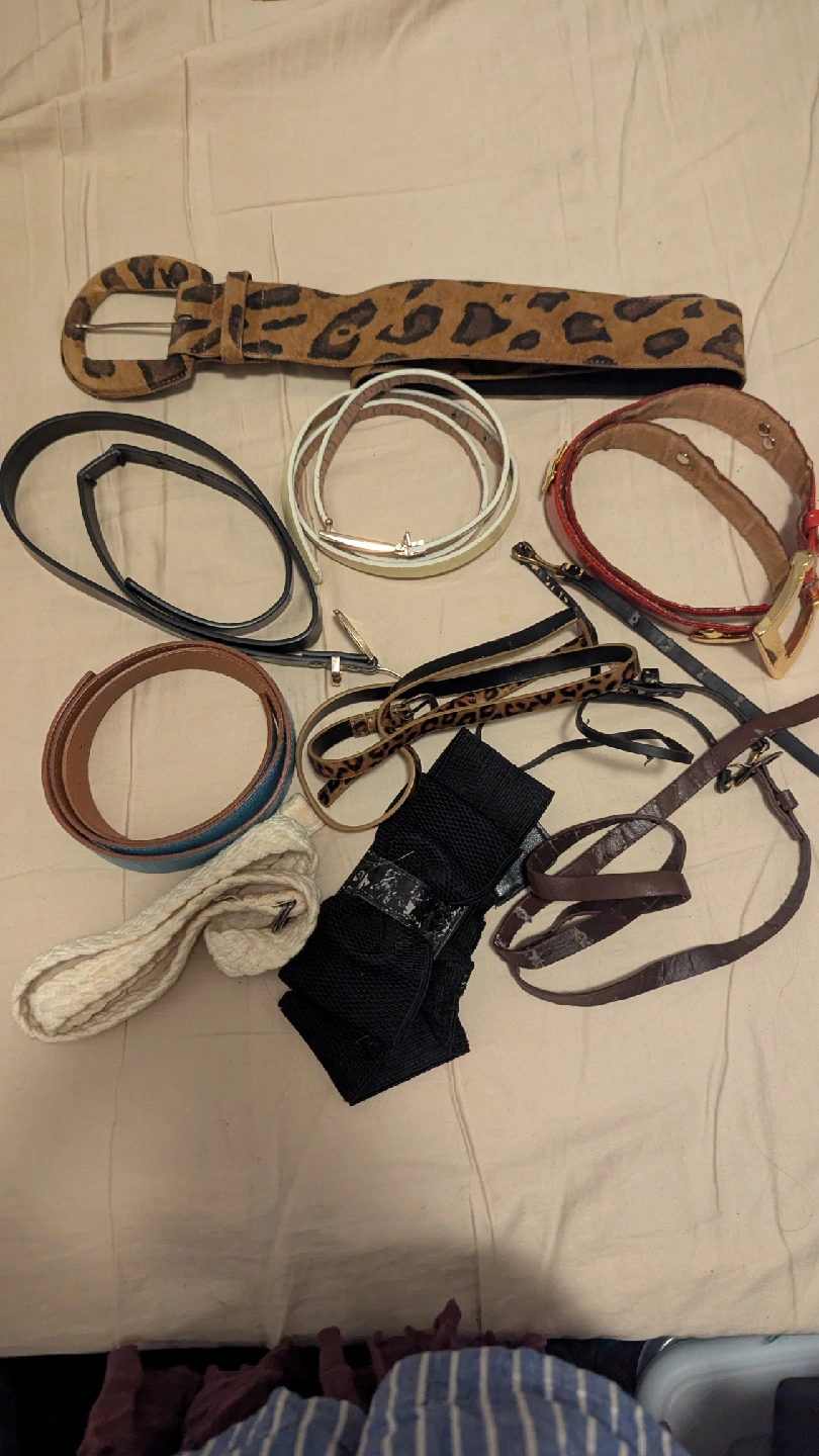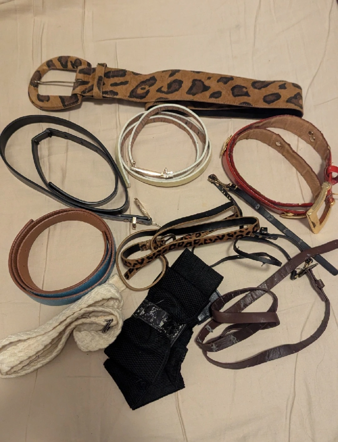 Selling a collection of assorted belts. There are various styles and colors. They are in used condition, some in much better shape than others! Some fraying on the leather ones, but they all work .