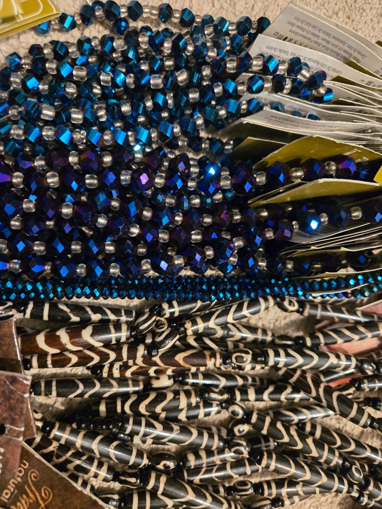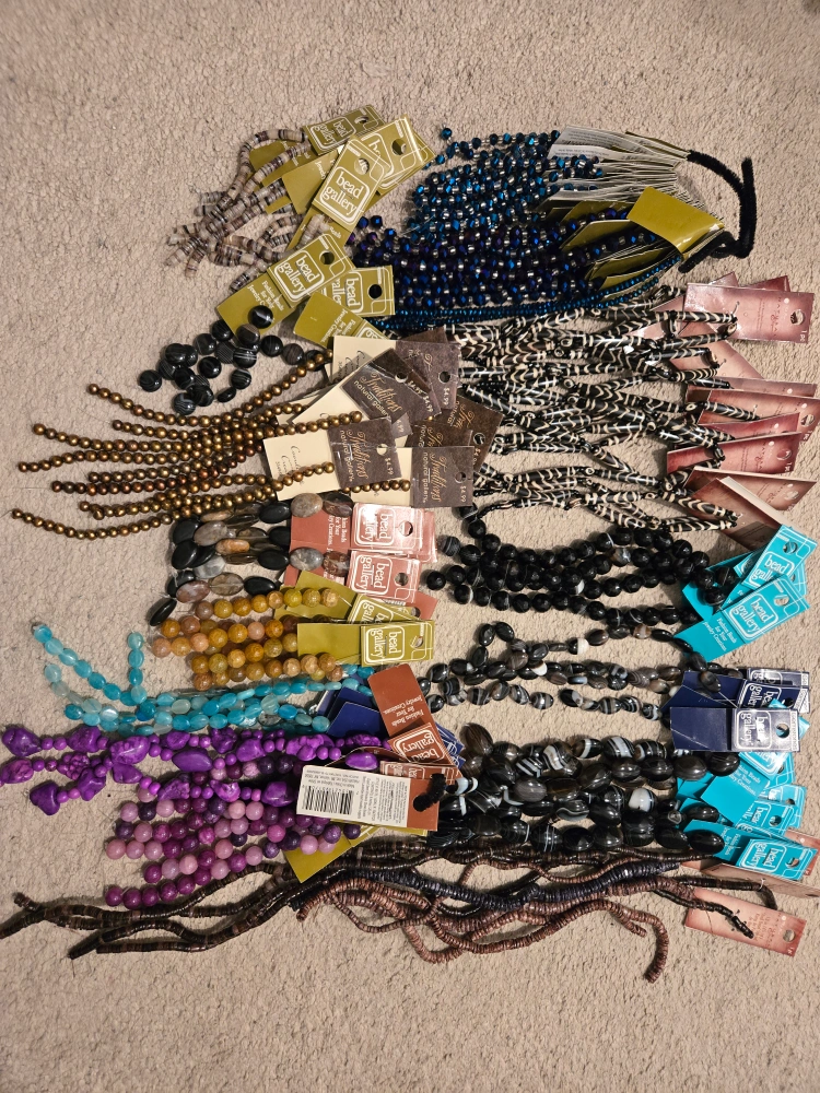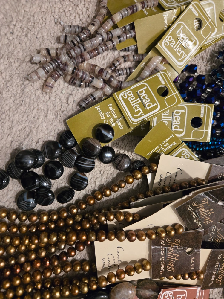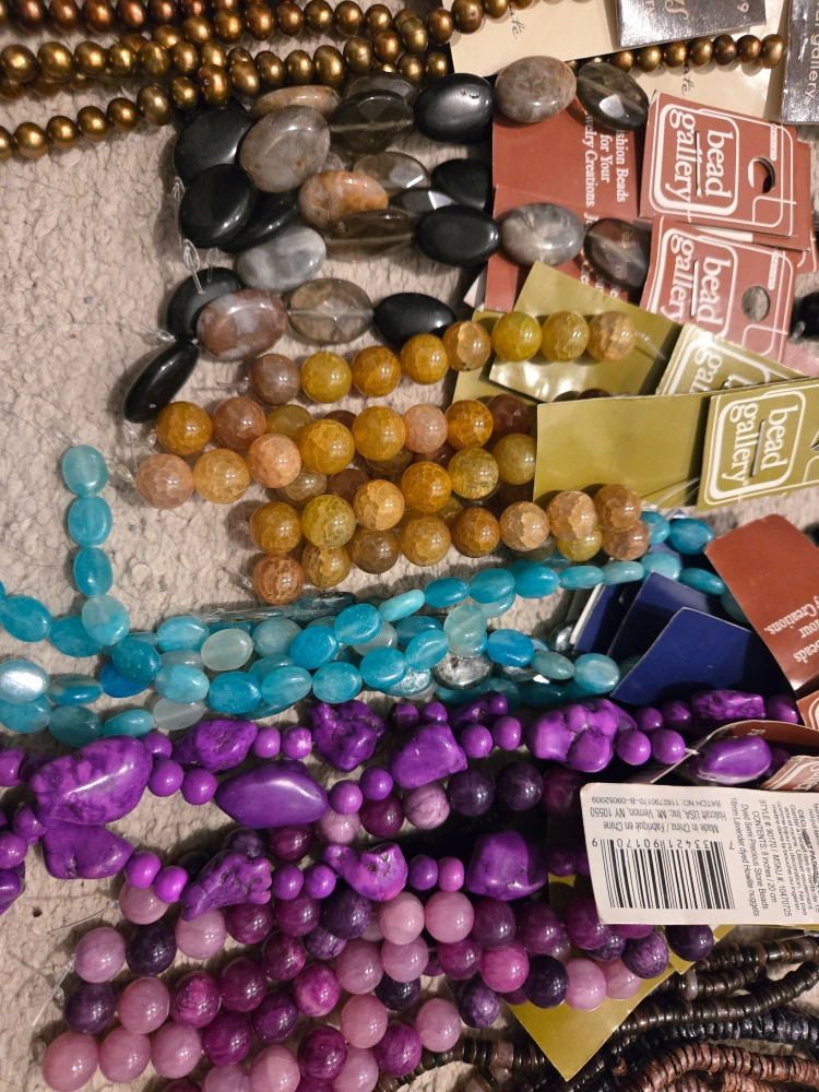 Large variety of beads. Multiple colors and styles. Includes stones, glass, and other materials. Perfect for jewelry making or crafting projects. Sold as a lot.