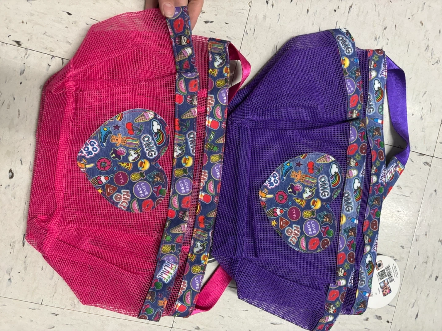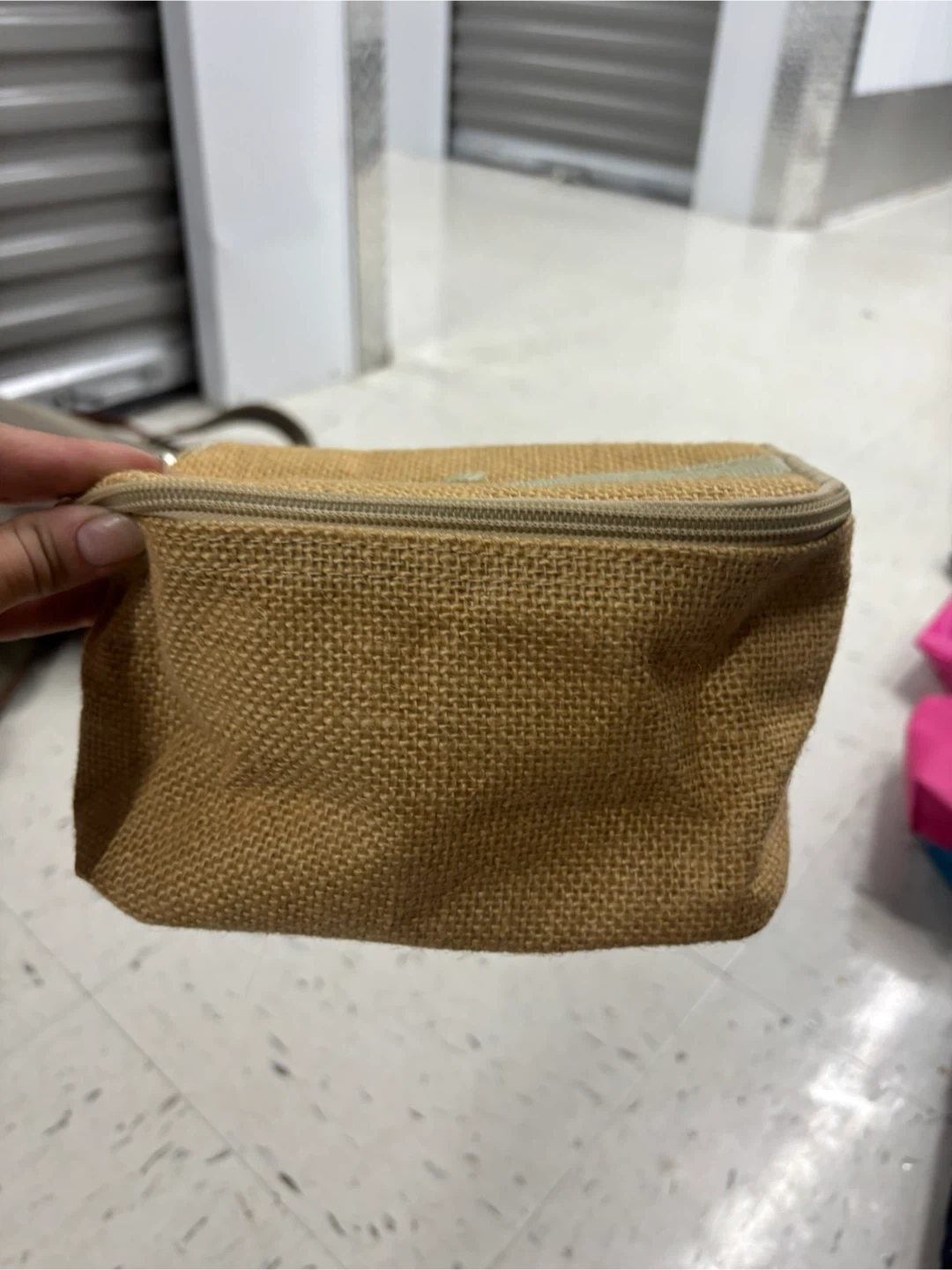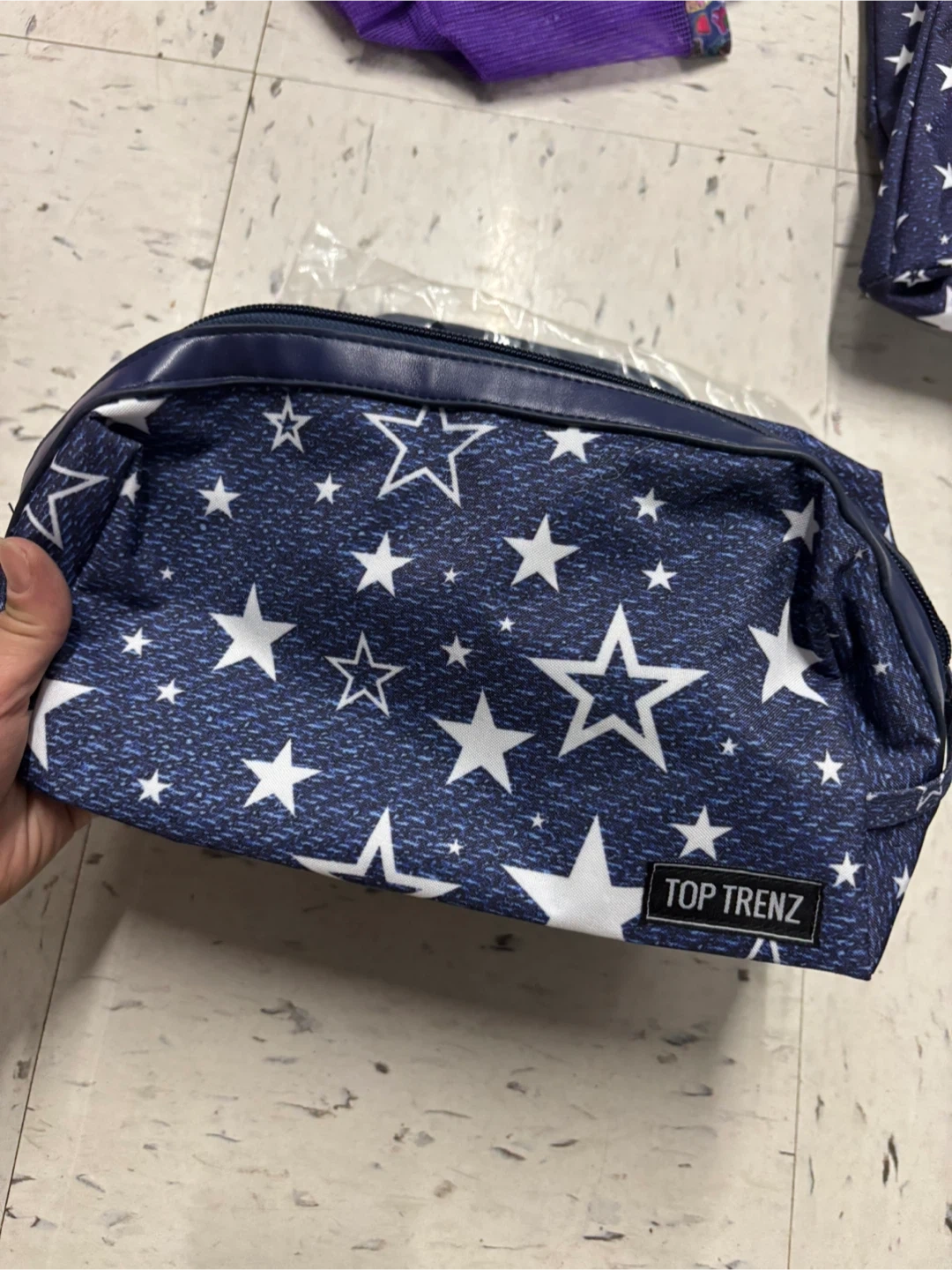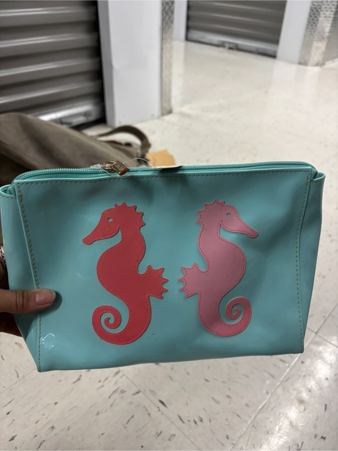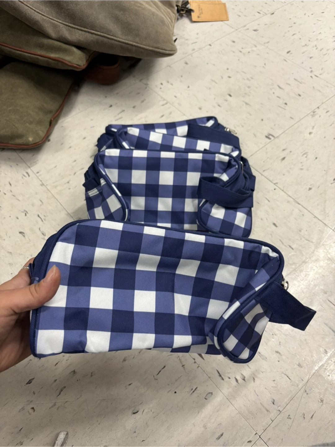 Selling a variety of cosmetic and travel bags. There's a burlap bag, a blue and white checkered bag, a light blue bag with seahorses, and light blue bags with a diamond ring design. Also, there are light blue luggage tags that say "Hands Off"