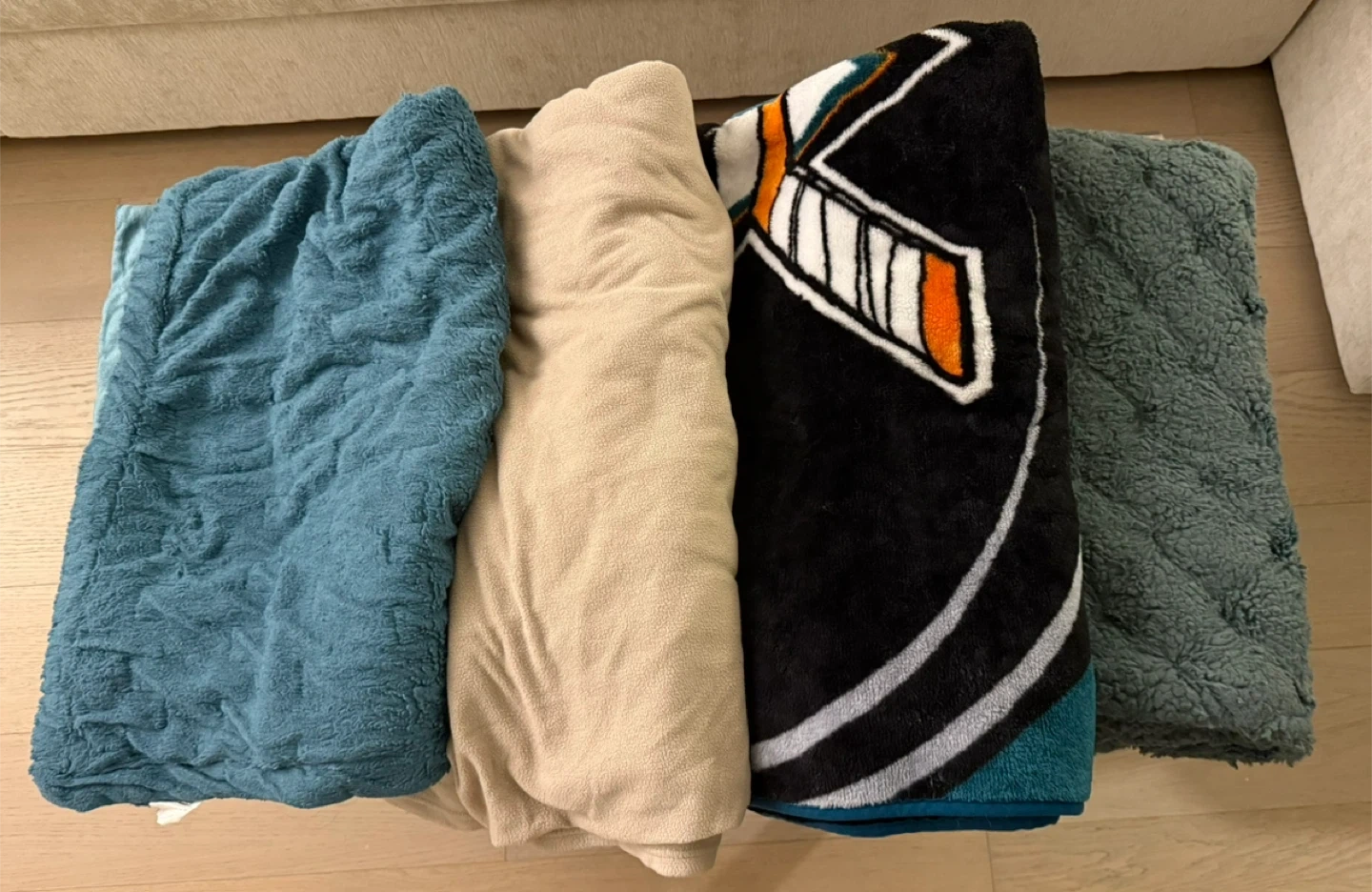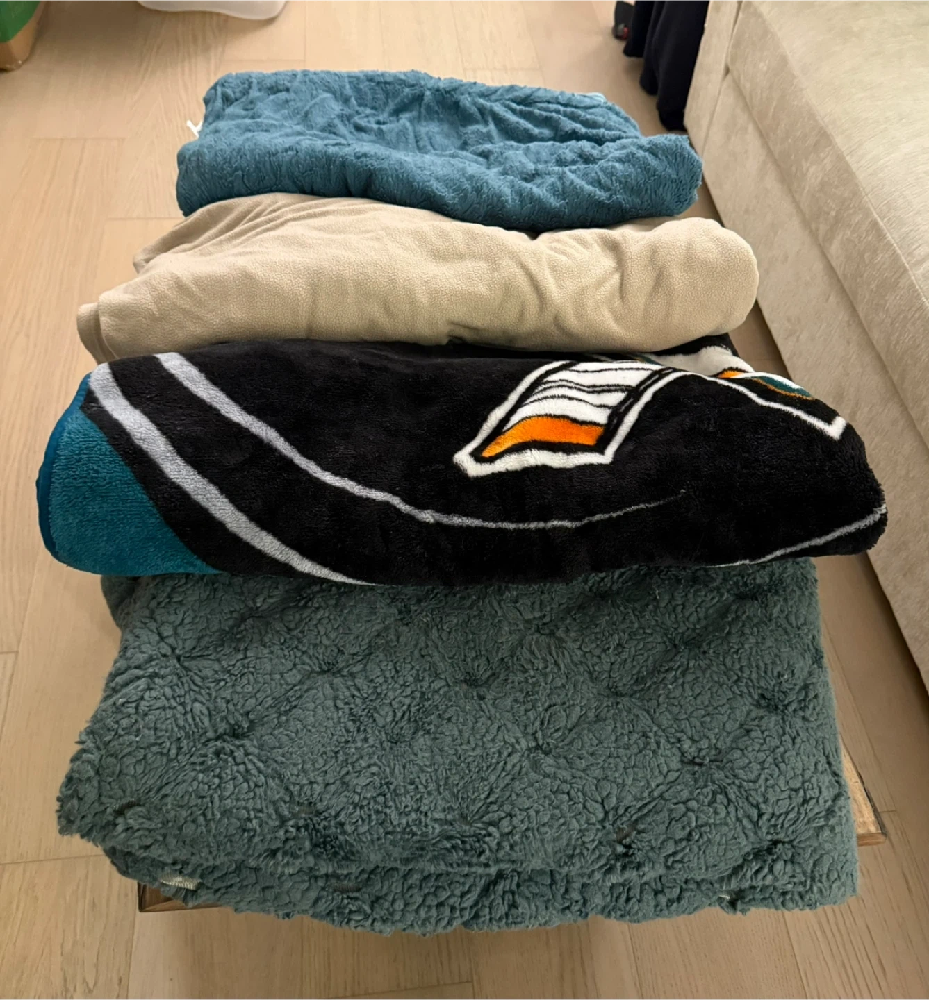 68plush blankets, perfect for the upcoming colder months! All are gently used, clean, and in great condition. Ideal for couches, beds, guest rooms, or movie nights! Included in the bundle: ๐ฉต 2 soft teal blue plush throws (slightly different textures) ๐ค 1 beige fleece queen sized blanket โ lightweight and cozy ๐ 1 black blanket featuring a San Jose Sharks design โ perfect for any fan! ๐ง 1 deep green textured throw โ ultra warm with a sherpa-like feel Cash and pick up only in Jersey City.