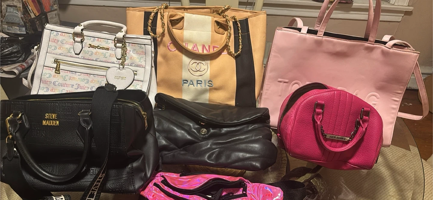 Selling a variety of designer purses! There's a Juicy Couture purse with the brand's name printed all over, a black Steve Madden purse, and a Chanel-style tote bag with 'Chanel Paris' on it. All purses are in good condition and ready for a new home Each purse is $25 each, the fanny is $8 If you buy more than one you get a deal!