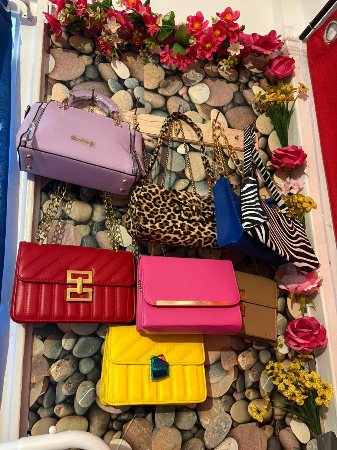 I have a selection of fashionable handbags available. There are several colors and styles to choose from, including a leopard print, a zebra print, and solid colors like red, pink, yellow, and blue. They're perfect for adding a pop of color to any outfit!