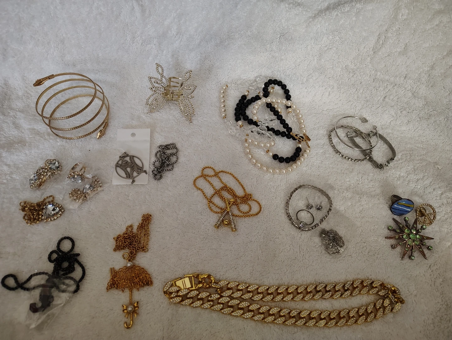 15Here's a collection of assorted fashion jewelry! There are necklaces, bracelets, rings, and earrings. Perfect for adding some sparkle to your outfits!