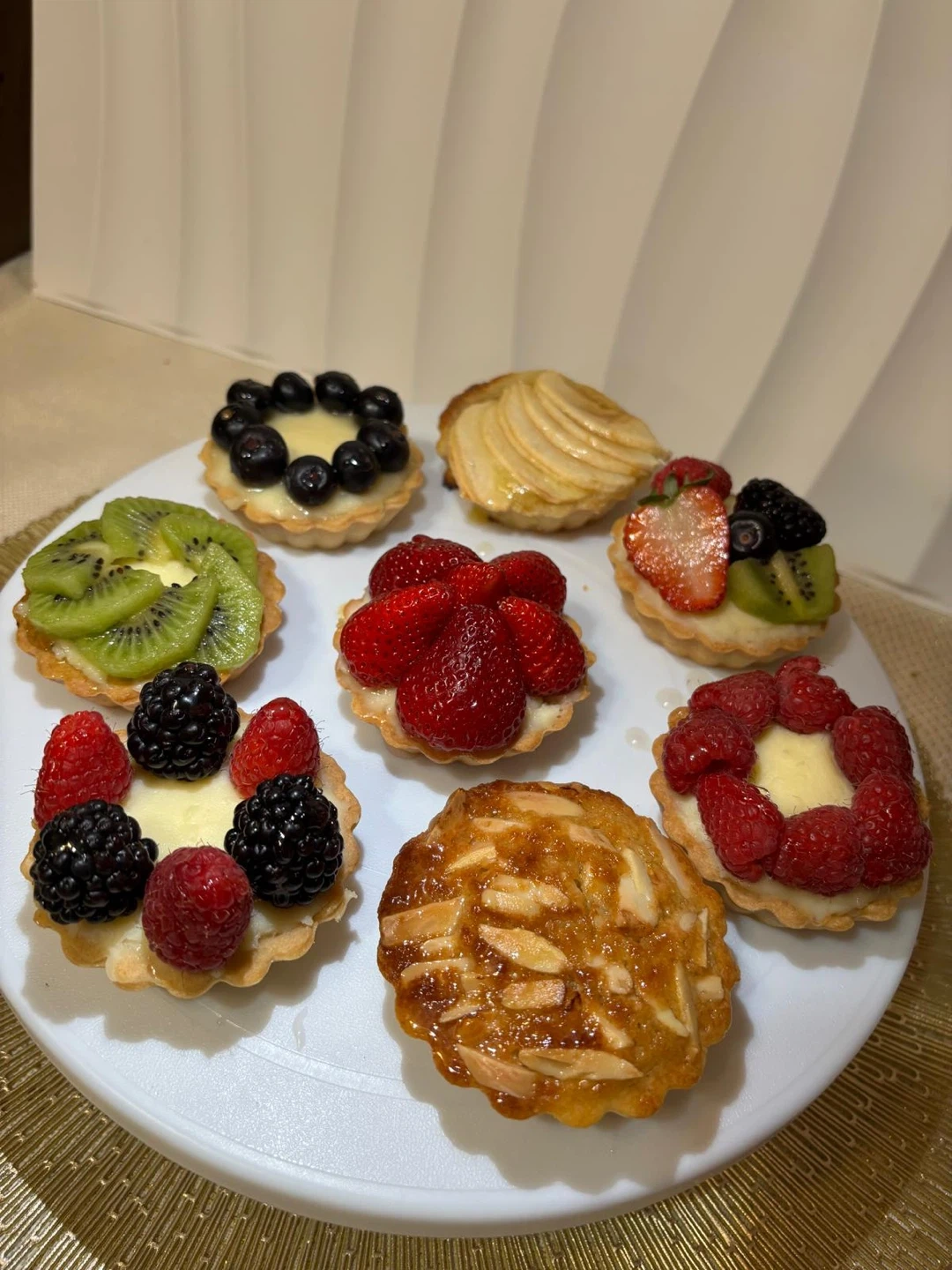 Here's a plate of 6 delicious assorted fruit tartlets! They feature a variety of fresh fruits like kiwi, blueberries, lemon,strawberries, raspberries, and blackberries we also offer almond and on top of a creamy filling and a flaky crust