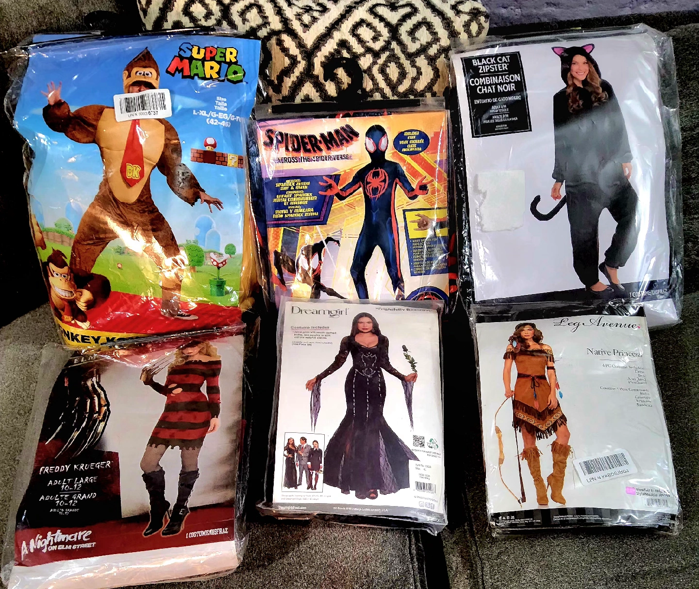 10Selling a variety of Halloween costumes! There's a Spiderman costume, a Dragon Ball Z Goku costume, a Super Mario Donkey Kong costume (L/XL, 42-46), a Black Cat Hipster costume, a Freddy Krueger costume (Adult Large, 12-14), a Dreamgirl costume, and a Leg Avenue Native Princess costume