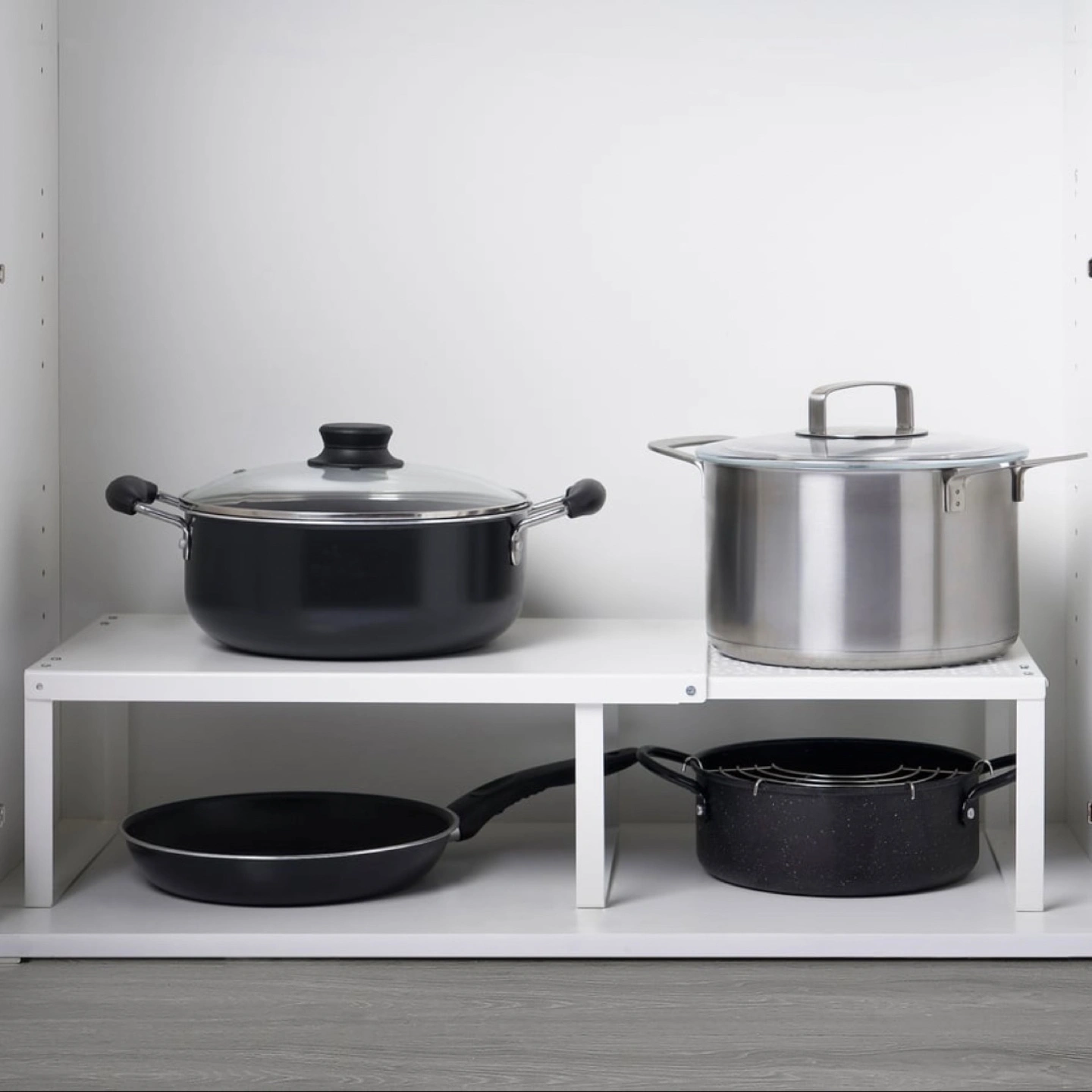 2 shelf risers and 1 basket that clips to underside of shelf. Shelf risers can be joined together to make on long riser. Despite being fully assembled, these were not used. Like new.