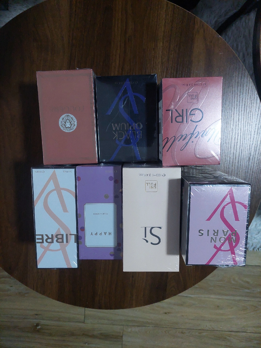 Selling a collection of assorted perfumes. Includes brands like Yves Saint Laurent (Libre, Black Opium, Mon Paris), Giorgio Armani (Si), and others (Fougere, Felicia Roses Happy, Unifull Girl). Each bottle contains 100ml / 3.4 fl.oz.